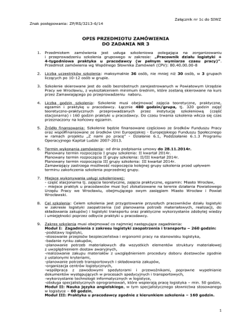 Znak postępowania: ZP/RS/3213-6/14 Załącznik nr 1c do SIWZ OPIS PRZEDMIOTU ZAMÓWIENIA DO ZADANIA NR 3 1. Przedmiotem zamówienia jest usługa szkoleniowa polegająca na zorganizowaniu i przeprowadzeniu szkolenia grupowego w zakresie: „Pracownik działu logistyki + 4-tygodniowa praktyka u pracodawcy (w pełnym wymiarze czasu pracy)”. Przedmiot zamówienia wg Wspólnego Słownika Zamówień (CPV): 80.40.00.00-8 2. Liczba uczestników szkolenia : maksymalnie 36 osób, nie mniej niż 30 osób, w 3 grupach liczących po 10-12 osób w grupie. 3. Szkolenie skierowane jest do osób bezrobotnych zarejestrowanych w Powiatowym Urzędzie Pracy we Wrocławiu, z wykształceniem minimum średnim, które zostaną skierowane na kurs przez Zamawiającego po przeprowadzeniu naboru. 4. Liczba godzin szkolenia : Szkolenie musi obejmować zajęcia teoretyczne, praktyczne, egzamin i praktykę u pracodawcy. Łącznie 480 godzin/grupa, tj. 320 godzin zajęć teoretyczno-praktycznych przeprowadzanych przez instytucję szkoleniową (część stacjonarna) i 160 godzin praktyki u pracodawcy. Do czasu trwania szkolenia wlicza się czas przeznaczony na końcowy egzamin. 5. Źródło finansowania: Szkolenie będzie finansowane częściowo ze środków Funduszu Pracy oraz współfinansowane ze środków Unii Europejskiej - Europejskiego Funduszu Społecznego w ramach projektu „Z nami po pracę” - Działanie 6.1, Poddziałanie 6.1.3 Programu Operacyjnego Kapitał Ludzki 2007-2013. 6. Termin wykonania zamówienia : od dnia podpisania umowy do 28.11.2014r. Planowany termin rozpoczęcia I grupy szkolenia: II kwartał 2014r. Planowany termin rozpoczęcia II grupy szkolenia: II/III kwartał 2014r. Planowany termin rozpoczęcia III grupy szkolenia: III kwartał 2014r. Zamawiający zastrzega możliwość rozpoczęcia kolejnej grupy szkolenia przed upływem terminu zakończenia szkolenia poprzedniej grupy. 7. Miejsce wykonywania usługi szkoleniowej: - część stacjonarna tj. zajęcia teoretyczne, zajęcia praktyczne, egzamin: Miasto Wrocław, - miejsce praktyk u pracodawców musi być zlokalizowane na terenie działania Powiatowego Urzędu Pracy we Wrocławiu, obejmującego swym zasięgiem Miasto Wrocław i Powiat Wrocławski. 8. Cel szkolenia: Celem szkolenia jest przygotowanie przyszłych pracowników działu logistyki w zakresie logistyki zaopatrzenia (od planowania potrzeb materiałowych, realizacji, do składowania zakupów) i logistyki transportu oraz praktyczne wykorzystanie zdobytej wiedzy i umiejętności poprzez odbycie praktyki u pracodawcy. 9. Zakres szkolenia musi obejmować co najmniej następujące zagadnienia: Moduł I: Zagadnienia z zakresu logistyki zaopatrzenia i transportu – 260 godzin: -podstawy logistyki, -stosowanie przepisów bezpieczeństwa i ergonomii pracy na stanowisku logistyka, -badanie rynku zakupów, -planowanie potrzeb materiałowych dla wszystkich elementów struktury materiałowej z uwzględnieniem dostaw awaryjnych, -realizowanie zakupu materiałów z uwzględnieniem procedury doboru dostawców zgodnie z ustalonymi kryteriami, -planowanie potrzeb transportowych i składowania zakupów, -organizacja centrów logistycznych, -współpraca z zawodowymi spedytorami i przewoźnikami, poprawne wypełnianie dokumentów występujących w procesach spedycyjnych i transportowych, -wykorzystanie technologii informatycznych w logistyce, -obsługa specjalistycznych oprogramowań, które wspierają pracę logistyka – min. 50 godzin, Moduł II: Nauka języka angielskiego, w tym specjalistycznego słownictwa stosowanego w logistyce – 60 godzin, Moduł III: Praktyka u pracodawcy zgodnie z kierunkiem szkolenia – 160 godzin. 1 Program szkolenia powinien wykorzystywać standardy kwalifikacji zawodowych i modułowe programy szkoleń zawodowych, dostępne w bazach danych prowadzonych przez Ministerstwo Pracy i Polityki Społecznej znajdujących się na stronie internetowej: www.standardyiszkolenia.praca.gov.pl. 10. Organizacja szkolenia: 10.1 Szkolenie należy zrealizować według planu nauczania obejmującego 40 godzin zegarowych w tygodniu. Jedną godzinę Zamawiający rozumie jako 60 minut z czego na zajęcia edukacyjne przypada 45 minut a na przerwę 15 minut, przy czym długość przerw może być ustalona w sposób elastyczny, praktyka u pracodawcy musi odbywać się w pełnym wymiarze czasu pracy tj. po 8 godzin zegarowych dziennie; 10.2 Zajęcia muszą się odbywać w godz. między 07.00 - 19.00 (praktyka może być realizowana w innych godzinach, jednak w ramach godzin pracy danego zakładu pracy, wyłączając godziny nocne)od poniedziałku do piątku (z wyłączeniem niedziel, świąt oraz dni ustawowo wolnych od pracy), w kolejno następujących po sobie dniach, liczba godzin dziennie nie może przekroczyć 8. W wyjątkowych sytuacjach dopuszczalne jest przeprowadzenie zajęć w soboty. Praktyka u pracodawcy musi rozpocząć się w pierwszym dniu roboczym po zakończeniu zajęć teoretyczno-praktycznych odbywających się w instytucji szkoleniowej; 10.3 Wykonawca przygotuje program szkolenia zawierający zakres, o którym mowa w pkt. 9. Egzamin końcowy musi być integralną częścią programu oraz wchodzić w skład ilości godzin przewidzianych programem. Egzamin końcowy musi być ujęty w Programie szkolenia w pozycji Plan nauczania z uwzględnieniem ilości godzin przewidzianych na ten egzamin oraz w harmonogramie szkolenia z uwzględnieniem daty przeprowadzenia tego egzaminu i ilości godzin przewidzianych na egzamin; 10.4 Wykonawca wyznaczy osobę odpowiedzialną za organizację szkolenia, kontakty z uczestnikami szkolenia oraz z Zamawiającym; 10.5 Wszystkie zajęcia muszą być przeprowadzone osobiście przez kadrę dydaktyczną wskazaną w ofercie. Nie dopuszcza się prowadzenia zajęć drogą elektroniczną, metodą e-learningu, w formie eksternistycznej itp.; 10.6 Zajęcia muszą się odbywać w salach przystosowanych do przeprowadzenia zajęć teoretycznych i praktyczn