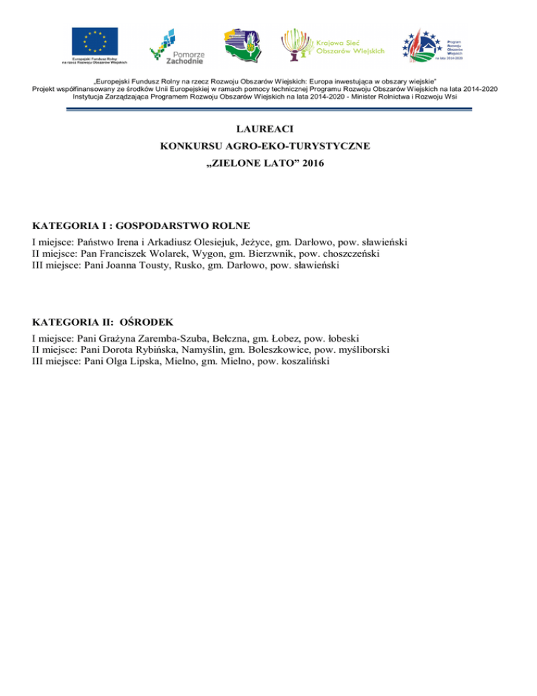 „Europejski Fundusz Rolny na rzecz Rozwoju Obszarów Wiejskich: Europa inwestuj ca w obszary wiejskie” Projekt wspó finansowany ze rodków Unii Europejskiej w ramach pomocy technicznej Programu Rozwoju Obszarów Wiejskich na lata 2014-2020 Instytucja Zarz dzaj ca Programem Rozwoju Obszarów Wiejskich na lata 2014-2020 - Minister Rolnictwa i Rozwoju Wsi LAUREACI KONKURSU AGRO-EKO-TURYSTYCZNE „ZIELONE LATO” 2016 KATEGORIA I : GOSPODARSTWO ROLNE I miejsce: Pa stwo Irena i Arkadiusz Olesiejuk, Je yce, gm. Dar owo, pow. s awie ski II miejsce: Pan Franciszek Wolarek, Wygon, gm. Bierzwnik, pow. choszcze ski III miejsce: Pani Joanna Tousty, Rusko, gm. Dar owo, pow. s awie ski KATEGORIA II: O RODEK I miejsce: Pani Gra yna Zaremba-Szuba, Be czna, gm. obez, pow. obeski II miejsce: Pani Dorota Rybi ska, Namy lin, gm. Boleszkowice, pow. my liborski III miejsce: Pani Olga Lipska, Mielno, gm. Mielno, pow. koszali ski