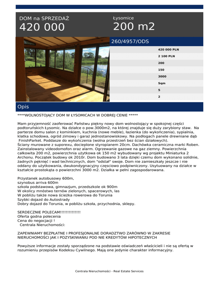 Łysomice DOM na SPRZEDAŻ 200 m2 420 000 260/4957/ODS 420 000 PLN 2 100 PLN 200 150 3000 Sqm 5 2 Opis ****WOLNOSTOJĄCY DOM W ŁYSOMICACH W DOBREJ CENIE ***** Mam przyjemność zaoferować Państwu piękny nowy dom wolnostojący w spokojnej części podtoruńskich Łysomic. Na działce o pow.3000m2, na której znajduje się duży zarybiony staw. Na parterze domu salon z kominkiem, kuchnia (nowe meble), łazienka (do wykończenia), sypialnia, klatka schodowa, ogród zimowy i garaż jednostanowiskowy. Na podłogach panele drewniane dąb FinishParket. Poddasze do wykończenia (wolna przestrzeń bez ścian działowych). Ściany murowane z suporexu, docieplone styropianem 20cm. Dachówka ceramiczna marki Roben. Zainstalowany videodomofon oraz alarm. Ogrzewanie gazowe na gaz ziemny. Powierzchnia całkowita 200 m2, powierzchnia użytkowa ok 150 m2 wybudowany wg projektu Miniaturka 2 Archonu. Początek budowy ok 2010r. Dom budowano 3 lata dzięki czemu dom wykonano solidnie, żadnych pęknięć i wad technicznych, dom "odstał" swoje. Dom nie zamieszkały jeszcze i nie oddany do użytkowania, dwukondygnacyjny częsciowo podpiwniczony. Usytuowany na działce w kształcie prostokąta o powierzchni 3000 m2. Działka w pełni zagospodarowana. Przystanek autobusowy 600m, szynobus arriva 600m szkoła podstawowa, gimnazjum, przedszkole ok 900m W okolicy mnóstwo ternów zielonych, spacerowych, las W pobliżu także nowa ścieżka rowerowa do Torunia Szybki dojazd do Autostrady Dobry dojazd do Torunia, w pobliżu szkoła, przychodnia, sklepy. SERDECZNIE POLECAM!!!!!!!!!!!!!! Oferta godna polecenia Cena do negocjacji ! Centrala Nieruchomości: ZAPEWNIAMY BEZPŁATNE I PROFESJONALNE DORADZTWO ZARÓWNO W ZAKRESIE NIERUCHOMOŚCI JAK I POZYSKIWANIU POD NIE KREDYTÓW HIPOTECZNYCH Powyższe informacje zostały sporządzone na podstawie oświadczeń właścicieli i nie są ofertą w rozumieniu przepisów Kodeksu Cywilnego. Mają one jedynie charakter informacyjny. Centrala Nieruchomości - Real Estate Services Większość naszych klientów pochodzi z polecenia - ZAUFAJ NAM I TY I NIE CZEKAJ, AŻ KTOŚ CIĘ WYPRZEDZI! Zadzwoń i umów się na prezentację ! Nr licencji pośrednika odpowiedzialnego za wykonanie umowy pośrednictwa 14260. zobacz inne nasze oferty na www.centralanieruchomosci.pl facebook.com/Centrala.N Karolina Rutkowska tel. (+48) 663 899 715 email: [email protected] Centrala Nieruchomości - Real Estate Services Powered by TCPDF (www.tcpdf.org)