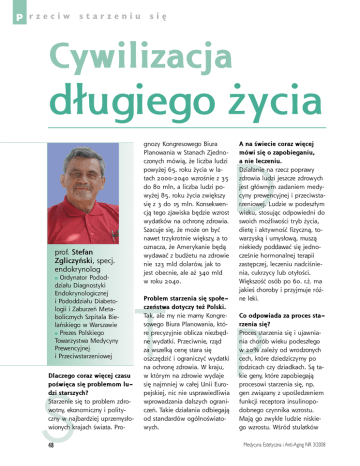 p rzeciw starzeniu si´ Cywilizacja długiego życia prof. Stefan Zgliczyński, specj. endokrynolog Ordynator Pododdziału Diagnostyki Endokrynologicznej i Pododdziału Diabetologii i Zaburzeń Metabolicznych Szpitala Bielańskiego w Warszawie ■ Prezes Polskiego Towarzystwa Medycyny Prewencyjnej i Przeciwstarzeniowej ■ Dlaczego coraz więcej czasu poświęca się problemom ludzi starszych? Starzenie się to problem zdrowotny, ekonomiczny i polityczny w najbardziej uprzemysłowionych krajach świata. Pro- S 48 gnozy Kongresowego Biura Planowania w Stanach Zjednoczonych mówią, że liczba ludzi powyżej 65. roku życia w latach 2000-2040 wzrośnie z 35 do 80 mln, a liczba ludzi powyżej 85. roku życia zwiększy się z 3 do 15 mln. Konsekwencją tego zjawiska będzie wzrost wydatków na ochronę zdrowia. Szacuje się, że może on być nawet trzykrotnie większy, a to oznacza, że Amerykanie będą wydawać z budżetu na zdrowie nie 123 mld dolarów, jak to jest obecnie, ale aż 340 mld w roku 2040. Problem starzenia się społeczeństwa dotyczy też Polski. Tak, ale my nie mamy Kongresowego Biura Planowania, które precyzyjnie oblicza niezbędne wydatki. Przeciwnie, rząd za wszelką cenę stara się oszczędzić i ograniczyć wydatki na ochronę zdrowia. W kraju, w którym na zdrowie wydaje się najmniej w całej Unii Europejskiej, nic nie usprawiedliwia wprowadzania dalszych ograniczeń. Takie działania odbiegają od standardów ogólnoświatowych. T A na świecie coraz więcej mówi się o zapobieganiu, a nie leczeniu. Działanie na rzecz poprawy zdrowia ludzi jeszcze zdrowych jest głównym zadaniem medycyny prewencyjnej i przeciwstarzeniowej. Ludzie w podeszłym wieku, stosując odpowiedni do swoich możliwości tryb życia, dietę i aktywność fizyczną, towarzyską i umysłową, muszą niekiedy poddawać się jednocześnie hormonalnej terapii zastępczej, leczeniu nadciśnienia, cukrzycy lub otyłości. Większość osób po 60. r.ż. ma jakieś choroby i przyjmuje różne leki. D Co odpowiada za proces starzenia się? Proces starzenia się i ujawniania chorób wieku podeszłego w 20% zależy od wrodzonych cech, które dziedziczymy po rodzicach czy dziadkach. Są takie geny, które zapobiegają procesowi starzenia się, np. gen związany z upośledzeniem funkcji receptora insulinopodobnego czynnika wzrostu. Mają go zwykle ludzie niskiego wzrostu. Wśród stulatków P Medycyna Estetyczna i Anti-Aging NR 3/2008 przeciw starzeniu si ´ spory procent charakteryzuje się występowaniem upośledzenia funkcji tego receptora. To oznacza, że taka cecha genetyczna sprzyja wydłużeniu życia. Innym elementem genetycznym jest niewystępowanie zmian, które sprzyjają zawałowi serca, udarowi mózgu, nadciśnieniu tętniczemu, ujawnianiu się choroby Alzheimera. Życie skraca natomiast rodzinna skłonność do występowania nowotworów. Tak więc długość życia i jego jakość zależą w pewnym stopniu od dziedziczonych cech, które przeciwstawiają się procesowi starzenia, a w pewnym stopniu od cech, które zapobiegają występowaniu chorób wieku podeszłego. Jednak w 80 procentach wpływ na nie ma nasz sposób życia – odżywianie się, aktywność fizyczna i psychiczna. Czy nasza dieta powinna być niskokaloryczna? Głód powinno się zaspakajać tylko w 50%. Należy unikać tłuszczów i nadmiaru mięsa, cukru, soli i pokarmów wysokokalorycznych. Zamiast tego należy jeść tłuste, morskie ryby, takie jak łosoś, makrela i halibut. Zawierają one dużo kwasów nienasyconych omega i w pewnym sensie zapobiegają występowaniu zmian, które przyczyniają się do skrócenia życia. Jednak głównym składnikiem naszego pożywienia powinny być pokarmy roślinne – warzywa i owoce. Dieta G Medycyna Estetyczna i Anti-Aging NR 3/2008 z niewielką ilością mięsa, głównie drobiu, jest szczególnie zalecana. Powinniśmy natomiast wystrzegać się wędlin i tłustego mięsa. Potwierdzają to np. obserwacje: w Stanach Zjednoczonych najdłużej żyją Amisze, którzy ze względów religijnych zachowują dietę wegetariańską i dużo czasu spędzają pracując na świeżym powietrzu. Bo ważne jest, aby ludzie w podeszłym wieku byli czynni fizycznie i umysłowo. Mówiąc o aktywności fizycznej, myślę też o uprawianiu sportu, pracach w ogródku i o długich spacerach. Te wszystkie czynniki sprzyjają długowieczności. A czym zajmuje się medycyna przeciwstarzeniowa? Medycyna prewencyjna i przeciwstarzeniowa jest nową specjalnością lekarską, która wychodzi naprzeciw oczekiwaniom społeczeństwa XXI wieku, w którym coraz większy odsetek będą stanowić ludzie po 65 roku życia. Celem jej jest działanie na rzecz poprawy stanu zdrowia – młodych i zdrowych, którzy gromadzą już w życiu płodowym i w dzieciństwie kapitał, jakim organizm rozporządza w wieku późniejszym. Prawidłowa waga urodzeniowa i przeciwdziałanie otyłości w dzieciństwie zmniejszają prawdopodobieństwo wystąpienia cukrzycy, otyłości lub miażdżycy tętnic wieńcowych w wieku dojrzałym. Z kolei odpowiedni sposób odży- M wiania, ograniczenie kalorii, spożywanie dużych ilości jarzyn i owoców, ruch na świeżym powietrzu oraz aktywność fizyczna i intelektualna, a także pogodne i przyjazne nastawienie do ludzi i otaczającego świata sprzyjają zachowaniu zdrowia i dobrego samopoczucia. Nie bez znaczenia jest też uzupełnianie niedoborów witamin i hormonów. Czy dotyczy to też zastępczej terapii hormonalnej? Medycynę prewencyjną, czyli zapobieganie miażdżycy tętnic, zawałom serca, udarom mózgu, nowotworom, osteoporozie i złamaniom kości, które skracają życie osób w podeszłym wieku, należy łączyć z medycyną przeciwstarzeniową, a więc z uzupełnianiem niedoborów hormonalnych. U kobiet po 50 r.ż. jest to hormonalne leczenie zastępcze, a u mężczyzn – podawanie testosteronu. Właściwie monitorowane stosowanie odpowiednich hormonów nie przynosi niepo