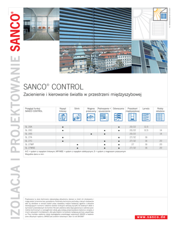 TA WERBEAGENTUR 09/2007 IZOLACJA I PROJEKTOWANIE SANCO ® SANCO CONTROL ® Zacienienie i kierowanie światła w przestrzeni międzyszybowej Przegląd funkcji SANCO CONTROL SL 20A SL 20C SL 20S SL 27A SL 27C SL 27MP SL 27MSE Napęd linkowy Silnik Magnes Podnoszenie + Odwracanie Przestrzeń przesuwny opuszczanie międzyszybowa ■ ■ ■ ■ ■ ■ ■ ■ ■ ■ ■ ■ ■ ■ ■ ■ ■ ■ 20/22 20/22 20/22 27/32 27/32 27 27/32 Lamela 12,5 12,5 16 16 16 16 Rolety składane 14 14 20 20 20 A/C = system z napędem linkowym, MP/MSE = system z napędem elektrycznym, S = system z magnesem przesuwnym Wszystkie dane w mm Przytoczone tu dane techniczne odpowiadają aktualnemu stanowi w chwili ich drukowania i mogą zostać zmienione bez uprzedzenia. Parametry techniczne pochodzą z danych dostawców albo są określane w ramach badań przez niezależny instytut badawczy zgodnie z aktualnie obowiązującymi normami. Ustalone wartości funkcyjne odnoszą się tylko do badanych detali o wymiarach przewidzianych do kontroli. Nie jest udzielana dalej idąca gwarancja w zakresie parametrów technicznych, w szczególności wtedy, gdy zostają przeprowadzane badania w związku z innymi sytuacjami montażowymi, albo gdy dopiero na budowie następują pomiary uzupełniające. Przy montażu oszklenia należy bezwzględnie przestrzegać wytycznych SANCO w każdorazowo aktualnym wydaniu. SANCO jest znakiem towarowym. Stan na rok 09/2007 w w w. s a n c o . d e