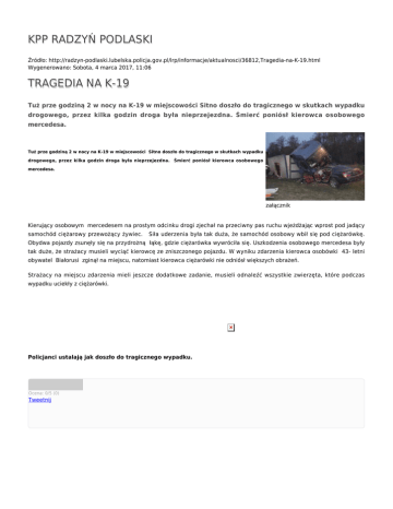 KPP RADZYŃ PODLASKI Źródło: http://radzyn-podlaski.lubelska.policja.gov.pl/lrp/informacje/aktualnosci/36812,Tragedia-na-K-19.html Wygenerowano: Sobota, 4 marca 2017, 11:06 TRAGEDIA NA K-19 Tuż prze godziną 2 w nocy na K-19 w miejscowości Sitno doszło do tragicznego w skutkach wypadku drogowego, przez kilka godzin droga była nieprzejezdna. Śmierć poniósł kierowca osobowego mercedesa. Tuż prze godziną 2 w nocy na K-19 w miejscowości Sitno doszło do tragicznego w skutkach wypadku drogowego, przez kilka godzin droga była nieprzejezdna. Śmierć poniósł kierowca osobowego mercedesa. . . załącznik Kierujący osobowym mercedesem na prostym odcinku drogi zjechał na przeciwny pas ruchu wjeżdżając wprost pod jadący samochód ciężarowy przewożący żywiec. Siła uderzenia była tak duża, że samochód osobowy wbił się pod ciężarówkę. Obydwa pojazdy zsunęły się na przydrożną łąkę, gdzie ciężarówka wywróciła się. Uszkodzenia osobowego mercedesa były tak duże, że strażacy musieli wyciąć kierowcę ze zniszczonego pojazdu. W wyniku zdarzenia kierowca osobówki 43- letni obywatel Białorusi zginął na miejscu, natomiast kierowca ciężarówki nie odniósł większych obrażeń. Strażacy na miejscu zdarzenia mieli jeszcze dodatkowe zadanie, musieli odnaleźć wszystkie zwierzęta, które podczas wypadku uciekły z ciężarówki. . . Policjanci ustalają jak doszło do tragicznego wypadku. Ocena: 0/5 (0) Tweetnij
