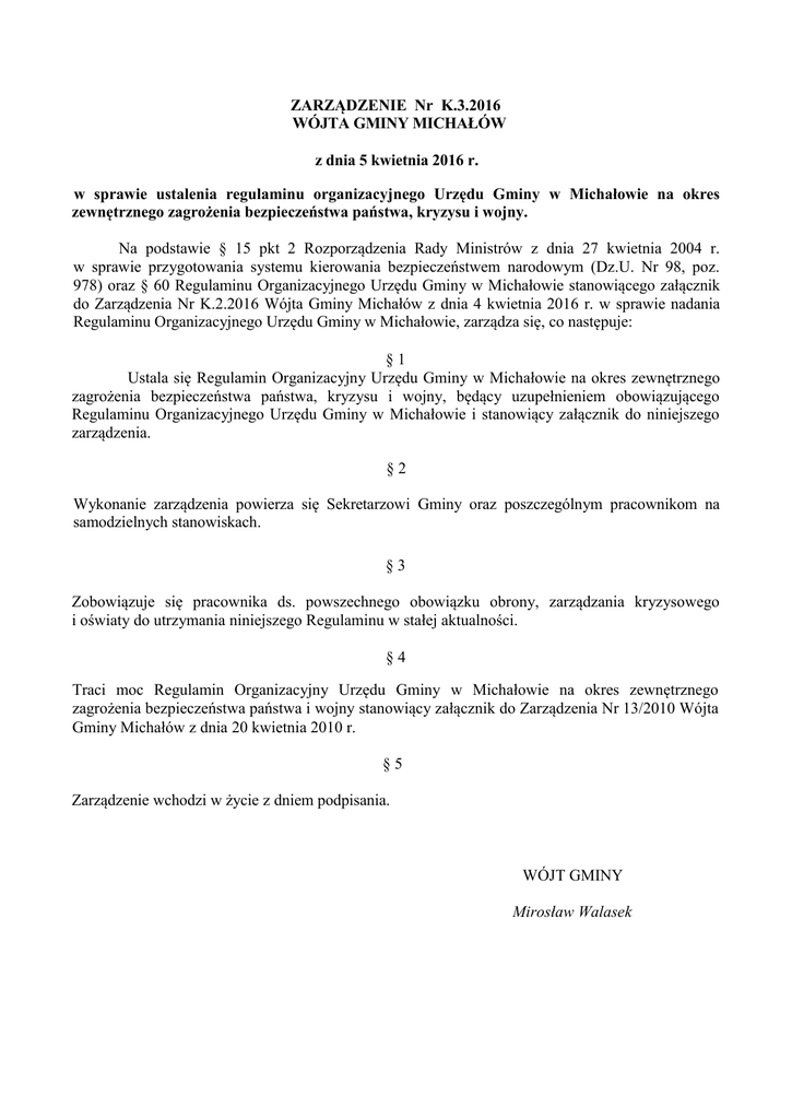 ZARZĄDZENIE Nr K.3.2016 WÓJTA GMINY MICHAŁÓW z dnia 5 kwietnia 2016 r. w sprawie ustalenia regulaminu organizacyjnego Urzędu Gminy w Michałowie na okres zewnętrznego zagrożenia bezpieczeństwa państwa, kryzysu i wojny. Na podstawie § 15 pkt 2 Rozporządzenia Rady Ministrów z dnia 27 kwietnia 2004 r. w sprawie przygotowania systemu kierowania bezpieczeństwem narodowym (Dz.U. Nr 98, poz. 978) oraz § 60 Regulaminu Organizacyjnego Urzędu Gminy w Michałowie stanowiącego załącznik do Zarządzenia Nr K.2.2016 Wójta Gminy Michałów z dnia 4 kwietnia 2016 r. w sprawie nadania Regulaminu Organizacyjnego Urzędu Gminy w Michałowie, zarządza się, co następuje: §1 Ustala się Regulamin Organizacyjny Urzędu Gminy w Michałowie na okres zewnętrznego zagrożenia bezpieczeństwa państwa, kryzysu i wojny, będący uzupełnieniem obowiązującego Regulaminu Organizacyjnego Urzędu Gminy w Michałowie i stanowiący załącznik do niniejszego zarządzenia. §2 Wykonanie zarządzenia powierza się Sekretarzowi Gminy oraz poszczególnym pracownikom na samodzielnych stanowiskach. §3 Zobowiązuje się pracownika ds. powszechnego obowiązku obrony, zarządzania kryzysowego i oświaty do utrzymania niniejszego Regulaminu w stałej aktualności. §4 Traci moc Regulamin Organizacyjny Urzędu Gminy w Michałowie na okres zewnętrznego zagrożenia bezpieczeństwa państwa i wojny stanowiący załącznik do Zarządzenia Nr 13/2010 Wójta Gminy Michałów z dnia 20 kwietnia 2010 r. §5 Zarządzenie wchodzi w życie z dniem podpisania. WÓJT GMINY Mirosław Walasek Załącznik do Zarządzenia Nr K.3.2016 Wójta Gminy Michałów z dnia 5 kwietnia 2016 r. URZĄD GMINY W MICHAŁOWIE REGULAMIN ORGANIZACYJNY URZĘDU GMINY W MICHAŁOWIE NA OKRES ZEWNĘTRZNEGO ZAGROŻENIA BEZPIECZEŃSTWA PAŃSTWA I WOJNY MICHAŁÓW 2016 R. CZĘŚĆ PIERWSZA POSTANOWIENIA OGÓLNE ROZDZIAŁ I ZASADY FUNKCJONOWANIA URZĘDU §1 1. Niniejszy regulamin określa i precyzuje zadania Urzędu Gminy w Michałowie realizowane w okresie zewnętrznego zagrożenia bezpieczeństwa państwa, kryzysu i w czasie wojny. 2. Niniejszy regulamin nie narusza postanowień obowiązującego Regulaminu Organizacyjnego Urzędu Gminy w Michałowie, jest natomiast jego rozwinięciem i uzupełnieniem o zadania realizowane w czasie kryzysu, zewnętrznego zagrożenia bezpieczeństwa państwa i w czasie wojny, wynikające z obowiązujących przepisów prawa i opracowanych dokumentów obronnych. §2 Zadaniem Urzędu Gminy w Michałowie zwanego dalej „Urzędem” jest zapewnienie na wypadek kryzysu, zewnętrznego zagrożenia bezpieczeństwa państwa i w czasie wojny, warunków realizacji zadań w zakresie bezpieczeństwa i obronności powierzonych Wójtowi Gminy jako organowi administracji samorządowej zgodnie z obowiązującymi przepisami prawnymi i decyzjami nadrzędnych organów władzy z uwzględnieniem postanowień zawartych w Części I, Rozdział I §§ 1-8 obowiązującego Regulaminu Organizacyjnego Urzędu Gminy w Michałowie. §3 W przypadku wprowadzenia stanu wyjątkowego, urząd działa na zasadach określonych w ustawie z dnia 21 czerwca 2002 r. o stanie wyjątkowym (t.j. Dz. U. z 2014 r., poz.1191 z późn. zmianami) i przepisów wykonawczych wydanych na jej podstawie. §4 W przypadku wprowadzenia stanu wojennego urząd działa na zasadach określonych w ustawie z dnia 29 sierpnia 2002 r. o stanie wojennym oraz kompetencjach Naczelnego Dowódcy Sił Zbrojnych i zasadach jego podległości konstytucyjnym organom Rzeczpospolitej Polskiej (t.j Dz. U. z 2014 r., poz. 1815 z późn. zmianami) i przepisów wykonawczych wydanych na jej podstawie. §5 W przypadku wystąpienia sytuacji kryzysowej urząd działa na zasadach określonych w ustawie z dnia 26 kwietnia 2007 r. o zarządzaniu kryzysowym (tj. Dz. U. z 2013 r. poz. 1166 z późn. zmianami) oraz innych obowiązujących przepisach prawa w tym zakresie. ROZDZIAŁ II ZASADY KIEROWANIA PRACĄ URZĘDU §6 Pracą urzędu kieruje Wójt zgodnie z zasadami ustalonymi w Rozdziale II obowiązującego Regulaminu Organizacyjnego Urzędu Gminy w Michałowie, z uwzględnieniem przepisów prawa wynikających z : 1) ustawy z dnia 21 czerwca 2002 r. o stanie wyjątkowym (t.j. Dz. U. z 2014 r., poz.1191 z późn. zmianami), 2) ustawy z dnia 29 sierpnia 2002 r. o stanie wojennym oraz kompetencjach Naczelnego Dowódcy Sił Zbrojnych i zasadach jego podległości konstytucyjnym organom Rzeczpospolitej Polskiej (t.j. Dz. U. z 2014 r., poz. 1815 z późn. zmianami), 3) w ustawie z dnia 26 kwietnia 2007 r. o zarządzaniu kryzysowym (tj. Dz. U. z 2013 r. poz. 1166 z późn. zmianami), 4) przepisów wykonawczych do w/w ustaw; 5) niniejszego regulaminu. §7 1. W czasie kryzysu, zewnętrznego zagrożenia bezpieczeństwa państwa i wojny kierowanie urzędem realizowane jest zgodnie z ustaleniami wynikającymi z „Planu operacyjnego funkcjonowania gminy Michałów w warunkach zewnętrznego zagrożenia bezpieczeństwa państwa i wojny” w trybie i na zasadach ujętych w „Instrukcji Stanowiska Kierowania Wójta Gminy Michałów”. 2. Przebieg procesu kierowania urzędem, szczegółowe zadania samodzielnych stanowisk oraz zespołów funkcjonalnych, a także zasady i tryb podejmowania decyzji w zakresie realizacji zadań obronnych odbywa się zgodnie z ustaleniami zawartymi w „Instrukcji Stanowiska Kierowania Wójta Gminy Michałów”. §8 Wójt ponosi osobistą odpowiedzialność, zgodnie z zasadą jednoosobowego kierowania za osiąganie (wygaszanie) wyższych stanów gotowości obronnej oraz za koordynowanie i nadzorowanie wykonywania zadań obronnych, zarządzania kryzysowego i obrony cywilnej realizowanych przez gminę i podległe jednostki organizacyjne. §9 1. Wójt kierując pracą urzędu zapewnia warunki do sprawnej realizacji zadań przez cały układ pozamilitarny gminy z zakresu bezpieczeństwa i obronności, zarządzania kryzysowego oraz obrony cywilnej, a w szczególności: 1) kieruje osiąganiem (w