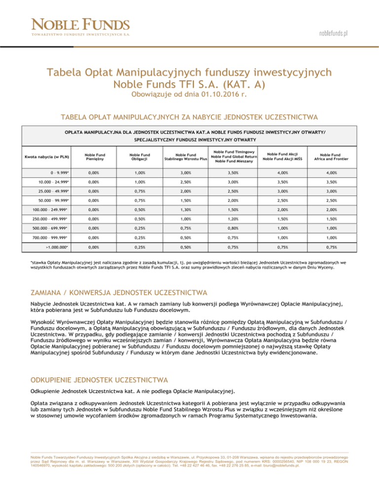Tabela Opłat Manipulacyjnych funduszy inwestycyjnych Noble Funds TFI S.A. (KAT. A) Obowiązuje od dnia 01.10.2016 r. TABELA OPŁAT MANIPULACYJNYCH ZA NABYCIE JEDNOSTEK UCZESTNICTWA OPŁATA MANIPULACYJNA DLA JEDNOSTEK UCZESTNICTWA KAT.A NOBLE FUNDS FUNDUSZ INWESTYCYJNY OTWARTY/ SPECJALISTYCZNY FUNDUSZ INWESTYCYJNY OTWARTY Kwota nabycia (w PLN) Noble Fund Pieniężny Noble Fund Obligacji Noble Fund Stabilnego Wzrostu Plus Noble Fund Timingowy Noble Fund Global Return Noble Fund Mieszany Noble Fund Akcji Noble Fund Akcji MIŚS Noble Fund Africa and Frontier 0 – 9.999* 0,00% 1,00% 3,00% 3,50% 4,00% 4,00% 10.000 – 24.999* 0,00% 1,00% 2,50% 3,00% 3,50% 3,50% 25.000 – 49.999* 0,00% 0,75% 2,00% 2,50% 3,00% 3,00% 50.000 – 99.999* 0,00% 0,75% 1,50% 2,00% 2,50% 2,50% 100.000 – 249.999* 0,00% 0,50% 1,30% 1,50% 2,00% 2,00% 250.000 – 499.999* 0,00% 0,50% 1,00% 1,20% 1,50% 1,50% 500.000 – 699.999* 0,00% 0,25% 0,75% 0,80% 1,00% 1,00% 700.000 – 999.999* 0,00% 0,25% 0,50% 0,75% 1,00% 1,00% >1.000.000* 0,00% 0,25% 0,50% 0,75% 0,75% 0,75% *stawka Opłaty Manipulacyjnej jest naliczana zgodnie z zasadą kumulacji, tj. po uwzględnieniu wartości bieżącej Jednostek Uczestnictwa zgromadzonych we wszystkich funduszach otwartych zarządzanych przez Noble Funds TFI S.A. oraz sumy prawidłowych zleceń nabycia rozliczanych w danym Dniu Wyceny. ZAMIANA / KONWERSJA JEDNOSTEK UCZESTNICTWA Nabycie Jednostek Uczestnictwa kat. A w ramach zamiany lub konwersji podlega Wyrównawczej Opłacie Manipulacyjnej, która pobierana jest w Subfunduszu lub Funduszu docelowym. Wysokość Wyrównawczej Opłaty Manipulacyjnej będzie stanowiła różnicę pomiędzy Opłatą Manipulacyjną w Subfunduszu / Funduszu docelowym, a Opłatą Manipulacyjną obowiązującą w Subfunduszu / Funduszu źródłowym, dla danych Jednostek Uczestnictwa. W przypadku, gdy podlegające zamianie / konwersji Jednostki Uczestnictwa pochodzą z Subfunduszu / Funduszu źródłowego w wyniku wcześniejszych zamian / konwersji, Wyrównawcza Opłata Manipulacyjna będzie równa Opłacie Manipulacyjnej pobieranej w Subfunduszu / Funduszu docelowym pomniejszonej o najwyższą stawkę Opłaty Manipulacyjnej spośród Subfunduszy / Funduszy w którym dane Jednostki Uczestnictwa były ewidencjonowane. ODKUPIENIE JEDNOSTEK UCZESTNICTWA Odkupienie Jednostek Uczestnictwa kat. A nie podlega Opłacie Manipulacyjnej. Opłata związana z odkupywaniem Jednostek Uczestnictwa kategorii A pobierana jest wyłącznie w przypadku odkupywania lub zamiany tych Jednostek w Subfunduszu Noble Fund Stabilnego Wzrostu Plus w związku z wcześniejszym niż określone w stosownej umowie wycofaniem środków zgromadzonych w ramach Programu Systematycznego Inwestowania. Noble Funds Towarzystwo Funduszy Inwestycyjnych Spółka Akcyjna z siedzibą w Warszawie, ul. Przyokopowa 33, 01-208 Warszawa, wpisana do rejestru przedsiębiorców prowadzonego przez Sąd Rejonowy dla m. st. Warszawy w Warszawie, XIII Wydział Gospodarczy Krajowego Rejestru Sądowego, pod numerem KRS: 0000256540, NIP 108 000 19 23, REGON 140546970, wysokość kapitału zakładowego: 500 200 złotych (opłacony w całości). Tel. +48 22 427 46 46, fax. +48 22 276 25 85, e-mail: [email protected].