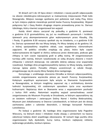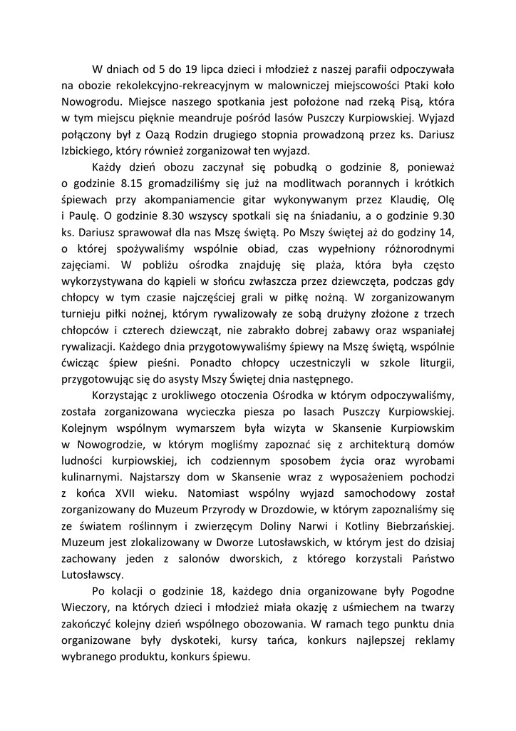 W dniach od 5 do 19 lipca dzieci i młodzież z naszej parafii odpoczywała na obozie rekolekcyjno-rekreacyjnym w malowniczej miejscowości Ptaki koło Nowogrodu. Miejsce naszego spotkania jest położone nad rzeką Pisą, która w tym miejscu pięknie meandruje pośród lasów Puszczy Kurpiowskiej. Wyjazd połączony był z Oazą Rodzin drugiego stopnia prowadzoną przez ks. Dariusz Izbickiego, który również zorganizował ten wyjazd. Każdy dzień obozu zaczynał się pobudką o godzinie 8, ponieważ o godzinie 8.15 gromadziliśmy się już na modlitwach porannych i krótkich śpiewach przy akompaniamencie gitar wykonywanym przez Klaudię, Olę i Paulę. O godzinie 8.30 wszyscy spotkali się na śniadaniu, a o godzinie 9.30 ks. Dariusz sprawował dla nas Mszę świętą. Po Mszy świętej aż do godziny 14, o której spożywaliśmy wspólnie obiad, czas wypełniony różnorodnymi zajęciami. W pobliżu ośrodka znajduję się plaża, która była często wykorzystywana do kąpieli w słońcu zwłaszcza przez dziewczęta, podczas gdy chłopcy w tym czasie najczęściej grali w piłkę nożną. W zorganizowanym turnieju piłki nożnej, którym rywalizowały ze sobą drużyny złożone z trzech chłopców i czterech dziewcząt, nie zabrakło dobrej zabawy oraz wspaniałej rywalizacji. Każdego dnia przygotowywaliśmy śpiewy na Mszę świętą, wspólnie ćwicząc śpiew pieśni. Ponadto chłopcy uczestniczyli w szkole liturgii, przygotowując się do asysty Mszy Świętej dnia następnego. Korzystając z urokliwego otoczenia Ośrodka w którym odpoczywaliśmy, została zorganizowana wycieczka piesza po lasach Puszczy Kurpiowskiej. Kolejnym wspólnym wymarszem była wizyta w Skansenie Kurpiowskim w Nowogrodzie, w którym mogliśmy zapoznać się z architekturą domów ludności kurpiowskiej, ich codziennym sposobem życia oraz wyrobami kulinarnymi. Najstarszy dom w Skansenie wraz z wyposażeniem pochodzi z końca XVII wieku. Natomiast wspólny wyjazd samochodowy został zorganizowany do Muzeum Przyrody w Drozdowie, w którym zapoznaliśmy się ze światem roślinnym i zwierzęcym Doliny Narwi i Kotliny Biebrzańskiej. Muzeum jest zlokalizowany w Dworze Lutosławskich, w którym jest do dzisiaj zachowany jeden z salonów dworskich, z którego korzystali Państwo Lutosławscy. Po kolacji o godzinie 18, każdego dnia organizowane były Pogodne Wieczory, na których dzieci i młodzież miała okazję z uśmiechem na twarzy zakończyć kolejny dzień wspólnego obozowania. W ramach tego punktu dnia organizowane były dyskoteki, kursy tańca, konkurs najlepszej reklamy wybranego produktu, konkurs śpiewu.