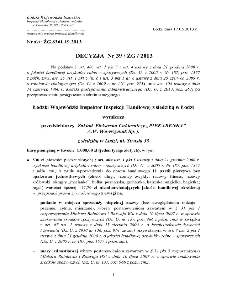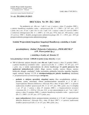 Łódzki Wojewódzki Inspektor Inspekcji Handlowej z siedzibą w Łodzi ul. Gdańska 38, 90 – 730 Łódź Łódź, dnia 17.05.2013 r. ..................................................... (oznaczenie organu Inspekcji Handlowej) Nr akt: ŻG.8361.19.2013 DECYZJA Nr 39 / ŻG / 2013 Na podstawie art. 40a ust. 1 pkt 3 i ust. 4 ustawy z dnia 21 grudnia 2000 r. o jakości handlowej artykułów rolno – spożywczych (Dz. U. z 2005 r. Nr 187, poz. 1577 z późn. zm.), art. 25 ust. 1 pkt 5 lit. b i ust. 3 pkt 1 lit. c ustawy z dnia 25 czerwca 2009 r. o rolnictwie ekologicznym (Dz. U. z 2009 r. nr 116, poz. 975), oraz art. 104 ustawy z dnia 14 czerwca 1960 r. Kodeks postępowania administracyjnego (Dz. U. z 2013, poz. 267) po przeprowadzeniu postępowania administracyjnego Łódzki Wojewódzki Inspektor Inspekcji Handlowej z siedzibą w Łodzi wymierza przedsiębiorcy Zakład Piekarsko Cukierniczy „PIEKARENKA” A.W. Wawrzyniak Sp. j. z siedzibą w Łodzi, ul. Strusia 33 karę pieniężną w kwocie 1.000,00 zł (jeden tysiąc złotych), w tym: 500 zł (słownie: pięćset złotych) z art. 40a ust. 1 pkt 3 ustawy z dnia 21 grudnia 2000 r. o jakości handlowej artykułów rolno – spożywczych (Dz. U. z 2005 r. Nr 187, poz. 1577 z późn. zm.) z tytułu wprowadzenia do obrotu handlowego 11 partii pieczywa bez opakowań jednostkowych (chleb: długi, razowy zwykły, razowy fitness, razowy królewski, okrągły „maślanka”; bułka: poznańska, grahamka, kajzerka, angielka, bagietka; rogal) wartości łącznej 117,70 zł nieodpowiadających jakości handlowej określonej w przepisach prawa żywnościowego z uwagi na: podanie w miejscu sprzedaży niepełnej nazwy (bez uwzględnienia rodzaju pszenne, żytnie, mieszane), wbrew postanowieniom zawartym w § 31 pkt 1 rozporządzenia Ministra Rolnictwa i Rozwoju Wsi z dnia 10 lipca 2007 r. w sprawie znakowania środków spożywczych (Dz. U. nr 137, poz. 966 z późn. zm.) w związku z art. 47 ust. 1 ustawy z dnia 25 sierpnia 2006 r. o bezpieczeństwie żywności i żywienia (Dz. U. z 2010 nr 136, poz. 914 ze zm.) przywołanym w art. 7 ust. 2 pkt 1 ustawy z dnia 21 grudnia 2000 r. o jakości handlowej artykułów rolno – spożywczych (Dz. U. z 2005 r. nr 187, poz. 1577 z późn. zm.), masy jednostkowej wbrew postanowieniom zawartym w § 31 pkt 3 rozporządzenia Ministra Rolnictwa i Rozwoju Wsi z dnia 10 lipca 2007 r. w sprawie znakowania środków spożywczych (Dz. U. nr 137, poz. 966 z późn. zm.), 1 500 zł (słownie: pięćset złotych) z art. 25 ust. 1 pkt 5 lit. b ustawy z dnia 25 czerwca 2009r. o rolnictwie ekologicznym (Dz. U. z 2009 r. nr 116, poz. 975) z tytułu wprowadzenia do obrotu handlowego jednej partii pieczywa bez opakowań jednostkowych (chleb „Eko – żytni”) wartości 2,50 zł nieodpowiadającego wymaganiom określonym w art. 23 ust. 1 i 2 rozporządzenia Rady (WE) nr 834/2007 z dnia 28 czerwca 2007 r. w sprawie produkcji ekologicznej i uchylającego rozporządzenie (EWG) nr 2092/91 (Dz. U. L 189 z 20.07.2007 z późn. zm.) z uwagi na bezzasadne zamieszczenie w miejscu sprzedaży (wywieszka) terminu odnoszącego się do ekologicznej metody produkcji „EKO”, który wprowadzał konsumenta w błąd, gdyż sugerował, że produkt lub jego składniki spełniają wymogi art. 23 ust. 1 i 2 wyżej wymienionego rozporządzenia. Ponadto dla przedmiotowego chleba nie podano masy jednostkowej wbrew postanowieniom zawartym w § 31 pkt 3 rozporządzenia Ministra Rolnictwa i Rozwoju Wsi z dnia 10 lipca 2007 r. w sprawie znakowania środków spożywczych (Dz. U. nr 137, poz. 966 z późn. zm.). Uzasadnienie W dniach od 21 do 24 stycznia 2013 r. na podstawie upoważnienia Łódzkiego Wojewódzkiego Inspektora Inspekcji Handlowej numer ŻG.8361.19.2013 z dnia 21.01.2013 r. inspektorzy Wojewódzkiego Inspektoratu Inspekcji Handlowej w Łodzi, przeprowadzili kontrolę w firmowym sklepie piekarniczym zlokalizowanym w Łodzi przy ul. Ossowskiego 4, należącym do Zakładu Piekarsko – Cukierniczego „Piekarenka” A. W. Wawrzyniak Sp. j. z siedzibą w Łodzi, ul. Strusia 33. Kontrola została przeprowadzona na podstawie art. 3 ust. 1 - 3 rozporządzenia Parlamentu Europejskiego i Rady (WE) Nr 882/2004 z dnia 29 kwietnia 2004r. w sprawie kontroli urzędowych przeprowadzanych w celu sprawdzenia zgodności z prawem paszowym i żywnościowym oraz regułami dotyczącymi zdrowia zwierząt i dobrostanu zwierząt (Dz. U. L 165 z 30.4.2004 ze zm.), art. 17 ust. 3 ustawy z dnia 21 grudnia 2000 r. o jakości handlowej artykułów rolno-spożywczych (Dz. U. z 2005 r. nr 187, poz. 1577, ze zm.), art. 3 ust. 1 pkt 1, 2 i 6 ustawy z dnia 15 grudnia 2000 r. o Inspekcji Handlowej (Dz. U. z 2009 r. Nr 151, poz. 1219 ze zm.) w obecności osób upoważnionych (…) i (…). W toku kontroli stwierdzono, że do sprzedaży oferowano: 11 partii pieczywa bez opakowań wartości łącznej 117,70 zł, które zostały wprowadzane do obrotu (deklaracja w miejscu sprzedaży) jako: chleb długi w cenie 2,30 zł (21 sztuk), chleb razowy zwykły w cenie 2,50 zł (2 sztuki), chleb razowy fitnes w cenie 3,20 zł (2 sztuki), chleb razowy królewski w cenie 3,20 zł (2 sztuki), chleb okrągły „maślanka” w cenie 3,80 zł za (5 sztuk), bułka poznańska w cenie 0,60 zł (13 sztuk), bułka grahamka w cenie 0,60 zł (7 sztuk), bułka kajzerka w cenie 0,50 zł (6 sztuk), 2 rogal w cenie 0,80 zł (4 sztuki), angielka w cenie 1,80 zł (5 sztuk), bagietka w cenie 1,80 zł (3 sztuki). Zastosowane w miejscu sprzedaży nazwy naruszały przepisy określone w § 31 pkt 1 rozporządzenia Ministra Rolnictwa i Rozwoju Wsi z dnia 10 lipca 2007 r. w sprawie znakowania środków spożywczych (Dz. U. Nr 137, poz. 966 z późn. zm.) zwanego dalej „rozporządzeniem w sprawie znakowania środków spożywczych”, w związku z art. 47 ust. 1 ustawy z dnia 25 sierpnia 2006 r. o bezpieczeństwie żywności i żywienia (Dz. U. z 2010 r. nr 136, poz. 914 ze zm.) zwanej dalej „ustawą o bezpiecze