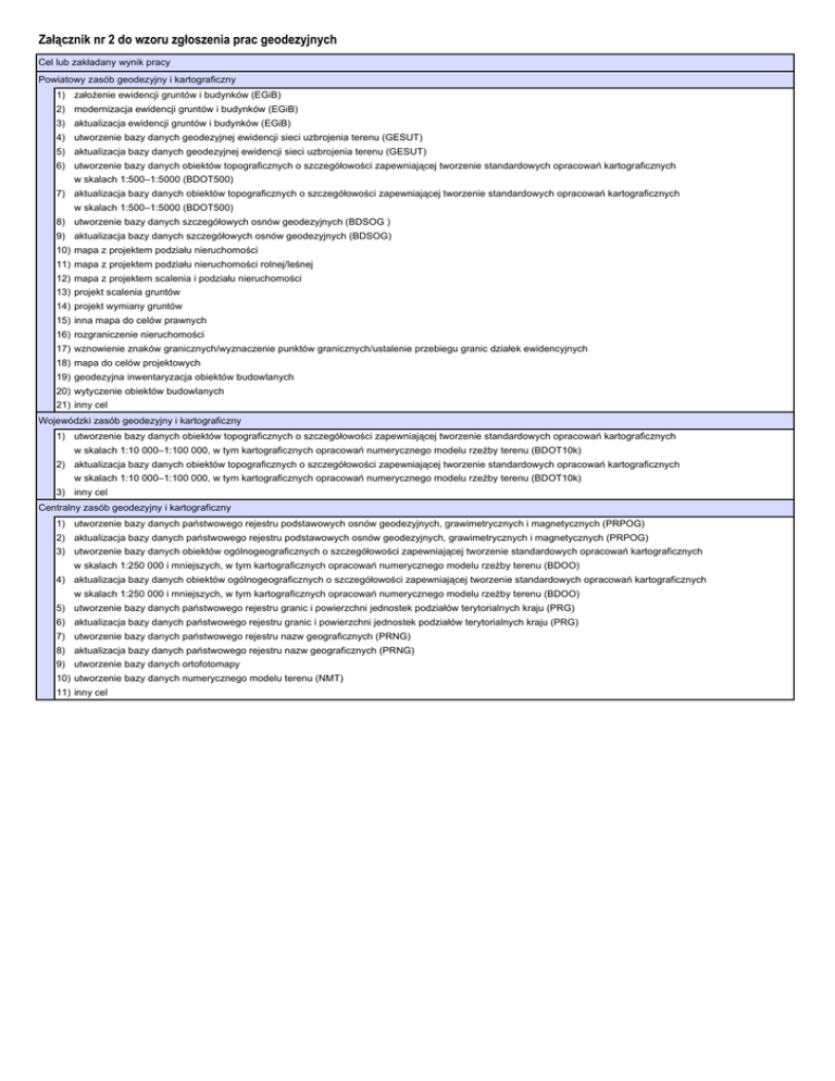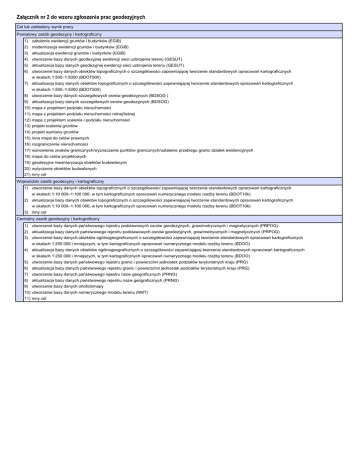 Załącznik nr 2 do wzoru zgłoszenia prac geodezyjnych Cel lub zakładany wynik pracy Powiatowy zasób geodezyjny i kartograficzny 1) założenie ewidencji gruntów i budynków (EGiB) 2) modernizacja ewidencji gruntów i budynków (EGiB) 3) aktualizacja ewidencji gruntów i budynków (EGiB) 4) utworzenie bazy danych geodezyjnej ewidencji sieci uzbrojenia terenu (GESUT) 5) aktualizacja bazy danych geodezyjnej ewidencji sieci uzbrojenia terenu (GESUT) 6) utworzenie bazy danych obiektów topograficznych o szczegółowości zapewniającej tworzenie standardowych opracowań kartograficznych w skalach 1:500–1:5000 (BDOT500) 7) aktualizacja bazy danych obiektów topograficznych o szczegółowości zapewniającej tworzenie standardowych opracowań kartograficznych w skalach 1:500–1:5000 (BDOT500) 8) utworzenie bazy danych szczegółowych osnów geodezyjnych (BDSOG ) 9) aktualizacja bazy danych szczegółowych osnów geodezyjnych (BDSOG) 10) mapa z projektem podziału nieruchomości 11) mapa z projektem podziału nieruchomości rolnej/leśnej 12) mapa z projektem scalenia i podziału nieruchomości 13) projekt scalenia gruntów 14) projekt wymiany gruntów 15) inna mapa do celów prawnych 16) rozgraniczenie nieruchomości 17) wznowienie znaków granicznych/wyznaczenie punktów granicznych/ustalenie przebiegu granic działek ewidencyjnych 18) mapa do celów projektowych 19) geodezyjna inwentaryzacja obiektów budowlanych 20) wytyczenie obiektów budowlanych 21) inny cel Wojewódzki zasób geodezyjny i kartograficzny 1) utworzenie bazy danych obiektów topograficznych o szczegółowości zapewniającej tworzenie standardowych opracowań kartograficznych w skalach 1:10 000–1:100 000, w tym kartograficznych opracowań numerycznego modelu rzeźby terenu (BDOT10k) 2) aktualizacja bazy danych obiektów topograficznych o szczegółowości zapewniającej tworzenie standardowych opracowań kartograficznych w skalach 1:10 000–1:100 000, w tym kartograficznych opracowań numerycznego modelu rzeźby terenu (BDOT10k) 3) inny cel Centralny zasób geodezyjny i kartograficzny 1) utworzenie bazy danych państwowego rejestru podstawowych osnów geodezyjnych, grawimetrycznych i magnetycznych (PRPOG) 2) aktualizacja bazy danych państwowego rejestru podstawowych osnów geodezyjnych, grawimetrycznych i magnetycznych (PRPOG) 3) utworzenie bazy danych obiektów ogólnogeograficznych o szczegółowości zapewniającej tworzenie standardowych opracowań kartograficznych w skalach 1:250 000 i mniejszych, w tym kartograficznych opracowań numerycznego modelu rzeźby terenu (BDOO) 4) aktualizacja bazy danych obiektów ogólnogeograficznych o szczegółowości zapewniającej tworzenie standardowych opracowań kartograficznych w skalach 1:250 000 i mniejszych, w tym kartograficznych opracowań numerycznego modelu rzeźby terenu (BDOO) 5) utworzenie bazy danych państwowego rejestru granic i powierzchni jednostek podziałów terytorialnych kraju (PRG) 6) aktualizacja bazy danych państwowego rejestru granic i powierzchni jednostek podziałów terytorialnych kraju (PRG) 7) utworzenie bazy danych państwowego rejestru nazw geograficznych (PRNG) 8) aktualizacja bazy danych państwowego rejestru nazw geograficznych (PRNG) 9) utworzenie bazy danych ortofotomapy 10) utworzenie bazy danych numerycznego modelu terenu (NMT) 11) inny cel