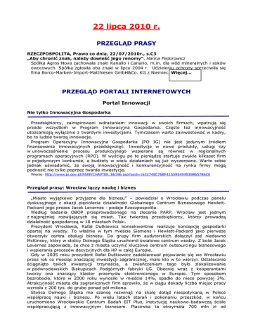 22 lipca 2010 r. PRZEGLĄD PRASY RZECZPOSPOLITA, Prawo co dnia, 22/07/2010r., s.C3 „Aby chronić znak, należy dowieść jego renomy”, Hanna Fedorowicz Spółka Agros Nova zachowała znaki Kanalio i Canario, m.in. dla wód mineralnych i soków owocowych. Spółka zgłosiła oba znaki w lipcu 2004 r. Udzieleniu ochrony sprzeciwiła się fima Borco-Marken-Import-Matthiesen GmbH&Co. KG z Niemiec. Więcej… PRZEGLĄD PORTALI INTERNETOWYCH Portal Innowacji Nie tylko Innowacyjna Gospodarka Przedsiębiorcy, zainspirowani wdrażaniem innowacji w swoich firmach, wpatrują się przede wszystkim w Program Innowacyjna Gospodarka. Często też innowacyjność utożsamiają wyłącznie z twardymi inwestycjami. Tymczasem warto zainwestować w kadry, bo to ludzie tworzą innowacje. Program Operacyjny Innowacyjna Gospodarka (PO IG) nie jest jedynym źródłem finansowania innowacyjnych przedsięwzięć. Inwestycje w nowe produkty, usługi czy w unowocześnienie procesu produkcyjnego wspierane są również w regionalnych programach operacyjnych (RPO). W wyścigu po te pieniądze startuje zwykle kilkaset firm w pojedynczym konkursie, a budżety w wielu działaniach są już wyczerpane. Warto sobie jednak uświadomić, że swoją innowacyjność i konkurencyjność na rynku firmy mogą podnosić nie tylko poprzez twarde inwestycje. Więcej: http://www.pi.gov.pl/PARP/CHAPTER_86196.asp?soid=1632748C76BF41A595494939B657B6CE Przegląd prasy: Wrocław łączy naukę i biznes „Miasto wyjątkowo przyjazne dla biznesu” – powiedział o Wrocławiu podczas panelu dyskusyjnego z okazji pięciolecia działalności Globalnego Centrum Biznesowego HewlettPackard jego prezes Jacek Levernes - podaje Rzeczpospolita. Według badania OBOP przeprowadzonego na zlecenie PARP, Wrocław jest jednym z najprężniej rozwijających się miast. Tak twierdzą przedsiębiorcy, którzy prowadzą działalność gospodarczą w 18 miastach Polski. Prezydent Wrocławia, Rafał Dutkiewicz konsekwentnie realizuje koncepcję gospodarki opartej na wiedzy. To właśnie w tym mieście Siemens i Hewlett-Packard jako pierwsze otworzyły centra obsługi biznesu. Do grupy firm audytorskich dołączył zaś niedawno McKinsey, który w stolicy Dolnego Śląska uruchomił światowe centrum wiedzy. Z kolei Jacek Levernes zapowiada, że chce z miasta uczynić kluczowe centrum outsourcingu biznesowego i wspierania procesów decyzyjnych dla HP w całej Europie. Gdy w 2005 roku prezydent Rafał Dutkiewicz zadeklarował pojawianie się we Wrocławiu przez rok co miesiąc znaczącej inwestycji zagranicznej, mało kto w to wierzył. Ostatecznie ściągnięto takich inwestycji trzynaście, a zwieńczeniem tego było zlokalizowanie w podwrocławskich Biskupicach Podgórnych fabryki LG. Obecnie wraz z kooperantami tworzy ona znaczący klaster przemysłu elektronicznego w Europie. Tym sposobem bezrobocie, które w 2000 roku wynosiło w mieście 14%, spadło do nieco powyżej 3%. Atrakcyjność miasta dla zagranicznych firm sprawiło, że w ciągu dekady liczba miejsc pracy wzrosła z 200 tys. do grubo ponad pół miliona. Stolica Dolnego Śląska ma szansę rozwinąć na skalę dotąd niespotykaną w Polsce współpracę nauki i biznesu. Po wielu latach starań i pokonaniu przeszkód, w końcu uruchomiono Wrocławskie Centrum Badań EIT Plus, instytucję naukowo-badawczą ściśle współpracującą z innowacyjnym biznesem. Placówka ta otrzymała 700 mln zł od Ministerstwa Nauki na realizację dwóch projektów: nanotechnologicznego i biotechnologicznego. – Wrocławowi nie grozi „przegrzanie”. Rynek jest tu chłonny, im więcej firm tu przychodzi, tym paradoksalnie łatwiej jest wejść następnym – ocenia strategię miasta Paweł Panczyj z firmy doradczej Ernst & Young, były szef słynnej „Brygady tygrysa”, wspierającej w urzędzie miasta nowych inwestorów. Nauka w Polsce PAP GE przeznaczy ok. 160 mln euro na pomysły oszczędzające energię Ok. 160 mln euro przeznaczy amerykański koncern GE na realizację pomysłów dotyczących oszczędności energii, zgłaszanych przez firmy i osoby prywatne z całego świata. W konkursie mogą brać udział także polskie firmy. Swoje pomysły mogą zgłaszać do 30 września. Konkurs dotyczy szeroko pojętego oszczędzania energii. Pomysły można zgłaszać w trzech kategoriach: odnawialne źródła energii, sieci energetyczne oraz ekologiczne domy i budynki. Do tej pory do konkursu zgłoszono 300 projektów, ale ani jeden nie pochodzi z Polski. "Konkurs skierowany jest do firm i osób, które mają świetne pomysły, ale z różnych powodów nie zyskały one jeszcze należytego uznania na świecie, czy też nie doczekały się fazy wdrożenia" - powiedział PAP dyrektor regionalny GE w Europie Środkowej Lesław Kuzaj. "Mamy w Polsce mnóstwo pomysłów, które wciąż czekają na odkrycie ich dla świata i właśnie ten konkurs może im w tym pomóc. Jestem przekonany, że polskie firmy mają ogromny potencjał i mogą bez żadnych oporów rywalizować z firmami z całego świata" dodał. Kuzaj wyjaśnił, że aby wziąć udział w konkursie, trzeba opisać swój pomysł po angielsku i umieścić go na stronie ecomagination.com/challenge. "Nie ma ograniczenia co do liczby zgłoszeń, więc jeżeli ktoś ma kilka dobrych pomysłów, może je opisać, a każdy z nich zostanie oceniony oddzielnie" - dodał. Wybranym uczestnikom konkursu koncern zaproponuje współpracę. GE działa w Polsce od 1992 r. Razem z Instytutem Lotnictwa prowadzi w Warszawie Inżynieryjne Centrum Projektowe EDC (Engineering Design Center), które zatrudnia ok. 900 inżynierów. Połowa zespołu zajmuje się lotnictwem, a druga pracuje nad projektami dla energetyki i sektora paliwowego. Dr Levy doradzi Polakom, jak komercjalizować badania stosowane Dr Haim V. Levy - światowej sławy specjalista w licencjonowaniu technologii - poprowadzi w Polsce serię szkoleń dotyczących komercjalizacji badań stosowanych. Spotkania od