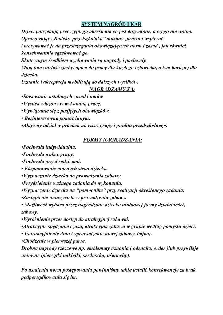 SYSTEM NAGRÓD I KAR Dzieci potrzebują precyzyjnego określenia co jest dozwolone, a czego nie wolno. Opracowując „Kodeks przedszkolaka” musimy zarówno wspierać i motywować je do przestrzegania obowiązujących norm i zasad , jak również konsekwentnie egzekwować go. Skutecznym środkiem wychowania są nagrody i pochwały. Mają one wartość zachęcającą do pracy dla każdego człowieka, a tym bardziej dla dziecka. Uznanie i akceptacja mobilizują do dalszych wysiłków. NAGRADZAMY ZA: •Stosowanie ustalonych zasad i umów. •Wysiłek włożony w wykonaną pracę. •Wywiązanie się z podjętych obowiązków. • Bezinteresowną pomoc innym. •Aktywny udział w pracach na rzecz grupy i punktu przedszkolnego. FORMY NAGRADZANIA: •Pochwała indywidualna. •Pochwała wobec grupy. •Pochwała przed rodzicami. • Eksponowanie mocnych stron dziecka. •Wyznaczanie dziecka do prowadzenia zabawy. •Przydzielenie ważnego zadania do wykonania. •Wyznaczenie dziecka na "pomocnika" przy realizacji określonego zadania. •Zastąpienie nauczyciela w prowadzeniu zabawy. • Możliwość wyboru przez nagrodzone dziecko ulubionej formy działalności, zabawy. •Wyróżnienie przez dostęp do atrakcyjnej zabawki. •Atrakcyjne spędzanie czasu, atrakcyjna zabawa w grupie według pomysłu dzieci. • Uatrakcyjnienie dnia (wprowadzenie nowej zabawy, bajka). •Chodzenie w pierwszej parze. Drobne nagrody rzeczowe np. emblematy uznania ( odznaka, order )lub przywileje umowne (pieczątki,naklejki, serduszka, uśmiechy). Po ustaleniu norm postępowania powinniśmy także ustalić konsekwencje za brak podporządkowania się im. WZMOCNIENIA NEGATYWNE STOSUJEMY ZA: •Nieprzestrzeganie ustalonych norm i zasad współżycia w grupie i przedszkolu. •Stwarzanie sytuacji zagrażających bezpieczeństwu i zdrowiu własnemu i innych. •Zachowania agresywne. •Niszczenie wytworów pracy innych, ich własności,zabawek w przedszkolu. •Celowe nie wywiązywanie się z podjętych obowiązków. FORMY WZMOCNIEŃ NEGATYWNYCH: •Upomnienie słowne indywidualne (przypomnienie obowiązujących zasad). •Upomnienie słowne wobec grupy. • Poinformowanie rodziców o przewinieniu. • Okazywanie niezadowolenia – gest, mimika, wyrażenie przez nauczyciela smutku i niezadowolenia z powodu zachowania dziecka. •Czasowe odsunięcie od zabawy. •Wyciszanie dziecka przez indywidualne zabawy przy stoliku. •Rozmowa na temat postępowania dziecka – przedstawienie następstw zachowania (skłonienie dziecka do autorefleksji). •Zastosowanie aktywności mającej na celu rozładowanie negatywnych emocji. •Upomnienia umowne (pieczątki, smutne buźki, naklejki,itp.) •Wykonanie pracy na rzecz poszkodowanego (np. rysunek jako forma przeproszenia). •Wykonanie pracy na rzecz grupy (np. ułożenie zabawek, książek w kącikach zainteresowań,naprawienie zepsutej zabawki).
