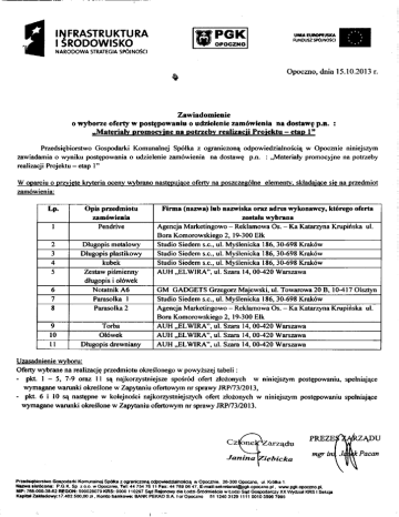 INFRASTRUKTURA I ŚRODOWISKO PGK UNIA EUROPEJSKA FUNDUSZ SPÓJNOŚCI OPOCZNO N A R O D O W A STRATEGIA SPÓJNOŚCI Opoczno, dnia 15.10.2013 r. Zawiadomienie o wyborze oferty w postępowaniu o udzielenie zamówienia na dostawę p.n. : ..Materiały promocyjne na potrzeby realizacji Projektu - etap 1" Przedsiębiorstwo Gospodarki Komunalnej Spółka z ograniczoną odpowiedzialnością w Opocznie niniejszym zawiadamia o wyniku postępowania o udzielenie zamówienia na dostawę p.n. : „Materiały promocyjne na potrzeby realizacji Projektu - etap 1" W oparciu o przyjęte kryteria oceny wybrano następujące oferty na poszczególne elementy, składające się na przedmiot zamówienia: Lp. 1 2 3 4 5 Opis przedmiotu zamówienia Pendrive 6 7 8 Długopis metalowy Długopis plastikowy kubek Zestaw piśmienny długopis i ołówek Notatnik A6 Parasolka 1 Parasolka 2 9 10 11 Torba Ołówek Długopis drewniany Firma (nazwa) lub nazwiska oraz adres wykonawcy, którego oferta została wybrana Agencja Marketingowo - Reklamowa Os. - Ka Katarzyna Krupińska ul. Bora Komorowskiego 2, 19-300 Ełk Studio Siedem s.c, ul. Myślenicka 186, 30-698 Kraków Studio Siedem s.c, ul. Myślenicka 186, 30-698 Kraków Studio Siedem s.c, ul. Myślenicka 186, 30-698 Kraków A U H „ELWIRA", ul. Szara 14, 00-420 Warszawa G M GADGETS Grzegorz Majewski, ul. Towarowa 20 B, 10-417 Olsztyn Studio Siedem s.c, ul. Myślenicka 186, 30-698 Kraków Agencja Marketingowo - Reklamowa Os. - Ka Katarzyna Krupińska ul. Bora Komorowskiego 2, 19-300 Ełk A U H „ELWIRA", ul. Szara 14, 00-420 Warszawa A U H „ELWIRA", ul. Szara 14, 00-420 Warszawa AUH „ELWIRA", ul. Szara 14, 00-420 Warszawa Uzasadnienie wyboru: Oferty wybrane na realizację przedmiotu określonego w powyższej tabeli: - pkt. 1 - 5 , 7-9 oraz 11 są najkorzystniejsze spośród ofert złożonych w niniejszym postępowaniu, spełniające wymagane warunki określone w Zapytaniu ofertowym nr sprawy JRP/73/2013, - pkt. 6 i 10 są następne w kolejności najkorzystniejszych ofert złożonych w niniejszym postępowaniu spełniające wymagane warunki określone w Zapytaniu ofertowym nr sprawy JRP/73/2013. CzłfonelpZarządu Janinu]Ziebicka PREZE mgr in. Przedsiębiorstwo Gospodarki Komunalnej Spółka z ograniczoną odpowiedzialnością w Opocznie, 26-300 Opoczno, ul. Krótka 1. Nazwa skrócona: P G K . Sp. z o.o. w Opocznie, Tel: 44 754 76 11 Fax: 44 789 06 47, E-mail :[email protected] p l , www.pgk.opoczno.pl, NIP: 768-000-38-62 R E G O N : 590028079 K R S : 0000 110297 Sąd Rejonowy dla Łodzi-Śródmieścia w Łodzi Sąd Gospodarczy XX Wydział KRS I Sekcja Kapitał Zakładowy: 17 402 500.00 z ł . Konto bankowe: BANK P E K A O S A 10/Opoczno 51 1240 3129 1111 0010 3596 7995