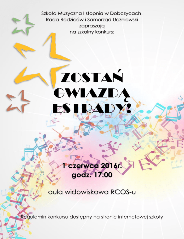 Szkoła Muzyczna I stopnia w Dobczycach, Rada Rodziców i Samorząd Uczniowski zapraszają na szkolny konkurs: ZOSTAN GWIAZDA ESTRADY! 1 czerwca 2016r. godz. 17:00 aula widowiskowa RCOS-u Regulamin konkursu dostępny na stronie internetowej szkoły