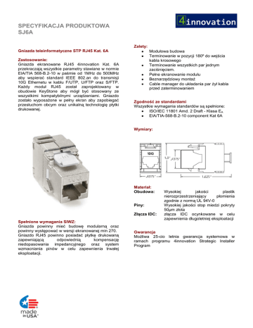 SPECYFIKACJA PRODUKTOWA SJ6A Zalety: Modułowa budowa Terminowanie w pozycji 180º do wejścia kabla krosowego Terminowanie wszystkich par jednym zaciśnięciem. Pełne ekranowanie modułu Beznarzędziowy montaż Cable manager do układania par żył kabla przed zaterminowaniem Gniazda teleinformatyczne STP RJ45 Kat. 6A Zastosowanie: Gniazda ekranowane RJ45 4innovation Kat. 6A przekraczają wszystkie parametry stawiane w normie EIA/TIA 568-B.2-10 w paśmie od 1MHz do 500MHz aby wspierać standard IEEE 802.an do transmisji 10G Ethernetu w kablu F/UTP, U/FTP oraz S/FTP. Każdy moduł RJ45 został zaprojektowany w obudowie KeyStone aby mógł być stosowany ze wszystkimi kompatybilnymi urządzeniami. Gniazdo zostało wyposażone w pełny ekran aby zapobiegać przesłuchom obcym oraz unikalną technologię płytki drukowanej. Zgodność ze standardami Wszystkie wymagania standardów są spełnione: ISO/IEC 11801 Amd. 2 Draft - Klasa EA EIA/TIA-568-B.2-10 component Kat 6A Wymiary: Materiał: Obudowa: Piny: Złącza IDC: Spełnione wymagania SIWZ: Gniazda powinny mieć budowę modularną oraz powinny występować w wersji ekranowanej min 270. Gniazdo RJ45 powinno posiadać płytkę drukowaną zapewniającą odpowiednią kompensację niedopasowania impedancyjnego oraz system wzmacniania pinów w celu zapewnienia trwałej eksploatacji. Wysokiej jakości plastik nierozprzestrzeniający płomienia zgodnie z normą UL 94V-0 Wysokiej jakości stop miedzi pokryty 50µm złota złącza IDC ocynkowane w celu zapewnienia długoletniej eksploatacji Gwarancja Możliwa 25-cio letnia gwarancja systemowa w ramach programu 4innovation Strategic Installer Program