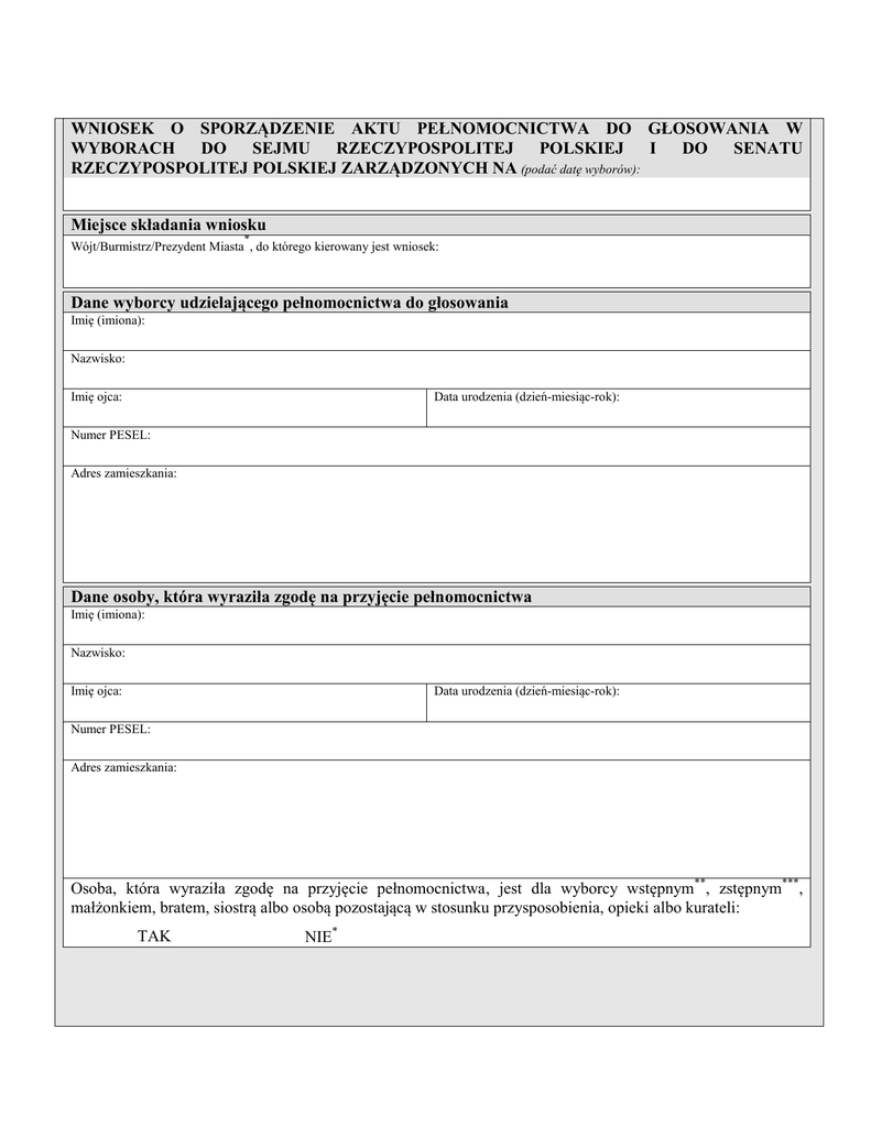 WNIOSEK O SPORZĄDZENIE AKTU PEŁNOMOCNICTWA DO GŁOSOWANIA W WYBORACH DO SEJMU RZECZYPOSPOLITEJ POLSKIEJ I DO SENATU RZECZYPOSPOLITEJ POLSKIEJ ZARZĄDZONYCH NA (podać datę wyborów): Miejsce składania wniosku * Wójt/Burmistrz/Prezydent Miasta , do którego kierowany jest wniosek: Dane wyborcy udzielającego pełnomocnictwa do głosowania Imię (imiona): Nazwisko: Imię ojca: Data urodzenia (dzień-miesiąc-rok): Numer PESEL: Adres zamieszkania: Dane osoby, która wyraziła zgodę na przyjęcie pełnomocnictwa Imię (imiona): Nazwisko: Imię ojca: Data urodzenia (dzień-miesiąc-rok): Numer PESEL: Adres zamieszkania: Osoba, która wyraziła zgodę na przyjęcie pełnomocnictwa, jest dla wyborcy wstępnym**, zstępnym***, małżonkiem, bratem, siostrą albo osobą pozostającą w stosunku przysposobienia, opieki albo kurateli: TAK NIE* Do wniosku załączono: 1. pisemną zgodę osoby, która wyraziła zgodę na przyjęcie pełnomocnictwa; 2. kopię aktualnego orzeczenia właściwego organu orzekającego o ustaleniu stopnia niepełnosprawności wyborcy (nie dotyczy wyborcy, który najpóźniej w dniu głosowania kończy 75 lat); 3. kopię zaświadczenia o prawie do głosowania wydanego osobie, która wyraziła zgodę na przyjęcie pełnomocnictwa (załącza się wyłącznie w przypadku, gdy osoba, która wyraziła zgodę na przyjęcie pełnomocnictwa, nie jest wpisana do rejestru wyborców w tej samej gminie co wyborca udzielający pełnomocnictwa do głosowania); 4. kopię dokumentu potwierdzającego pozostawanie wyborcy z osobą, która wyraziła zgodę na przyjęcie pełnomocnictwa w stosunku przysposobienia/opieki/kurateli* (załącza się wyłącznie w przypadku, gdy taki stosunek istnieje). Miejsce sporządzenia aktu pełnomocnictwa do głosowania (wypełnić jedynie w przypadku, gdy ma być ono inne niż miejsce zamieszkania wyborcy udzielającego pełnomocnictwa do głosowania): Oświadczenia Oświadczam, że wszystkie dane zawarte we wniosku są zgodne z prawdą. Wyborca wyraża zgodę na to by w postępowaniu w sprawie sporządzenia aktu pełnomocnictwa był reprezentowany przez osobę, która wyraziła zgodę na przyjęcie pełnomocnictwa: TAK NIE* Wyborca nie może lub nie umie złożyć podpisu: TAK NIE* Data wypełnienia (dzień-miesiąc-rok): Podpis wyborcy (w przypadku gdy wyborca nie może lub nie umie złożyć podpisu, w miejscu tym podpis składa osoba, która wyraziła zgodę na przyjęcie pełnomocnictwa): Adnotacje urzędowe Numer wniosku: Uwagi: Podpis przyjmującego wniosek: * Niepotrzebne skreślić. ** Wstępnym jest ojciec, matka, dziadek, babka itd. *** Zstępnym jest syn, córka, wnuk, wnuczka itd. - ZGODA NA PRZYJĘCIE PEŁNOMOCNICTWA DO GŁOSOWANIA W WYBORACH DO SEJMU RZECZYPOSPOLITEJ POLSKIEJ I DO SENATU RZECZYPOSPOLITEJ POLSKIEJ Miejsce składania * Wójt/Burmistrz/Prezydent Miasta , do którego kierowany jest wniosek: Wyrażam zgodę na przyjęcie pełnomocnictwa do głosowania w wyborach do Sejmu Rzeczypospolitej Polskiej i do Senatu Rzeczypospolitej Polskiej zarządzonych na (podać datę wyborów): Dane osoby, która wyraziła zgodę na przyjęcie pełnomocnictwa Imię (imiona): Nazwisko: Imię ojca: Data urodzenia (dzień-miesiąc-rok): Numer PESEL: Adres zamieszkania: Osoba, która wyraziła zgodę na przyjęcie pełnomocnictwa, jest dla wyborcy wstępnym**, zstępnym***, małżonkiem, bratem, siostrą albo osobą pozostającą w stosunku przysposobienia, opieki albo kurateli: TAK NIE* Dane wyborcy udzielającego pełnomocnictwa do głosowania Imię (imiona): Nazwisko: Imię ojca: Numer PESEL: Adres zamieszkania: Oświadczenia i wnioski Data urodzenia (dzień-miesiąc-rok): Proszę o pozostawienie aktu pełnomocnictwa do głosowania do odbioru w urzędzie gminy/doręczenie na wskazany poniżej adres*: Informuję, że wyraziłam/wyraziłem* już zgodę na przyjęcie pełnomocnictwa do głosowania od (należy podać imię i nazwisko, numer PESEL oraz adres zamieszkania wyborcy): Oświadczam, że wszystkie powyższe dane są zgodne z prawdą. Data wypełnienia (dzień-miesiąc-rok): Podpis osoby, która wyraziła zgodę na przyjęcie pełnomocnictwa: Adnotacje urzędowe Uwagi: Podpis przyjmującego: * Niepotrzebne skreślić; ** Wstępnym jest ojciec, matka, dziadek, babka itd. *** Zstępnym jest syn, córka, wnuk, wnuczka itd. -