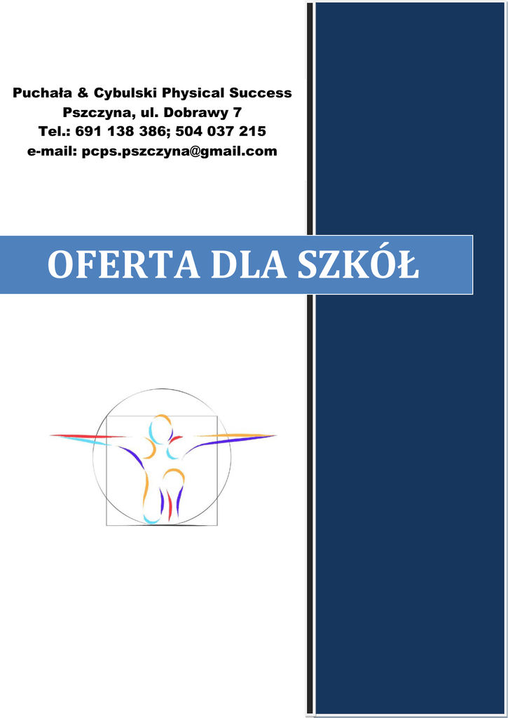 Puchała & Cybulski Physical Success Pszczyna, ul. Dobrawy 7 Tel.: 691 138 386; 504 037 215 e-mail: [email protected] OFERTA DLA SZKÓŁ OFERTA DLA SZKÓŁ PCPS Puchała & Cybulski Physical Success, to nasz autorski projekt, wspierający fizyczny aspekt życia człowieka. Zespół osób pracujący na sukces każdego Klienta posiada szeroką wiedzę i doświadczenie zdobyte na przestrzeni lat. W naszej załodze znajdują się czynni sportowcy specjalizujący się w dyscyplinach indywidualnych i zespołowych, a także trenerzy pracujący z młodzieżą i drużynami seniorskimi. Puchała & Cybulski Physical Success, Pszczyna, ul. Dobrawy 7 Tel.: 691 138 386; 504 037 215 e-mail: [email protected] OFERTA DLA SZKÓŁ Badania manualne i strukturalne układu ruchu: • Wizualna analiza postawy ciała • Analiza krzywizn kręgosłupa i zmian patologicznych • Ocena elastyczności taśm mięśniowo -powięziowych • Ocena jakości podstawowych wzorców motorycznych • Ocena i analiza w obszarze struktury łańcucha kinematycznego kończyn dolnych Puchała & Cybulski Physical Success, Pszczyna, ul. Dobrawy 7 Tel.: 691 138 386; 504 037 215 e-mail: [email protected] OFERTA DLA SZKÓŁ Prelekcja z uczniami i nauczycielami na temat zdrowego trybu życia: • 10 powodów dla, których warto prowadzić aktywny styl życia • Woda - moc dla naszego organizmu • Zdrowe odżywianie - jak działa nasz organizm od środka • Konsekwencje i skutki działań przeciwko naszemu ciału. Puchała & Cybulski Physical Success, Pszczyna, ul. Dobrawy 7 Tel.: 691 138 386; 504 037 215 e-mail: [email protected] OFERTA DLA SZKÓŁ Stymulacja odpowiednich grup mięśniowych w ramach zajęć wychowania fizycznego: • Stretching aktywny drogą do aktywności fizycznej • Ćwiczenia korygujące błędne nawyki i zmiany patologiczne • Gry i zabawy ruchowe drogą do sukcesu na lekcjach wychowania fizycznego. Puchała & Cybulski Physical Success, Pszczyna, ul. Dobrawy 7 Tel.: 691 138 386; 504 037 215 e-mail: [email protected] OFERTA DLA SZKÓŁ Konsultacje z rodzicami odnośnie badań przeprowadzonych przez nasz zespół: • Omówienie wyników badań i zagrożeń niosących dla dziecka. • Zdrowe odżywianie drogą do sukcesów dziecka. Puchała & Cybulski Physical Success, Pszczyna, ul. Dobrawy 7 Tel.: 691 138 386; 504 037 215 e-mail: [email protected] OFERTA DLA SZKÓŁ Rabat na zajęcia w naszym centrum rehabilitacji i treningu: PCPS Pszczyna 1. Badania Badanie pacjenta obejmuje w pierwszej kolejności badanie podmiotowe, czyli wywiad z pacjentem. Następnie wykonujemy badania przedmiotowe – ogólne i miejscowe badanie statyczne i dynamiczne, pozwalające określić postawę ciała oraz zaburzenia w aparacie ruchu. Kolejnym etapem jest badanie funkcjonalne, w którym poprzez próby oparte o testy oceny funkcjonalnej (Functional Movement Screen) określamy jakość podstawowych wzorców ruchowych, a więc jakość ruchu. Puchała & Cybulski Physical Success, Pszczyna, ul. Dobrawy 7 Tel.: 691 138 386; 504 037 215 e-mail: [email protected] OFERTA DLA SZKÓŁ 2. Dietetyk W ramach opieki dietetyka i suplementacji sportowa” oferujemy następujące rozwiązania: • dieta dopasowana do rodzaju uprawianej dyscypliny sportowej • dieta dla zawodowców (możliwość połączenia z suplementacją) • dieta pomagająca zmniejszyć ilość tkanki tłuszczowej, zwiększyć masę mięśniową Puchała & Cybulski Physical Success, Pszczyna, ul. Dobrawy 7 Tel.: 691 138 386; 504 037 215 e-mail: [email protected] OFERTA DLA SZKÓŁ 3. Fizjoterapia Rehabilitacja w trakcie i po zakończonym leczeniu urazu jest niezwykle istotna nie tylko by przywrócić optymalny poziom sprawności, ale także by zmniejszyć prawdopodobieństwo ponownego urazu. Przywracamy sprawność ruchową po urazach i przebytych operacjach w obrębie kręgosłupa oraz kończyn dolnych i górnych. Zajmujemy się również pacjentami, którzy są dopiero przygotowywani do zabiegu operacyjnego. Warto wiedzieć, że niejednokrotnie zdarza się, że właściwie przeprowadzony proces rehabilitacji pozwala uniknąć wizyty na stole operacyjnym. Puchała & Cybulski Physical Success, Pszczyna, ul. Dobrawy 7 Tel.: 691 138 386; 504 037 215 e-mail: [email protected] OFERTA DLA SZKÓŁ 4. Psycholog sportu Rola psychologa sportu staje się współcześnie coraz ważniejsza, dlatego nie mogło go zabraknąć w ofercie PCPS. Pomoc psychologa staje się nieoceniona w pracy nad sukcesem każdego sportowca w takich kwestiach jak: radzenie sobie z presją, leczenie kontuzji czy planowanie zrównoważonej kariery. Puchała & Cybulski Physical Success, Pszczyna, ul. Dobrawy 7 Tel.: 691 138 386; 504 037 215 e-mail: [email protected] OFERTA DLA SZKÓŁ 5. Współpraca z profesjonalistami Dzięki współpracy z lekarzami i podmiotami pokrewnymi, możemy odnosić lepsze efekty w pracy w naszymi podopiecznymi. Pacjenci wiedzą, że podczas rehabilitacji są w dobrych rękach, a sportowcy wiedzą, że ich postęp monitorowany jest w oparciu o rzetelne badania. Puchała & Cybulski Physical Success, Pszczyna, ul. Dobrawy 7 Tel.: 691 138 386; 504 037 215 e-mail: [email protected]