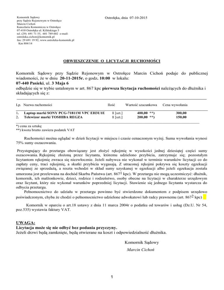 Komornik Sądowy przy Sądzie Rejonowym w Ostrołęce Marcin Cichoń Kancelaria Komornicza w Ostrołęce 07-410 Ostrołęka ul. Kilińskiego 5 tel. (29) 691 71 55, 601 789 602 e-mail: [email protected] fax: 29 691 19 92, www.ostroleka-komornik.pl Km 804/14 Ostrołęka, dnia 07-10-2015 OBWIESZCZENIE O LICYTACJI RUCHOMOŚCI Komornik Sądowy przy Sądzie Rejonowym w Ostrołęce Marcin Cichoń podaje do publicznej wiadomości, że w dniu 20-11-2015r. o godz. 10:00 w lokalu: 07-440 Pasieki, ul. 3 Maja 6 odbędzie się w trybie ustalonym w art. 867 kpc pierwsza licytacja ruchomości należących do dłużnika i składających się z: ____________________________________________________________________________________________________ Lp. Nazwa ruchomości Ilość Wartość szacunkowa Cena wywołania _____________________________________________________________________________________________________ 1. Laptop marki SONY PCG-71811M VPC EH3U1E 1 [szt.] 400,00 **) 300,00 2. Telewizor marki TOSHIBA REGZA 1 [szt.] 200,00 **) 150,00 _______________________________________________________________________________________________________________________ *) cena za sztukę **) kwota brutto zawiera podatek VAT Ruchomości można oglądać w dzień licytacji w miejscu i czasie oznaczonym wyżej. Suma wywołania wynosi 75% sumy oszacowania. Przystępujący do przetargu obowiązany jest złożyć rękojmię w wysokości jednej dziesiątej części sumy oszacowania. Rękojmię złożoną przez licytanta, któremu udzielono przybicia, zatrzymuje się; pozostałym licytantom rękojmię zwraca się niezwłocznie. Jeżeli nabywca nie wykonał w terminie warunków licytacji co do zapłaty ceny, traci rękojmię, a skutki przybicia wygasają. Z utraconej rękojmi pokrywa się koszty egzekucji związanej ze sprzedażą, a reszta wchodzi w skład sumy uzyskanej w egzekucji albo jeżeli egzekucja została umorzona jest przelewana na dochód Skarbu Państwa (art. 8671 kpc). W przetargu nie mogą uczestniczyć: dłużnik, komornik, ich małżonkowie, dzieci, rodzice i rodzeństwo, osoby obecne na licytacji w charakterze urzędowym oraz licytant, który nie wykonał warunków poprzedniej licytacji. Stawienie się jednego licytanta wystarcza do odbycia przetargu. Pełnomocnictwo do udziału w przetargu powinno być stwierdzone dokumentem z podpisem urzędowo poświadczonym, chyba że chodzi o pełnomocnictwo udzielone adwokatowi lub radcy prawnemu (art. 8672 kpc) Komornik w oparciu o art.18 ustawy z dnia 11 marca 2004r o podatku od towarów i usług (Dz.U. Nr 54, poz.535) wystawia faktury VAT. UWAGA: Licytacja może się nie odbyć bez podania przyczyny. Jeżeli drzwi będą zamknięte, będą otwierane na koszt i odpowiedzialność dłużnika. Komornik Sądowy Marcin Cichoń 1