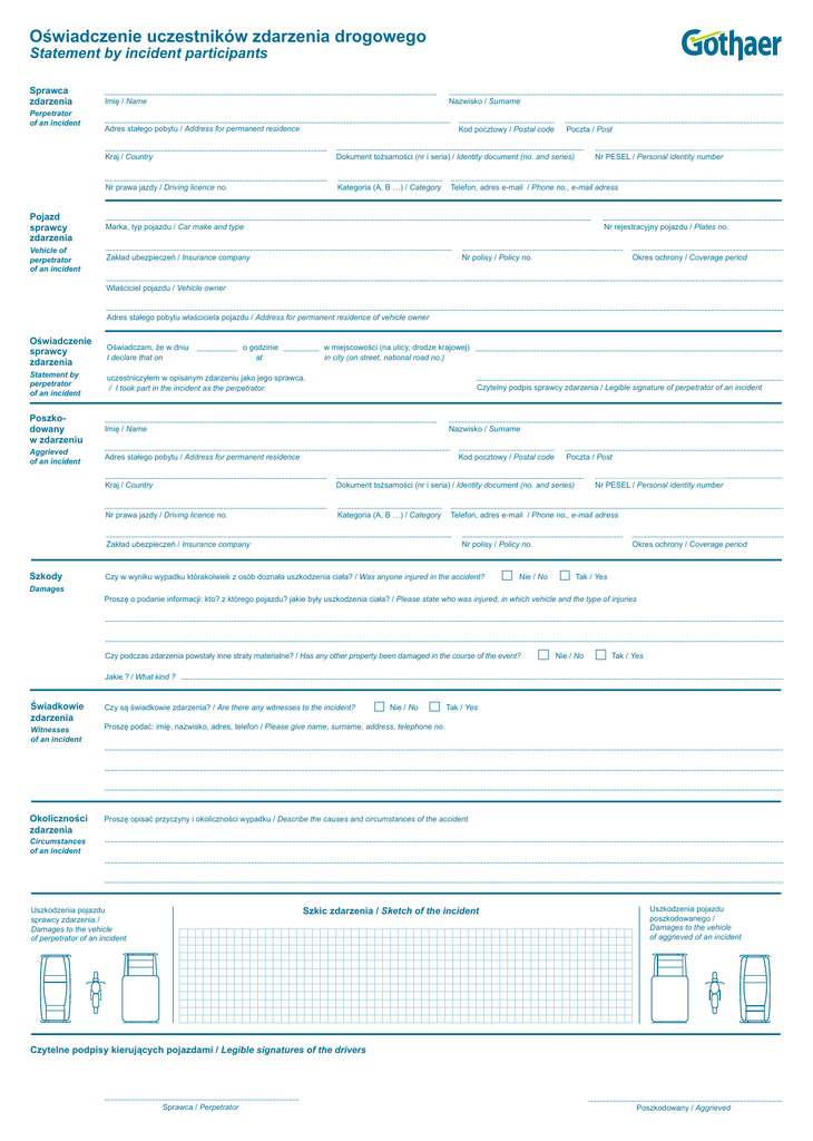 Oświadczenie uczestników zdarzenia drogowego Statement by incident participants Sprawca zdarzenia Perpetrator of an incident Nazwisko / Surname Imię / Name Adres stałego pobytu / Address for permanent residence Kod pocztowy / Postal code Poczta / Post Kraj / Country Dokument tożsamości (nr i seria) / Identity document (no. and series) Nr prawa jazdy / Driving licence no. Kategoria (A, B …) / Category Pojazd sprawcy zdarzenia Marka, typ pojazdu / Car make and type Vehicle of perpetrator of an incident Zakład ubezpieczeń / Insurance company Nr PESEL / Personal identity number Telefon, adres e-mail / Phone no., e-mail adress Nr rejestracyjny pojazdu / Plates no. Nr polisy / Policy no. Okres ochrony / Coverage period Właściciel pojazdu / Vehicle owner Adres stałego pobytu właściciela pojazdu / Address for permanent residence of vehicle owner Oświadczenie sprawcy zdarzenia Oświadczam, że w dniu I declare that on Statement by perpetrator of an incident uczestniczyłem w opisanym zdarzeniu jako jego sprawca. / I took part in the incident as the perpetrator. Poszkodowany w zdarzeniu Imię / Name Aggrieved of an incident Adres stałego pobytu / Address for permanent residence o godzinie at w miejscowości (na ulicy, drodze krajowej) in city (on street, national road no.) Czytelny podpis sprawcy zdarzenia / Legible signature of perpetrator of an incident Nazwisko / Surname Kod pocztowy / Postal code Kraj / Country Dokument tożsamości (nr i seria) / Identity document (no. and series) Nr prawa jazdy / Driving licence no. Kategoria (A, B …) / Category Zakład ubezpieczeń / Insurance company Szkody Damages Poczta / Post Nr PESEL / Personal identity number Telefon, adres e-mail / Phone no., e-mail adress Nr polisy / Policy no. Czy w wyniku wypadku którakolwiek z osób doznała uszkodzenia ciała? / Was anyone injured in the accident? Nie / No Okres ochrony / Coverage period Tak / Yes Proszę o podanie informacji: kto? z którego pojazdu? jakie były uszkodzenia ciała? / Please state who was injured, in which vehicle and the type of injuries Czy podczas zdarzenia powstały inne straty materialne? / Has any other property been damaged in the course of the event? Nie / No Tak / Yes Jakie ? / What kind ? Świadkowie zdarzenia Czy są świadkowie zdarzenia? / Are there any witnesses to the incident? Nie / No Tak / Yes Witnesses of an incident Proszę podać: imię, nazwisko, adres, telefon / Please give name, surname, address, telephone no. Okoliczności zdarzenia Proszę opisać przyczyny i okoliczności wypadku / Describe the causes and circumstances of the accident Circumstances of an incident Szkic zdarzenia / Sketch of the incident Uszkodzenia pojazdu sprawcy zdarzenia / Damages to the vehicle of perpetrator of an incident Uszkodzenia pojazdu poszkodowanego / Damages to the vehicle of aggrieved of an incident Czytelne podpisy kierujących pojazdami / Legible signatures of the drivers Sprawca / Perpetrator Poszkodowany / Aggrieved