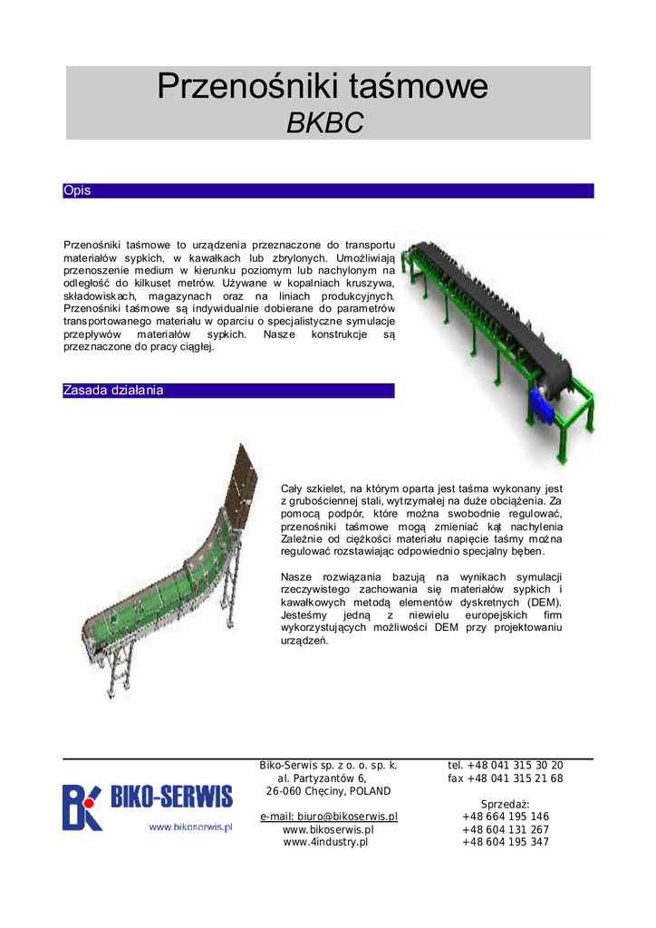 Przenośniki taśmowe BKBC Opis Przenośniki taśmowe to urządzenia przeznaczone do transportu materiałów sypkich, w kawałkach lub zbrylonych. Umożliwiają przenoszenie medium w kierunku poziomym lub nachylonym na odległość do kilkuset metrów. Używane w kopalniach kruszywa, składowisk ac h, magazynac h oraz na liniach produkcyjnyc h. Przenośniki t aśmowe są indywidualnie dobierane do parametrów trans port owanego materiału w oparciu o specjalistyczne symulacje przepływów materiałów sypkich. Nasz e konstrukcje są przez naczone do pracy ciągłej. Zasada działania Cały szkielet, na którym oparta jest taśma wykonany jest z grubościennej stali, wyt rzymałej na duże obciążenia. Za pomocą podpór, które można swobodnie regulować, przenośniki taśmowe mogą zmieniać kąt nac hylenia Zależnie od ciężkości materiału napięcie taśmy moż na regulować rozstawiając odpowiednio specjalny bęben. Nasze rozwiązania bazują na wynikac h symulacji rzeczywistego zachowania się materiałów sypkich i kawałk owych met odą elementów dyskretnych (DEM). Jesteśmy jedną z niewielu europejskich firm wykorzystujących możliwości DEM przy projektowaniu urządzeń. Biko-Serwis sp. z o. o. sp. k. al. Partyzantów 6, 26-060 Chęciny, POLAND e-mail: [email protected] www.bikoserwis.pl www.4industry.pl tel. +48 041 315 30 20 fax +48 041 315 21 68 Sprzedaż: +48 664 195 146 +48 604 131 267 +48 604 195 347 Dane techniczne Typ (szerokość ta śmy, mm) BKBC400 BKBC500 BKBC650 BKBC800 BKBC1000 BKBC1200 BKBC1400 BKBC1600 Ką t na turalnego usypu w ruchu Wydajność przy układzie dwukrążnikowym, kąt 25 st. [m3/ h] 10 40 20 50 30 60 Wydajność przy układzie trójkrążnikowym, kąt 30 st. [m3/h] 10 65 20 75 30 95 10 115 20 140 30 165 10 180 20 220 30 260 10 295 20 355 30 420 10 440 20 520 30 620 10 600 20 730 30 860 10 800 20 970 30 1150 Opcje i akcesoria • wykonanie dla stref Atex 21 i 22 • przenośnik wznoszący o kącie pracy 30-60 stopni, ze specjalną taśmą kieszeniową. Prz enośnik w całości obudowany, z nierdzewnymi ślizgami prowadzącymi. Biko-Serwis sp. z o. o. sp. k. al. Partyzant ów 6, 26-060 Chęciny, POLAND e-mail: biuro@ bikoserwis.pl www.bikoserw is.pl www.4industry.pl tel. +48 041 315 30 20 fax +48 041 315 21 68 Sprzedaż: +48 664 195 146 +48 604 131 267 +48 604 195 347