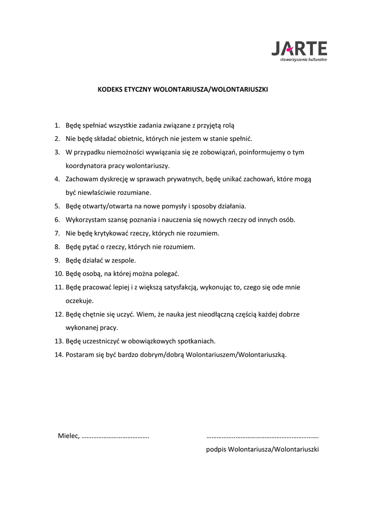 KODEKS ETYCZNY WOLONTARIUSZA/WOLONTARIUSZKI 1. Będę spełniać wszystkie zadania związane z przyjętą rolą 2. Nie będę składać obietnic, których nie jestem w stanie spełnić. 3. W przypadku niemożności wywiązania się ze zobowiązań, poinformujemy o tym koordynatora pracy wolontariuszy. 4. Zachowam dyskrecję w sprawach prywatnych, będę unikać zachowań, które mogą być niewłaściwie rozumiane. 5. Będę otwarty/otwarta na nowe pomysły i sposoby działania. 6. Wykorzystam szansę poznania i nauczenia się nowych rzeczy od innych osób. 7. Nie będę krytykować rzeczy, których nie rozumiem. 8. Będę pytać o rzeczy, których nie rozumiem. 9. Będę działać w zespole. 10. Będę osobą, na której można polegać. 11. Będę pracować lepiej i z większą satysfakcją, wykonując to, czego się ode mnie oczekuje. 12. Będę chętnie się uczyć. Wiem, że nauka jest nieodłączną częścią każdej dobrze wykonanej pracy. 13. Będę uczestniczyć w obowiązkowych spotkaniach. 14. Postaram się być bardzo dobrym/dobrą Wolontariuszem/Wolontariuszką. Mielec, …………………………………. ……………..…………………………………………. podpis Wolontariusza/Wolontariuszki