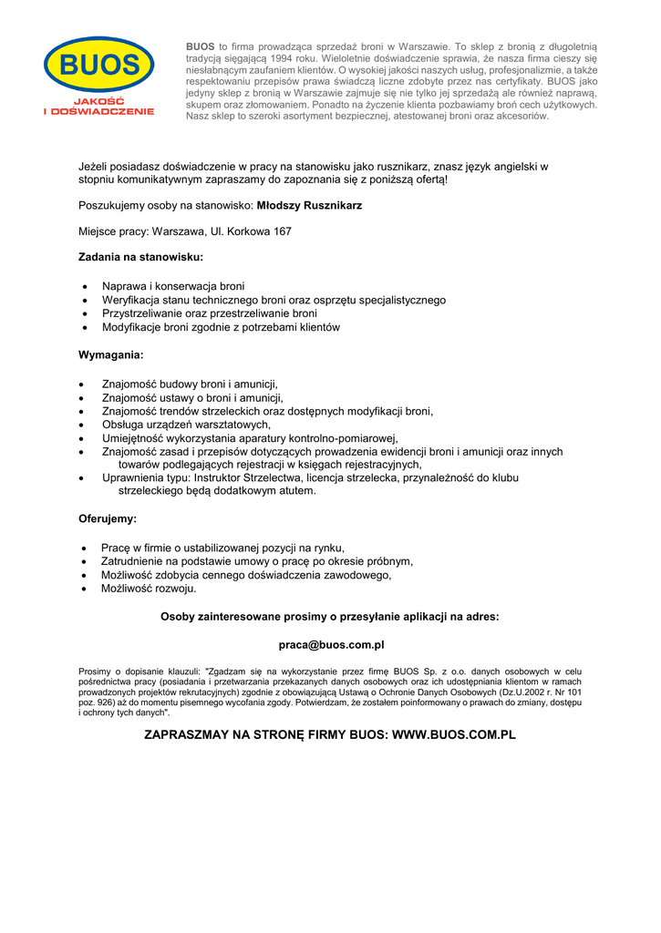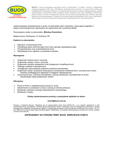 BUOS to firma prowadząca sprzedaż broni w Warszawie. To sklep z bronią z długoletnią tradycją sięgającą 1994 roku. Wieloletnie doświadczenie sprawia, że nasza firma cieszy się niesłabnącym zaufaniem klientów. O wysokiej jakości naszych usług, profesjonalizmie, a także respektowaniu przepisów prawa świadczą liczne zdobyte przez nas certyfikaty. BUOS jako jedyny sklep z bronią w Warszawie zajmuje się nie tylko jej sprzedażą ale również naprawą, skupem oraz złomowaniem. Ponadto na życzenie klienta pozbawiamy broń cech użytkowych. Nasz sklep to szeroki asortyment bezpiecznej, atestowanej broni oraz akcesoriów. Jeżeli posiadasz doświadczenie w pracy na stanowisku jako rusznikarz, znasz język angielski w stopniu komunikatywnym zapraszamy do zapoznania się z poniższą ofertą! Poszukujemy osoby na stanowisko: Młodszy Rusznikarz Miejsce pracy: Warszawa, Ul. Korkowa 167 Zadania na stanowisku: Naprawa i konserwacja broni Weryfikacja stanu technicznego broni oraz osprzętu specjalistycznego Przystrzeliwanie oraz przestrzeliwanie broni Modyfikacje broni zgodnie z potrzebami klientów Wymagania: Znajomość budowy broni i amunicji, Znajomość ustawy o broni i amunicji, Znajomość trendów strzeleckich oraz dostępnych modyfikacji broni, Obsługa urządzeń warsztatowych, Umiejętność wykorzystania aparatury kontrolno-pomiarowej, Znajomość zasad i przepisów dotyczących prowadzenia ewidencji broni i amunicji oraz innych towarów podlegających rejestracji w księgach rejestracyjnych, Uprawnienia typu: Instruktor Strzelectwa, licencja strzelecka, przynależność do klubu strzeleckiego będą dodatkowym atutem. Oferujemy: Pracę w firmie o ustabilizowanej pozycji na rynku, Zatrudnienie na podstawie umowy o pracę po okresie próbnym, Możliwość zdobycia cennego doświadczenia zawodowego, Możliwość rozwoju. Osoby zainteresowane prosimy o przesyłanie aplikacji na adres: [email protected] Prosimy o dopisanie klauzuli: "Zgadzam się na wykorzystanie przez firmę BUOS Sp. z o.o. danych osobowych w celu pośrednictwa pracy (posiadania i przetwarzania przekazanych danych osobowych oraz ich udostępniania klientom w ramach prowadzonych projektów rekrutacyjnych) zgodnie z obowiązującą Ustawą o Ochronie Danych Osobowych (Dz.U.2002 r. Nr 101 poz. 926) aż do momentu pisemnego wycofania zgody. Potwierdzam, że zostałem poinformowany o prawach do zmiany, dostępu i ochrony tych danych". ZAPRASZMAY NA STRONĘ FIRMY BUOS: WWW.BUOS.COM.PL