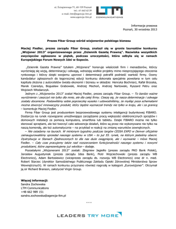 Informacja prasowa Poznań, 30 września 2013 Prezes Fibar Group wśród wizjonerów polskiego biznesu Maciej Fiedler, prezes zarządu Fibar Group, znalazł się w gronie laureatów konkursu „Wizjoner 2013” organizowanego przez „Dziennik Gazetę Prawną”. Nazwiska wszystkich zwycięzców ogłoszono w piątek, podczas uroczystości, która odbyła się w ramach Europejskiego Forum Nowych Idei w Sopocie. „Dziennik Gazeta Prawna” tytułem „Wizjonera” honoruje właścicieli firm i menadżerów, którzy wyróżniają się wizją, determinacją i odwagą, wdrażają wielkie projekty mimo niesprzyjającego otoczenia rynkowego i którzy dzięki swojemu uporowi i determinacji potrafili podnieść wartość firmy. Oceny kandydatur zgłoszonych do tegorocznej edycji konkursu dokonała specjalnie powołana w tym celu kapituła złożona z autorytetów świata ekonomii i biznesu w składzie: Henryka Bochniarz, Rafał Brzoska, Marek Czeredys, Bogusław Grabowski, Andrzej Mochoń, Andrzej Nartowski, Ryszard Petru oraz Wojciech Włodarczyk. Jednym z „Wizjonerów 2013” został Maciej Fiedler, prezes zarządu Fibar Group. – To bardzo ważne wyróżnienie i zaszczyt nie tylko dla mnie, ale dla całej firmy. Cieszę się, że nasza determinacja i odwaga zostały docenione. Postawiliśmy sobie poprzeczkę wysoko i udowodniliśmy, że myśląc poza schematami można stworzyć innowacyjny produkt, który będzie wyznaczał trendy nie tylko w kraju, ale i za granicą – komentuje Maciej Fiedler. Firma Fibar Group jest producentem bezprzewodowego systemu inteligencji budynkowej FIBARO. Dostarcza na rynek rozwiązanie umożliwiające zarządzanie pracą większości elektronicznych sprzętów i domowych instalacji za pomocą komputera, smartfona lub tabletu. Dzięki FIBARO można nie tylko sterować sprzętami, ale też tworzyć całe sekwencje działań, które są przez nie wykonywane nie tylko na naszą komendę, ale też automatycznie – na przykład w reakcji na zmianę warunków zewnętrznych. – Nie osiadamy na laurach. W minionym tygodniu podczas targów CEDIA EXPO w Denver oficjalnie zainaugurowaliśmy sprzedaż naszego systemu w USA – to już 55. rynek, na którym jesteśmy obecni. Dystrybucja w Stanach Zjednoczonych to dla nas duże osiągnięcie, ale i wyzwanie – mówi Maciej Fiedler. – Cały czas pracujemy także nad rozszerzaniem funkcjonalności naszego systemu i nowymi produktami, które zaprezentujemy już wkrótce – dodaje. Pozostałymi „Wizjonerami 2013” zostali: Zbigniew Jagiełło (prezes zarządu PKO Bank Polski), Jarosław Augustyniak (prezes zarządu Idea Bank), Piotr Wojciechowski (prezes zarządu WB Electronics), Adam Bartosiewicz (wiceprezes zarządu ds. rozwoju WB Electronics) oraz dr n. med. Robert Starzec (dyrektor Samodzielnego Publicznego Zakładu Opieki Zdrowotnej Ministerstwa Spraw Wewnętrznych). W ramach konkursu przyznano również nagrodę w kategorii „Eurowizjoner”. Otrzymał ją sir Richard Branson, założyciel Virgin Group. Więcej informacji: Sandra Żochowska LTM Communications +48 662 989 151 [email protected] *** Firma Fibar Group z Poznania to producent bezprzewodowego systemu inteligencji budynkowej FIBARO. Dzięki systemowi FIBARO możemy sterować nie tylko sprzętami RTV i AGD, ale też oświetleniem, poziomem temperatury, roletami, markizami, bramami i furtkami, alarmem oraz systemem monitoringu. Systemem zarządza się za pośrednictwem komputera lub telefonu. Można nim również sterować głosowo za pomocą specjalnej aplikacji LiLi. Określone działania są także automatycznie uruchamiane przez system na podstawie informacji zbieranych przez czujniki oraz GPS. Dzięki temu, iż jest to rozwiązanie bezprzewodowe, instalacja systemu jest zupełnie bezinwazyjna. Firma Fibar Group jest laureatem licznych nagród, między innymi zdobywcą tytułu National Champion w konkursie Euro pean Business Awards 2013/2014, godła Firma Roku 2013, a także – dwukrotnie – tytułu Lider Innowacji i Rozwoju. System inteligentnego domu FIBARO zdobył także pierwszą nagrodę podczas III Wystawy Teletechnika, Nagrodę Polskiej Izby Inżynierów Budownictwa w konkursie na Najlepszy wyrób XI Międzynarodowych Targów Elektrotechnika 2013 oraz nagrodę Złoty Volt za najlepszy produkt elektrotechniczny przyznaną przez Polską Izbę Gospodarczą Elektrotechniki. Centralka Home Center 2 zarządzająca systemem FIBARO zwyciężyła w organizowanym przez TVN Turbo konkursie Męska Rzecz 2012 w kategorii Gadżet i elektronika, a w 2013 r. uzyskała nominację do Polskiego Godła Promocyjnego „Teraz Polska”.