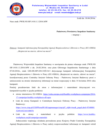 Państw ow y Wojew ódzki Inspektor Sani tarny w Łodzi ul. Wodna 40, 90-046 Łódź telefon: 42 25-36-210, fax: 42 25-36-219 www.pis.lodz.pl e-mail: [email protected] Łódź dn. 18.04.2016r. Nasz znak: PWIS.NS HP.1410.1.3.2016.MW Państwowy Powiatowy Inspektor Sanitarny – wszyscy – Dotyczy: kampanii informacyjnej Europejskiej Agencji Bezpieczeństwa i Zdrowia w Pracy (EU-OSHA) „Bezpieczni na starcie, zdrowi na mecie" Państwowy Wojewódzki Inspektor Sanitarny w nawiązaniu do pisma własnego znak: PWIS.NS HP.1410.1.3.2016.MW z dn. 24.02.2016r. oraz pism Głównego Inspektoratu Sanitarnego z dnia 07.04.2016r., znak: GIS-HS-HP-430-3/EŚ/16/1 dotyczącego kampanii informacyjnej Europejskiej Agencji Bezpieczeństwa i Zdrowia w Pracy (EU-OSHA) „Bezpieczni na starcie, zdrowi na mecie", koordynowanej przez Centralny Instytut Ochrony Pracy - Państwowy Instytut Badawczy prosi o umieszczenie na stronie internetowej informacji na temat rozpoczętej w dniu 14 kwietnia 2016 roku kampanii. Poniżej przedstawiam linki do stron z informacjami i materiałami dotyczącymi ww. kampanii(wszystkie w języku polskim): strona internetowa EU-OSHA: https://osha.europa.eu/pl/healthy-workplaces-campaigns/201617-campaign-healthy-workplaces-all-ages Link do strony Kampanii w Centralnym Instytucie Ochrony Pracy - Państwowy Instytut Badawczy: https://www.ciop.pl/CIOPPortalWAR/appmanager/ciop/pl?_nfpb=true&_pageLabel=P340001 52491452165180076 Link do strony z materiałami w języku polskim: https://www.healthy- workplaces.eu/pl/campaign-materials Jednocześnie wspierając działania prowadzone przez Krajowy Punkt Centralny Europejskiej Agencji Bezpieczeństwa i Zdrowia w Pracy należy rozpowszechniać informacje nt. kampanii wśród 2 małych i średnich przedsiębiorstw przez pracowników pionu higieny pracy w trakcie czynności związanych z bieżącym nadzorem sanitarnym. W szczególności pracowników należy je kierować do przedsiębiorców, którzy swoimi działaniami poprawiają warunki pracy w zakładach pracy i zachęcić ich do udziału w Europejskim Konkursie Dobrych Praktyk. W ramach kolejnej edycji Europejskiego Konkursu Dobrych Praktyk w dziedzinie BHP Europejska Agencja Bezpieczeństwa i Zdrowia w Pracy (EU-OSHA) zaprasza przedsiębiorców do składania wniosków. Zapotrzebowanie na materiały informacyjne i promocyjne kampanii „Bezpieczni na starcie, zdrowi na mecie" można zgłosić przy wykorzystaniu formularza, dostępnego na stronie Centralnego Instytutu Ochrony Pracy w zakładce: Wydarzenia KAMPANIE: https://www.ciop.pl/CIOPPortalWAR/appmanager/ciop/pl?_nfpb=true&_pageLabel=P340001524914 52165180076 lub bezpośrednio pod linkiem: https://www.ciop.pl/CIOPPortalWAR/file/77213/Formularz-zamowienia-materialy-informacyjnekampanii.docx. Szczegółowe informacje nt. prowadzonych działań przez Krajowy Punkt Centralny Europejskiej Agencji Bezpieczeństwa i Zdrowia w Pracy oraz dostępności materiałów promocyjnych można uzyskać pod numerem: (22) 623 36 77 (CIOP-PIB).