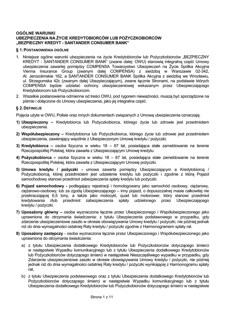OGÓLNE WARUNKI UBEZPIECZENIA NA ŻYCIE KREDYTOBIORCÓW LUB POŻYCZKOBIORCÓW „BEZPIECZNY KREDYT - SANTANDER CONSUMER BANK” § 1. POSTANOWIENIA OGÓLNE 1. Niniejsze ogólne warunki ubezpieczenia na życie Kredytobiorców lub Pożyczkobiorców „BEZPIECZNY KREDYT - SANTANDER CONSUMER BANK” (zwane dalej: OWU) stanowią integralną część Umowy ubezpieczenia zawartej pomiędzy COMPENSA Towarzystwo Ubezpieczeń na Życie Spółka Akcyjna Vienna Insurance Group (zwanym dalej COMPENSA) z siedzibą w Warszawie 02-342, Al. Jerozolimskie 162, a SANTANDER CONSUMER BANK Spółka Akcyjna z siedzibą we Wrocławiu, ul. Strzegomska 42c (zwanym dalej Ubezpieczającym), zwane łącznie Stronami, na podstawie których COMPENSA będzie udzielać ochrony ubezpieczeniowej wskazanym przez Ubezpieczającego Kredytobiorcom lub Pożyczkobiorcom. 2. Wszelkie postanowienia odmienne od treści OWU, pod rygorem nieważności, muszą być sporządzone na piśmie i dołączone do Umowy ubezpieczenia, jako jej integralna część. § 2. DEFINICJE Pojęcia użyte w OWU, Polisie oraz innych dokumentach związanych z Umową ubezpieczenia oznaczają: 1) Ubezpieczony – Kredytobiorca lub Pożyczkobiorca, którego życie lub zdrowie jest przedmiotem ubezpieczenia. 2) Współubezpieczony – Kredytobiorca lub Pożyczkobiorca, którego życie lub zdrowie jest przedmiotem ubezpieczenia, zawierający wspólnie z Ubezpieczonym Umowę kredytu / pożyczki. 3) Kredytobiorca – osoba fizyczna w wieku 18 – 67 lat, posiadająca stałe zameldowanie na terenie Rzeczpospolitej Polskiej, która zawarła z Ubezpieczającym Umowę kredytu. 4) Pożyczkobiorca – osoba fizyczna w wieku 18 – 67 lat, posiadająca stałe zameldowanie na terenie Rzeczpospolitej Polskiej, która zawarła z Ubezpieczającym Umowę pożyczki. 5) Umowa kredytu / pożyczki - umowa zawarta pomiędzy Ubezpieczającym a Kredytobiorcą / Pożyczkobiorcą, której przedmiotem jest udzielenie kredytu lub pożyczki i zgodnie z którą Pojazd samochodowy stanowi przedmiot zabezpieczenia spłaty kredytu lub pożyczki. 6) Pojazd samochodowy - podlegający rejestracji i homologowany jako samochód osobowy, ciężarowy, ciężarowo-osobowy, lub za zgodą Ubezpieczającego – inny pojazd, o dopuszczalnej masie całkowitej nie przekraczającej 6,5 tony, a także jako motocykl, quad lub motorower, który stanowi przedmiot kredytowania i/lub przedmiot zabezpieczenia spłaty udzielonego przez Ubezpieczającego kredytu / pożyczki. 7) Uposażony główny – osoba wyznaczona łącznie przez Ubezpieczonego i Współubezpieczonego jako uprawniona do otrzymania świadczenia: z tytułu Ubezpieczenia podstawowego w przypadku, gdy zdarzenie ubezpieczeniowe zaszło w okresie obowiązywania Umowy kredytu / pożyczki, nie później jednak niż do dnia wymagalności ostatniej Raty kredytu / pożyczki zgodnie z Harmonogramem spłaty rat. 8) Uposażony zastępczy - osoba wyznaczona łącznie przez Ubezpieczonego i Współubezpieczonego jako uprawniona do otrzymania świadczenia: a) z tytułu Ubezpieczenia dodatkowego Kredytobiorców lub Pożyczkobiorców dotyczącego śmierci w następstwie Wypadku komunikacyjnego lub z tytułu Ubezpieczenia dodatkowego Kredytobiorców lub Pożyczkobiorców dotyczącego śmierci w następstwie Nieszczęśliwego wypadku w przypadku, gdy Zdarzenie ubezpieczeniowe zaszło w okresie obowiązywania Umowy kredytu / pożyczki, nie później jednak niż do dnia wymagalności ostatniej Raty kredytu / pożyczki wynikającej z Harmonogramu spłaty rat, b) z tytułu Ubezpieczenia podstawowego oraz z tytułu Ubezpieczenia dodatkowego Kredytobiorców lub Pożyczkobiorców dotyczącego śmierci w następstwie Wypadku komunikacyjnego lub z tytułu Ubezpieczenia dodatkowego Kredytobiorców lub Pożyczkobiorców dotyczącego śmierci w następstwie Strona 1 z 11 Nieszczęśliwego wypadku, gdy Zdarzenie ubezpieczeniowe zaszło po rozwiązaniu Umowy kredytu / pożyczki z tytułu spłaty kredytu / pożyczki, o ile rozwiązanie to nastąpiło przed dniem wymagalności ostatniej Raty kredytu / pożyczki wynikającej z Harmonogramu spłaty rat. Jeżeli w dacie śmierci lub dacie śmierci w wyniku Wypadku komunikacyjnego lub dacie śmierci w wyniku Nieszczęśliwego wypadku Ubezpieczonego lub odpowiednio Współubezpieczonego Uposażony zastępczy nie żyje lub utracił prawo do świadczenia w związku z umyślnym przyczynieniem się do śmierci odpowiednio Ubezpieczonego lub Współubezpieczonego, albo gdy Uposażony zastępczy nie został wskazany, świadczenie spełniane jest na rzecz członków rodziny odpowiednio Ubezpieczonego lub Współubezpieczonego w następującej kolejności: a) małżonek, b) dzieci – w częściach równych, c) rodzice – w częściach równych, d) rodzeństwo - w częściach równych, e) pozostałe osoby będące spadkobiercami Ubezpieczonego lub Współubezpieczonego – w częściach równych, z wyłączeniem gminy ostatniego miejsca zamieszkania Ubezpieczonego oraz Skarbu Państwa. Świadczenie może być spełnione na rzecz osoby wskazanej w kolejnym punkcie, gdy żadna z osób wskazana w punktach poprzedzających nie dożyła dnia śmierci odpowiednio Ubezpieczonego lub Współubezpieczonego lub utraciła prawo do świadczenia w związku z umyślnym przyczynieniem się do śmierci odpowiednio Ubezpieczonego lub Współubezpieczonego. 9) Akt terroryzmu – planowane i zorganizowane działanie pojedynczych osób lub grup skutkujące naruszeniem istniejącego porządku prawnego, podjęte w celu zastraszenia bądź wymuszenia określonych zachowań lub świadczeń od władz państwowych i społeczeństwa, często naruszające lub zagrażające ludzkiemu życiu, zdrowiu lub mieniu. 10) Harmonogram spłat rat kredytu / pożyczki lub Harmonogram spłat rat – dokument stanowiący integralną cześć Umowy kredytu / pożyczki, obowiązujący w dniu objęcia Kredytobiorcy / Pożyczkobiorcy Umową ubezpieczenia, w którym oznaczone zostały d