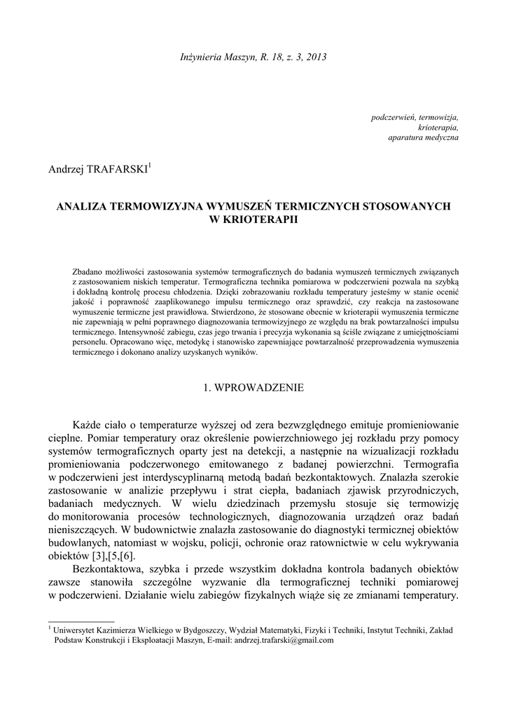 Inżynieria Maszyn, R. 18, z. 3, 2013 podczerwień, termowizja, krioterapia, aparatura medyczna Andrzej TRAFARSKI1 ANALIZA TERMOWIZYJNA WYMUSZEŃ TERMICZNYCH STOSOWANYCH W KRIOTERAPII Zbadano możliwości zastosowania systemów termograficznych do badania wymuszeń termicznych związanych z zastosowaniem niskich temperatur. Termograficzna technika pomiarowa w podczerwieni pozwala na szybką i dokładną kontrolę procesu chłodzenia. Dzięki zobrazowaniu rozkładu temperatury jesteśmy w stanie ocenić jakość i poprawność zaaplikowanego impulsu termicznego oraz sprawdzić, czy reakcja na zastosowane wymuszenie termiczne jest prawidłowa. Stwierdzono, że stosowane obecnie w krioterapii wymuszenia termiczne nie zapewniają w pełni poprawnego diagnozowania termowizyjnego ze względu na brak powtarzalności impulsu termicznego. Intensywność zabiegu, czas jego trwania i precyzja wykonania są ściśle związane z umiejętnościami personelu. Opracowano więc, metodykę i stanowisko zapewniające powtarzalność przeprowadzenia wymuszenia termicznego i dokonano analizy uzyskanych wyników. 1. WPROWADZENIE Każde ciało o temperaturze wyższej od zera bezwzględnego emituje promieniowanie cieplne. Pomiar temperatury oraz określenie powierzchniowego jej rozkładu przy pomocy systemów termograficznych oparty jest na detekcji, a następnie na wizualizacji rozkładu promieniowania podczerwonego emitowanego z badanej powierzchni. Termografia w podczerwieni jest interdyscyplinarną metodą badań bezkontaktowych. Znalazła szerokie zastosowanie w analizie przepływu i strat ciepła, badaniach zjawisk przyrodniczych, badaniach medycznych. W wielu dziedzinach przemysłu stosuje się termowizję do monitorowania procesów technologicznych, diagnozowania urządzeń oraz badań nieniszczących. W budownictwie znalazła zastosowanie do diagnostyki termicznej obiektów budowlanych, natomiast w wojsku, policji, ochronie oraz ratownictwie w celu wykrywania obiektów [3],[5,[6]. Bezkontaktowa, szybka i przede wszystkim dokładna kontrola badanych obiektów zawsze stanowiła szczególne wyzwanie dla termograficznej techniki pomiarowej w podczerwieni. Działanie wielu zabiegów fizykalnych wiąże się ze zmianami temperatury. ____________ 1 Uniwersytet Kazimierza Wielkiego w Bydgoszczy, Wydział Matematyki, Fizyki i Techniki, Instytut Techniki, Zakład Podstaw Konstrukcji i Eksploatacji Maszyn, E-mail: [email protected] 67 Analiza termowizyjna wymuszeń termicznych stosowanych w krioterapii Stosowane w dzisiejszej medycynie oraz fizykoterapii wymuszenia można podzielić na grupy: mechaniczne, chemiczne i termiczne [9]. W artykule poruszony zostanie temat wymuszeń termicznych stosowanych obecnie w medycynie rehabilitacyjnej i sportowej [11]. Na poprawność diagnozowania systemami termograficznymi wpływa wiele czynników począwszy od impulsu termicznego stanowiącego wymuszenie, poprzez odpowiednie przygotowanie obiektu do procesu chłodzenia i badania, a kończąc na stanowisku pomiarowym i metodyce pomiaru. W chwili obecnej stosowane w zabiegach wymuszenia nie zapewniają w pełni poprawnego diagnozowania termowizyjnego ze względu na brak powtarzalności impulsu termicznego. Jego intensywność, czas trwania i precyzja wykonania są ściśle związane z umiejętnościami personelu. Opracowano więc metodykę oraz stanowisko zapewniające powtarzalność przeprowadzenia wymuszenia termicznego. 2. RADIACYJNY POMIAR TEMPERATURY Radiacyjny pomiar temperatury związany jest z pomiarem mocy promieniowania elektromagnetycznego emitowanego przez mierzony obiekt o danej temperaturze. Do prowadzonych badań zastosowano bierny układ pomiarowy, który nie oddziałuje na obiekt pomiaru. W przypadku układów pracujących z pobudzeniem i rejestrujących reakcję (odpowiedź) na wymuszenie mamy do czynienia z układami czynnymi. Radiacyjnych pomiarów temperatury możemy dokonać używając pirometrów oraz kamer termograficznych. Pirometry podają uśrednioną wartość mierzonej temperatury z danej powierzchni obiektu. Kamery termograficzne natomiast przedstawiają rozkład pól temperaturowych na powierzchni badanego obiektu [4],[5]. Działanie systemów termograficznych związane jest z detekcją i rejestracją promieniowania podczerwonego, wysyłanego przez badany obiekt. Pierwsze systemy termowizyjne miały pojedynczy detektor (punktowy) (rys. 1.a), następne zostały wyposażone w detektor linijkowy (rys. 1.b) oraz układy skanujące. a) b) c) Rys. 1. Powstawanie obrazu termalnego w zależności od rodzaju detektora: a) detektor pojedynczy – system skanowania nawrotnego, wiersz po wierszu; b) linijka detektorów – skanowanie poziome wierszy; c) matryca detektorów – brak skanowania Fig. 1. The way of formation of thermogram in dependence of kind of IR detectors: a) the individual detectors – canning, b) the line of detectors – scanning, c) the matrix of detectors – no need of scanning 68 Andrzej TRAFARSKI Na początku lat dziewięćdziesiątych XX wieku zbudowano matrycę detektorów, co automatycznie wyeliminowało potrzebę skanowania [5]. W badaniach użyto kamer termowizyjnych, które wyposażone są w matrycę detektorów o wymiarze 320 x 240 – FLIR ThermaCAM S.C.2000 oraz 640 x 480 – FLIR ThermaCAM S.C.640. Każdemu detektorowi w mozaice detektorów (rys. 1.c) odpowiada konkretny piksel powstałego w ten sposób obrazu termalnego (termogramu). Pozwala ona na równoczesny pomiar natężenia promieniowania z całego obszaru obrazowanego obiektu z dużą prędkością. Sygnał z detektora, poprzez odpowiednie układy elektroniczne, zostaje przetworzony i złożony w obraz w widzialnym obszarze widma fal elektromagnetycznych. Otrzymuje się w ten sposób czarno-białe lub barwne obrazy termalne (termogramy) niewidzialnego promieniowania podczerwonego, w których luminancja lub barwa światła widzialnego odpowiada określonym wartościom mocy promieniowania wysyłanego przez badane ci