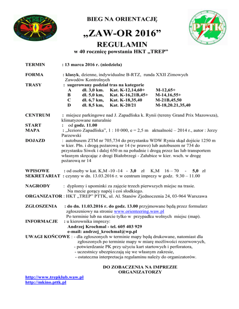 BIEG NA ORIENTACJĘ „ZAW-OR 2016” REGULAMIN w 40 rocznicę powstania HKT „TREP” TERMIN : 13 marca 2016 r. (niedziela) FORMA : klasyk, dzienne, indywidualne B-RTZ, runda XXII Zimowych Zawodów Kontrolnych : sugerowany podział tras na kategorie A dł. 3,0 km. Kat. K-12,14,60+ M-12,65+ B dł. 5,0 km, Kat. K-16,21B,45+ M-14,16,55+ C dł. 6,7 km, Kat. K-18,35,40 M-21B,45,50 D dł. 8,5 km, Kat. K-20/21 M-18,20.21,35,40 TRASY CENTRUM START MAPA DOJAZD : miejsce parkingowe nad J. Zapadliska k. Rynii (tereny Grand Prix Mazowsza), klimatyzowane naturalnie : od godz. 11.00 : „Jezioro Zapadliska”, 1 : 10 000, e = 2,5 m aktualność – 2014 r., autor : Jerzy Parzewski : autobusem ZTM nr 705,734 do przystanku WDW Rynia skąd dojście 1250 m w kier. Płn. i drogą pożarową nr 14 (w prawo) lub autobusem nr 734 do przystanku Siwek i dalej 650 m na południe i drogą przez las lub transportem własnym skręcając z drogi Białobrzegi - Załubice w kier. wsch. w drogę pożarową nr 14 WPISOWE : od osoby w kat. K,M -10 -14 - 3,0 zł K,M 16 – 70 - 5,0 zł SEKRETARIAT : czynny w dn. 13.03.2016 r. w centrum imprezy w godz. 9.30 – 11.00 NAGRODY : dyplomy i upominki za zajęcie trzech pierwszych miejsc na trasie. Na mecie gorący napój i coś słodkiego. ORGANIZATOR : HKT „TREP” PTTK, ul. Al. Stanów Zjednoczenia 24, 03-964 Warszawa ZGŁOSZENIA : do dn. 11.03.2016 r. do godz. 13.00 przyjmowane będą przez formularz zgłoszeniowy na stronie www.orienteering.waw.pl Po terminie lub na starcie tylko w przypadku wolnych miejsc (map). INFORMACJE : u kierownika imprezy: Andrzej Krochmal - tel. 605 403 929 e-mail: [email protected] UWAGI KOŃCOWE : - dla zgłoszonych w terminie mapy będą drukowane, natomiast dla zgłoszonych po terminie mapy w miarę możliwości rezerwowych, - potwierdzanie PK przy użyciu kart startowych i perforatora, - uczestnicy ubezpieczają się we własnym zakresie, - ostateczna interpretacja regulaminu należy do organizatorów. DO ZOBACZENIA NA IMPREZIE ORGANIZATORZY http://www.trepklub.waw.pl http://mkino.pttk.pl