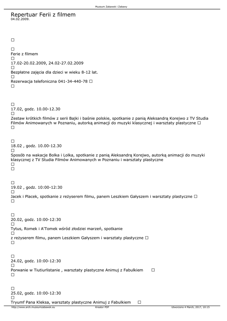 Muzeum Zabawek i Zabawy Repertuar Ferii z filmem 04.02.2009. Ferie z filmem 17.02-20.02.2009, 24.02-27.02.2009 Bezpłatne zajęcia dla dzieci w wieku 8-12 lat. Rezerwacja telefoniczna 041-34-440-78 17.02, godz. 10.00-12.30 Zestaw krótkich filmów z serii Bajki i baśnie polskie, spotkanie z panią Aleksandrą Korejwo z TV Studia Filmów Animowanych w Poznaniu, autorką animacji do muzyki klasycznej i warsztaty plastyczne 18.02 , godz. 10.00-12.30 Sposób na wakacje Bolka i Lolka, spotkanie z panią Aleksandrą Korejwo, autorką animacji do muzyki klasycznej z TV Studia Filmów Animowanych w Poznaniu i warsztaty plastyczne 19.02 , godz. 10:00-12:30 Jacek i Placek, spotkanie z reżyserem filmu, panem Leszkiem Gałyszem i warsztaty plastyczne 20.02, godz. 10:00-12:30 Tytus, Romek i A'Tomek wśród złodziei marzeń, spotkanie z reżyserem filmu, panem Leszkiem Gałyszem i warsztaty plastyczne 24.02, godz. 10:00-12:30 Porwanie w Tiutiurlistanie , warsztaty plastyczne Animuj z Fabulkiem 25.02, godz. 10:00-12:30 Tryumf Pana Kleksa, warsztaty plastyczne Animuj z Fabulkiem http://www.arch.muzeumzabawek.eu Kreator PDF Utworzono 4 March, 2017, 10:15 Muzeum Zabawek i Zabawy 26.02, godz. 10:00-12:30 Tajemnica Wiklinowej Zatoki, spotkanie z reżyserem filmu Wiesławem Ziębą i warsztaty plastyczne 27.02 , godz. 10:00-12:30 Rycerzyk Czerwonego Serduszka +spotkanie z panem Wiesławem Ziębą, z warszawskiego Studia Miniatur Filmowych i warsztaty plastyczne http://www.arch.muzeumzabawek.eu Kreator PDF Utworzono 4 March, 2017, 10:15