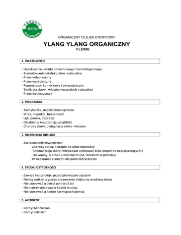 ORGANICZNY OLEJEK ETERYCZNY YLANG YLANG ORGANICZNY FLE096 1. WŁAŚCIWOŚCI - Uspokojenie układu oddechowego i kardiologicznego - Stymulowanie intelektualne i seksualne - Przeciwdepresyjny - Przeciwarytmiczny - Regenerator komórkowy i antyseptyczny - Tonik dla skóry i włosów (wszystkich rodzajów) - Przeciwcukrzycowy 2. WSKAZANIA - Tachykardia, nadciśnienie tętnicze - Stres, niepokój, bezsenność - Lęk, panika, depresja - Osłabienie impotencja, oziębłość - Choroby skóry, pielęgnacja skóry i włosów 3. INSTRUKCJA OBSŁUGI - Zastosowanie zewnętrzne: - Choroby serca: 3 krople na splot słoneczny - Rewitalizacja skóry: miejscowo aplikować kilka kropel na oczyszczoną skórę - Do wanny: 5 kropli z nośnikiem (np. mlekiem w proszku) - W mieszance z innymi olejkami eterycznymi 4. ŚRODKI OSTROŻNOŚCI - Zawsze testuj olejki przed pierwszym użyciem - Należy unikać czystego stosowania olejku na wrażliwą skórę - Nie stosować u dzieci poniżej 5 lat - Nie należy stosować u kobiet w ciąży - Nie stosować u kobiet karmiących piersią 5. ALERGENY - Benzyl benzoesan - Benzyl salicylan - Eugenol - Farnezol - Geraniol - Isoeugenol - Linalol UWAGA: Wyżej wymienione właściwości, wskazówki i sposoby użycia pochodzą z książek lub stron internetowych odwołujących się do aromaterapii. Zostały one zamieszczone w celach informacyjnych i nie stanowią w żaden sposób informacji medycznych, ani nie angażują naszej odpowiedzialności. Dla każdego zastosowania olejków eterycznych dla celów terapeutycznych należy skonsultować się z lekarzem.
