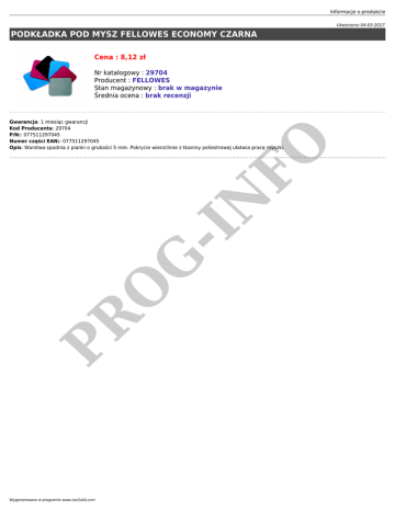 Informacje o produkcie Utworzono 04-03-2017 PODKŁADKA POD MYSZ FELLOWES ECONOMY CZARNA Cena : 8,12 zł Nr katalogowy : 29704 Producent : FELLOWES Stan magazynowy : brak w magazynie Średnia ocena : brak recenzji PR O G -I N FO Gwarancja: 1 miesiąc gwarancji Kod Producenta: 29704 P/N:: 077511297045 Numer części EAN:: 077511297045 Opis: Warstwa spodnia z pianki o grubości 5 mm. Pokrycie wierzchnie z tkaniny poliestrowej ułatwia pracę myszki. Wygenerowano w programie www.oscGold.com