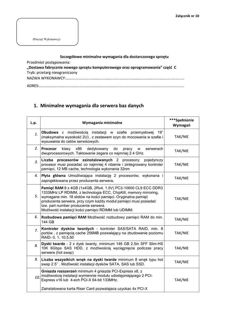 Załącznik nr 10 (Pieczęć Wykonawcy) Szczegółowe minimalne wymagania dla dostarczonego sprzętu Przedmiot postępowania: „Dostawa fabrycznie nowego sprzętu komputerowego oraz oprogramowania” część C Tryb: przetarg nieograniczony NAZWA WYKONAWCY:…………………………………………..…………………………………………….................... ADRES:…………………………………………………………………………............................................................. 1. Minimalne wymagania dla serwera baz danych L.p. Wymagania minimalne 1. Obudowa z moŜliwością instalacji w szafie przemysłowej 19” (maksymalna wysokość 2U) , z zestawem szyn do mocowania w szafie i wysuwania do celów serwisowych. 2. Procesor klasy x86 dedykowany do pracy w serwerach dwuprocesorowych. Taktowanie zegara co najmniej 2.4 GHz. 3. Liczba procesorów zainstalowanych 2 procesory; pojedynczy procesor musi posiadać co najmniej 4 rdzenie i zintegrowany kontroler pamięci, 12 MB cache, technologia wykonania 32nm 4. Płyta główna UmoŜliwiająca instalację 2 procesorów, wykonana i zaprojektowana przez producenta serwera. ***Spełnienie Wymagań TAK/NIE TAK/NIE TAK/NIE TAK/NIE Pamięć RAM 8 x 4GB (1x4GB, 2Rx4, 1.5V) PC3-10600 CL9 ECC DDR3 1333MHz LP RDIMM, z technologia ECC, ChipKill, memory mirroring, 5. wymagane min. 18 slotów na kości pamięci. Oryginalna pamięć producenta serwera, przy czym kaŜdy moduł pamięci musi posiadać tzw. part number producenta serwera. MoŜliwość instalacji kości pamięci RDIMM lub UDIMM. 6. Rozbudowa pamięci RAM MoŜliwość rozbudowy pamięci RAM do min. 144 GB 7. Kontroler dysków twardych - kontroler SAS/SATA RAID, min. 8 portów , z pamięcią cache 256MB pozwalający na zbudowanie poziomu RAID- 0, 1, 10,5,50 8. Dyski twarde - 2 x dysk twardy, minimum 146 GB 2.5in SFF Slim-HS 10K 6Gbps SAS HDD, z moŜliwością wyciągnięcia podczas pracy serwera (hot swap) 9. Liczba wszystkich wnęk na dyski twarde minimum 8 wnęk typu hot swap 2.5’’ . MoŜliwość instalacji dysków SATA, SAS lub SSD. Gniazda rozszerzeń minimum 4 gniazda PCI-Express x8, z 10. moŜliwością instalacji wymiennie modułu udostępniającego 2 PCIExpress x16 lub 4-ech PCI-X 64-bit 133MHz. Zainstalowana karta Riser Card pozwalajaca uzyckac 4x PCI-X TAK/NIE TAK/NIE TAK/NIE TAK/NIE TAK/NIE TAK/NIE 11. TAK/NIE Napęd DVD DVD-RW wewnętrzny 12. Interfejsy sieciowe minimum 4 porty 10/100/1000 wbudowane na płycie głównej. Wsparcie dla TOE – TCP Offload Engine, load balancing i fail over. 13. Procedura przewidywania awarii obejmująca procesory, zasilacze, wentylatory, VRM. dyski, pamięć, TAK/NIE TAK/NIE 14. Zarządzanie serwerem zintegrowany z płytą główna moduł zawierający sterowniki do systemów operacyjnych i oprogramowanie zgodne ze standardem UEFI TAK/NIE Grafika zintegrowana z płytą główną, pamięć minimum 16MB TAK/NIE Zasilacze - 2 zasilacze Hot-Plug o mocy maksymalnie 675W TAK/NIE Wentylatory-zestaw wentylatorów redundantnych typu hot swap min. 3 TAK/NIE 15. 16. 17. 18. Porty dodatkowe min. 5 x USB 2.0 z czego 2 na przednim panelu obudowy, 2 na tylnim panelu obudowy i jeden wewnętrzny, 1 -RJ-45, 2 x VGA, 1 port szeregowy TAK/NIE 19. Wspierane systemy operacyjne - Microsoft Windows Server 2008, Microsoft Windows Server 2003, Red Hat Enterprise Linux 5, SUSE Linux Enterprise Server 11 TAK/NIE Bezpieczeństwo zintegrowany z płytą główną moduł TPM TAK/NIE Gwarancja 36 miesięcy on-site 24x7 24h gwarantowany czas naprawy TAK/NIE 20. 21. Pochodzenie Dostarczony sprzęt musi być fabrycznie nowy, musi pochodzić z oficjalnego kanału sprzedaŜy producenta na rynek polski. Wykonawca 22. dołączy przy dostawie oświadczenie producenta, Ŝe oferowany do przetargu sprzęt spełnia ten wymóg Elementy, z których zbudowane są serwery muszą być produktami producenta tych serwerów lub być przez niego certyfikowane oraz muszą być objęte gwarancją producenta, potwierdzoną przez oryginalne karty gwarancyjne. Oferent zobowiązany jest dostarczyć wraz z ofertą, szczegółową specyfikację techniczną oferowanego sprzętu TAK/NIE 2.Minimalne wymagania dla macierzy dyskowej L.p. ***Spełnienie Wymagań Wymagania minimalne Obudowa 1. − − − − − do instalacji w szafie przemysłowej 19”, wysokość obudowy z kontrolerami macierzy - 2U, wysokość półki dyskowej - 2U, liczba miejsc na instalację dysków w obudowie z kontrolerami macierzy, 12 sztuk, w technologii SATA lub SAS TAK/NIE liczba miejsc na instalację dysków w półce dyskowej 12 sztuk Kontroler RAID 2. − − zainstalowane dwa kontrolery po 1 porcie SAS 3GBPS na kontroler moŜliwość uzyskania funkcjonalności dla dwóch kontrolerów RAID pracujących w trybie active – active redundantnych TAK/NIE Funkcjonalność kontrolerów RAID − − − − 3. − − macierz umoŜliwia rozbudowę i stworzenie konfiguracji odpornej na awarię pojedynczej półki bez utraty danych przy zastosowaniu RAID-5. macierz umoŜliwia rozbudowę i stworzenie fizycznej grupy RAID-5 na 30 dyskach z załoŜeniem, Ŝe maksymalnie pojemność jednego dysku przeznaczona jest na informacje o parzystości (np. 29D+1P). macierz umoŜliwia rozbudowę i stworzenie fizycznej grupy RAID-6 na 30 dyskach z załoŜeniem, Ŝe maksymalnie pojemność dwóch dysków przeznaczona jest na informacje o parzystości (np. 28D+2P). macierz umoŜliwia rozbudowę i stworzenie fizycznej grupy RAID-0 / RAID1/10 na wszystkich dyskach przy pełnym obłoŜeniu macierzy dyskami (48 dysków). macierz umoŜliwia budowanie wolumenów >2TB. rozwiązanie umoŜliwia dynamiczną zmianę następujących parametrów macierzy dyskowej, bez przerywania dostępu do danych znajdujących się na modyfikowanym wolumenie, lub grupie dysków: 1. moŜliwość dynamicznej zmiany poziomu RAID dla istniejącej grupy RAID, 2. moŜliwość dynamicznego dodawania dysków do istniejących grup RAID, 3. moŜliwo