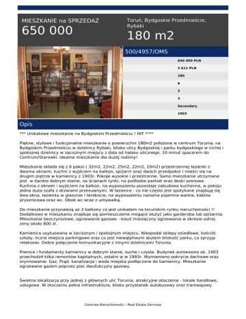 MIESZKANIE na SPRZEDAŻ 650 000 Toruń, Bydgoskie Przedmieście, Rybaki 180 m2 500/4957/OMS 650 000 PLN 3 611 PLN 180 6 2 3 Secondary 1903 Opis *** Unikatowe mieszkanie na Bydgoskim Przedmieściu ! HIT **** Piękne, stylowe i funkcjonalne mieszkanie o powierzchni 180m2 położone w centrum Torunia, na Bydgoskim Przedmieściu w dzielnicy Rybaki, blisko ulicy Bydgoskiej i parku bydgoskiego w cichej i spokojnej dzielnicy w zacisznym miejscu z dala od hałasu ulicznego. 10 minut spacerem do Centrum/Starowki. Idealne mieszkanie dla dużej rodziny! Mieszkanie składa się z 6 pokoi ( 32m2, 22m2, 25m2, 22m2, 10m2) przestrzennej łazienki z dwoma oknami, kuchni z wyjściem na balkon, spiżarni oraz dwóch przedpokoi i mieści się na drugim piętrze w kamienicy z 1903r. Pokoje wysokie i przestronne. Samo mieszkanie utrzymane jest w bardzo dobrym stanie, na ścianach tynki, na podłodze parkiet oraz deski sosnowe. Kuchnia z oknem i wyjściem na balkon, na wyposażeniu pozostaje zabudowa kuchenna, w pokoju jedna duża szafa z drzwiami przesuwnymi. W łazience - co nie często jest spotykane znajdują się dwa okna, łazienka w glazurze i terakocie, na wyposażeniu narożna pojemna wanna, kabina prysznicowa oraz wc. Obok wc wraz z umywalką. Do mieszkanie przynależą aż 3 balkony co jest unikatem na toruńskim rynku nieruchomości !! Dodatkowo w mieszkaniu znajduje się pomieszczenie mogące służyć jako garderoba lub spiżarnia. Mieszkanie bezczynszowe, ogrzewanie gazowe - koszt miesięczny ogrzewania w okresie ostrej zimy około 800 zł. Kamienica usytuowana w zacisznym i spokojnym miejscu. Nieopodal sklepy osiedlowe, kościół, szkoły, liczne miejsca parkingowe oraz co jest niewątpliwym atutem bliskość parku, co sprzyja relaksowi. Dobre połączenie komunikacyjne z innymi dzielnicami Torunia. Piwnice i fundamenty kamienicy w dobrym stanie, suche i czyste. Budynek wzniesiono ok. 1903 przechodził kilka remontów kapitalnych, ostatni w w 1993r. Wymieniono pokrycie dachowe oraz orynnowanie. Gaz, Prąd. kanalizacja i woda miejska podłączone do kamienicy. Mieszkanie ogrzewane gazem poprzez piec dwufukcyjny gazowy. Świetna lokalizacja przy jednej z głównych ulic Torunia, atrakcyjne otoczenie - lokale handlowe, usługowe. W otoczeniu pełna infrastruktura, blisko przystanek autobusowy oraz tramwajowy. Centrala Nieruchomości - Real Estate Services Zapraszam po bliższe informacje. ***************** KAROLINA RUTKOWSKA TEL. 663 899 715 ********* Centrala Nieruchomości: ZAPEWNIAMY BEZPŁATNE I PROFESJONALNE DORADZTWO ZARÓWNO W ZAKRESIE NIERUCHOMOŚCI JAK I POZYSKIWANIU POD NIE KREDYTÓW HIPOTECZNYCH Powyższe informacje zostały sporządzone na podstawie oświadczeń właścicieli i nie są ofertą w rozumieniu przepisów Kodeksu Cywilnego. Mają one jedynie charakter informacyjny. Większość naszych klientów pochodzi z polecenia - ZAUFAJ NAM I TY I NIE CZEKAJ, AŻ KTOŚ CIĘ WYPRZEDZI! Zadzwoń i umów się na prezentację ! Nr licencji pośrednika odpowiedzialnego za wykonanie umowy pośrednictwa 14260. zobacz inne nasze oferty na www.centralanieruchomosci.pl facebook.com/Centrala.N Karolina Rutkowska tel. (+48) 663 899 715 email: [email protected] Centrala Nieruchomości - Real Estate Services Powered by TCPDF (www.tcpdf.org)