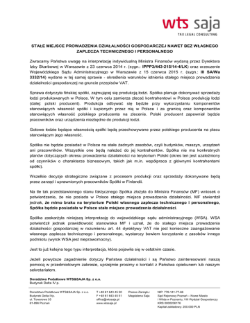STAŁE MIEJSCE PROWADZENIA DZIAŁALNOŚCI GOSPODARCZEJ NAWET BEZ WŁASNEGO ZAPLECZA TECHNICZNEGO I PERSONALNEGO Zwracamy Państwa uwagę na interpretację indywidualną Ministra Finansów wydaną przez Dyrektora Izby Skarbowej w Warszawie z 23 czerwca 2014 r. (sygn.: IPPP3/443-215/14-4/LK) oraz orzeczenie Wojewódzkiego Sądu Administracyjnego w Warszawie z 15 czerwca 2015 r. (sygn.: III SA/Wa 3332/14) wydane w tej samej sprawie - określenia warunków istnienia stałego miejsca prowadzenia działalności gospodarczej na gruncie przepisów VAT. Sprawa dotyczyła fińskiej spółki, zajmującej się produkcją łodzi. Spółka planuje dokonywać sprzedaży łodzi produkowanych w Polsce. W tym celu zamierza zlecać kontrahentowi w Polsce produkcję łodzi (dalej: polski producent). Produkcja odbywać się będzie przy wykorzystaniu komponentów stanowiących własność spółki i kupionych przez nią w Polsce i za granicą oraz komponentów stanowiących własność polskiego producenta na zlecenie. Polski producent zapewniał będzie pracowników oraz urządzenia niezbędne do produkcji łodzi. Gotowe łodzie będące własnością spółki będą przechowywane przez polskiego producenta na placu stanowiącym jego własność. Spółka nie będzie posiadać w Polsce na stałe żadnych zasobów, czyli budynków, maszyn, urządzeń ani pracowników. Wszystkie one będą należeć do jej kontrahentów. Spółka nie ma konkretnych planów dotyczących okresu prowadzenia działalności na terytorium Polski (okres ten jest uzależniony od czynników o charakterze biznesowym, takich jak m.in. współpraca z głównymi kontrahentami spółki). Wszelkie decyzje strategiczne związane z procesem produkcji oraz sprzedaży dokonywane będą przez zarząd i uprawnionych pracowników Spółki w Finlandii. Na tle tak przedstawionego stanu faktycznego Spółka złożyła do Ministra Finansów (MF) wniosek o potwierdzenie, że nie posiada w Polsce stałego miejsca prowadzenia działalności. MF stwierdził jednak, że mimo braku na terytorium Polski własnego zaplecza technicznego i personalnego, Spółka będzie posiadała w Polsce stałe miejsce prowadzenia działalności. Spółka zaskarżyła niniejszą interpretację do wojewódzkiego sądu administracyjnego (WSA). WSA potwierdził jednak prawidłowość stanowiska MF i uznał, że do stałego miejsca prowadzenia działalności gospodarczej w rozumieniu art. 44 dyrektywy VAT nie jest konieczne zaangażowanie własnego zaplecza technicznego i personalnego, wystarczy bowiem korzystanie z zasobów innego podmiotu (wyrok WSA jest nieprawomocny). Jest to już kolejna tego typu interpretacja, która pojawiła się w ostatnim czasie. Jeżeli powyższe zagadnienie dotyczy Państwa działalności i są Państwo zainteresowani naszą pomocą w przedmiotowym zakresie, uprzejmie prosimy o kontakt z Państwa opiekunem lub naszym sekretariatem. Doradztwo Podatkowe WTS&SAJA Sp. z o.o. Budynek Delta IV p. Doradztwo Podatkowe WTS&SAJA Sp. z o.o. Budynek Delta IVp. ul. Towarowa 35 61-896 Poznań T +48 61 643 45 50 F +48 61 643 45 51 [email protected] www.wtssaja.pl Prezes Zarządu: Magdalena Saja NIP: 778-141-77-66 Sąd Rejonowy Poznań – Nowe Miasto i Wilda w Poznaniu, VIII Wydział Gospodarczy KRS 0000206176 Kapitał zakładowy: 200.000 PLN ul. Towarowa 35 61-896 Poznań tel. (+48) 61 643 45 50 fax. (+48) 61 643 45 51 Biuro w Warszawie Budynek ORCO Tower XXII p. Al. Jerozolimskie 81 02-001 Warszawa Powyższy Newsletter stanowi informację o charakterze ogólnym, jego celem jest dostarczenie Państwu na bieżąco informacji o zmianach w prawie podatkowym, interpretacjach organów podatkowych, rozwoju linii orzeczniczej oraz ciekawych komentarzach. Doradztwo Podatkowe WTS&SAJA nie ponosi prawnej odpowiedzialności za żadne działania lub zaniechania podjęte w wyniku powyższych informacji. Doradztwo Podatkowe WTS&SAJA Sp. z o.o. Budynek Delta IVp. ul. Towarowa 35 61-896 Poznań T +48 61 643 45 50 F +48 61 643 45 51 [email protected] www.wtssaja.pl Prezes Zarządu: Magdalena Saja NIP: 778-141-77-66 Sąd Rejonowy Poznań – Nowe Miasto i Wilda w Poznaniu, VIII Wydział Gospodarczy KRS 0000206176 Kapitał zakładowy: 200.000 PLN