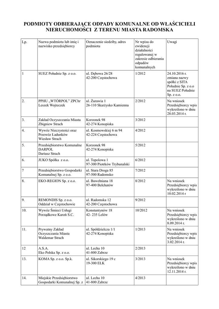PODMIOTY ODBIERAJĄCE ODPADY KOMUNALNE OD WŁAŚCICIELI NIERUCHOMOŚCI Z TERENU MIASTA RADOMSKA Lp. Nazwa podmiotu lub imię i nazwisko przedsiębiorcy Oznaczenie siedziby, adres podmiotu Nr wpisu do Uwagi ewidencji działalności regulowanej w zakresie odbierania odpadów komunalnych 1 SUEZ Południe Sp. z o.o. ul. Dębowa 26/28 42-200 Częstochowa 1/2012 24.10.2016 r. zmiana nazwy spółki z SITA Południe Sp. z o.o na SUEZ Południe Sp. z o.o. 2. PPHU „WTÓRPOL” ZPChr Leszek Wojteczek ul. Żurawia 1 26-110 Skarżysko Kamienna 2/2012 Na wniosek Przedsiębiorcy wpis wykreślono w dniu 28.03.2014 r. 3. Zakład Oczyszczania Miasta Zbigniew Strach Korzonek 98 42-274 Konopiska 3/2012 4. Wywóz Nieczystości oraz Przewóz Ładunków Wiesław Strach ul. Kosmowskiej 6 m 94 42-224 Częstochowa 4/2012 5. Przedsiębiorstwo Komunalne DARPOL Dariusz Strach Korzonek 98 42-274 Konopiska 5/2012 6. JUKO Spółka z o.o. ul. Topolowa 1 97-300 Piotrków Trybunalski 6/2012 7 Przedsiębiorstwo Gospodarki Komunalnej Sp. z o.o. ul. Stara Droga 85 97-500 Radomsko 7/2012 8. EKO-REGION Sp. z o.o. ul. Bawełniana 18 97-400 Bełchatów 8/2012 9. REMONDIS Sp. z o.o. Oddział w Częstochowie ul. Radomska 12 42-200 Częstochowa 9/2012 10. Wywóz Śmieci Usługi Porządkowe Karoń S.C. Konstantynów 18 42- 235 Lelów 10/2012 Na wniosek Przedsiębiorcy wpis wykreślono w dniu 8.09.2014 r. 11. Prywatny Zakład Oczyszczania Miasta Waldemar Strach ul. Spółdzielcza 1/1 42-274 Konopiska 1/2013 Na wniosek Przedsiębiorcy wpis wykreślono w dniu 3.02.2014 r. 12 A.S.A. Eko Polska Sp. z o.o. ul. Lecha 10 41-800 Zabrze 2/2013 13. KOMA Sp. z o.o. Sp.k. ul. Sikorskiego 19 c 19-300 EŁK 3/2013 14. Miejskie Przedsiębiorstwo ul. Lecha 10 Gospodarki Komunalnej Sp. z 41-800 Zabrze 4/2013 Na wniosek Przedsiębiorcy wpis wykreślono w dniu 10.02.2014 r Na wniosek Przedsiębiorcy wpis wykreślono w dniu 12.11.2014 r. o.o. 15. Przedsiębiorstwo Usług Komunalnych Fart Bis Sp. z o.o. ul. Ściegiennego 268 a 25-116 Kielce 1/2015
