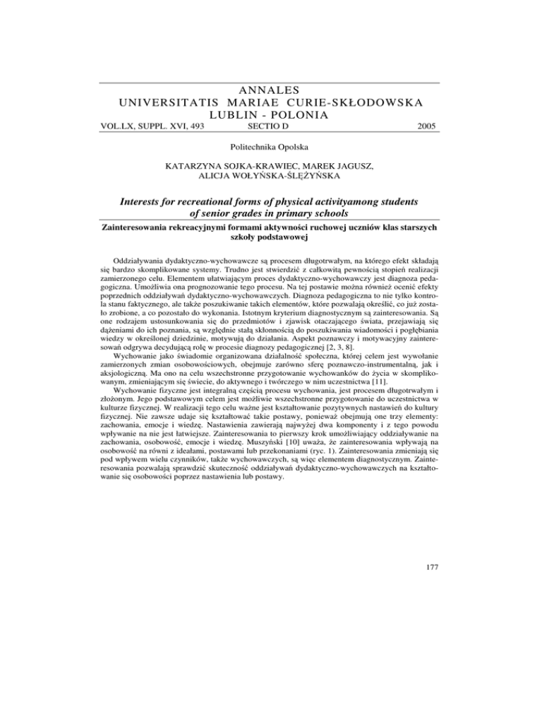 ANNALES UNIVERSITATIS MARIAE CURIE-SKŁODOWSKA LUBLIN - POLONIA VOL.LX, SUPPL. XVI, 493 SECTIO D 2005 Politechnika Opolska KATARZYNA SOJKA-KRAWIEC, MAREK JAGUSZ, ALICJA WOŁYŃSKA-ŚLĘŻYŃSKA Interests for recreational forms of physical activityamong students of senior grades in primary schools Zainteresowania rekreacyjnymi formami aktywności ruchowej uczniów klas starszych szkoły podstawowej Oddziaływania dydaktyczno-wychowawcze są procesem długotrwałym, na którego efekt składają się bardzo skomplikowane systemy. Trudno jest stwierdzić z całkowitą pewnością stopień realizacji zamierzonego celu. Elementem ułatwiającym proces dydaktyczno-wychowawczy jest diagnoza pedagogiczna. Umożliwia ona prognozowanie tego procesu. Na tej postawie można również ocenić efekty poprzednich oddziaływań dydaktyczno-wychowawczych. Diagnoza pedagogiczna to nie tylko kontrola stanu faktycznego, ale także poszukiwanie takich elementów, które pozwalają określić, co już zostało zrobione, a co pozostało do wykonania. Istotnym kryterium diagnostycznym są zainteresowania. Są one rodzajem ustosunkowania się do przedmiotów i zjawisk otaczającego świata, przejawiają się dążeniami do ich poznania, są względnie stałą skłonnością do poszukiwania wiadomości i pogłębiania wiedzy w określonej dziedzinie, motywują do działania. Aspekt poznawczy i motywacyjny zainteresowań odgrywa decydującą rolę w procesie diagnozy pedagogicznej [2, 3, 8]. Wychowanie jako świadomie organizowana działalność społeczna, której celem jest wywołanie zamierzonych zmian osobowościowych, obejmuje zarówno sferę poznawczo-instrumentalną, jak i aksjologiczną. Ma ono na celu wszechstronne przygotowanie wychowanków do życia w skomplikowanym, zmieniającym się świecie, do aktywnego i twórczego w nim uczestnictwa [11]. Wychowanie fizyczne jest integralną częścią procesu wychowania, jest procesem długotrwałym i złożonym. Jego podstawowym celem jest możliwie wszechstronne przygotowanie do uczestnictwa w kulturze fizycznej. W realizacji tego celu ważne jest kształtowanie pozytywnych nastawień do kultury fizycznej. Nie zawsze udaje się kształtować takie postawy, ponieważ obejmują one trzy elementy: zachowania, emocje i wiedzę. Nastawienia zawierają najwyżej dwa komponenty i z tego powodu wpływanie na nie jest łatwiejsze. Zainteresowania to pierwszy krok umożliwiający oddziaływanie na zachowania, osobowość, emocje i wiedzę. Muszyński [10] uważa, że zainteresowania wpływają na osobowość na równi z ideałami, postawami lub przekonaniami (ryc. 1). Zainteresowania zmieniają się pod wpływem wielu czynników, także wychowawczych, są więc elementem diagnostycznym. Zainteresowania pozwalają sprawdzić skuteczność oddziaływań dydaktyczno-wychowawczych na kształtowanie się osobowości poprzez nastawienia lub postawy. 177 Podmiot oddziaływań UCZEŃ OSOBOWOŚĆ Dyspozycje kierunkowe Dyspozycje instrumentalne ideały, postawy, upodobania, zamiłowania, zainteresowania wiedza, inteligencja, uzdolnienia, umiejętności, sprawności Ryc. 1. Struktura osobowości według Muszyńskiego [10] Celem badań było określenie hierarchii zainteresowań wybranymi formami aktywności ruchowej w kontekście różnic wynikających z płci i warunków do wychowania fizycznego, sportu i rekreacji ruchowej. W szczególności chodziło o odpowiedzi na pytania: 1. Jakie jest uczestnictwo badanej młodzieży w zorganizowanych i niezorganizowanych formach aktywności fizycznej? 2. Czy warunki do wychowania fizycznego, sportu i rekreacji ruchowej determinują zainteresowania aktywnością ruchową? 3. Czy płeć modyfikuje zainteresowania aktywnością ruchową? MATERIAŁ I METODY BADAŃ Podstawową metodą wykorzystaną w badaniach był ankietowy sondaż diagnostyczny. Wykorzystane zostały dwa kwestionariusze ankiety opracowane w Katedrze Dydaktyki AWF we Wrocławiu; jeden dotyczył zainteresowań uczniów aktywnością ruchową, drugi warunków do wychowania fizycznego. Ankietę dotyczącą aktywności ruchowej wypełniali uczniowie podczas lekcji wychowania fizycznego klas VI Szkoły Podstawowej nr 4 w Głuchołazach w roku szkolnym 2002/2003 i 2003/2004. O terminie wypełniania ankiety młodzież była uprzedzona na poprzedniej lekcji wychowania fizycznego. Przed badaniami uczniowie zostali zapoznani z techniką wypełniania ankiety. Uczestniczyło 125 uczniów (60 dziewcząt i 65 chłopców). Badana młodzież pochodzi z tego samego środowiska. Nie zauważa się znaczącej różnicy intelektualnej pomiędzy uczniami. Wszyscy respondenci mieli identyczne warunki pracy. Należy podkreślić, że uczniowie chętnie i z pełną koncentracją wypełniali ankietę. W trakcie wypełniania prowadzący wyjaśniał zgłaszane wątpliwości. Czas nie był ograniczony, ale po 20 minutach wszyscy oddali wypełnione arkusze. Każdy uczeń tworzył własny układ hierarchiczny elementów aktywności ruchowej przedstawionych w ankiecie przez przydzielenie od 1 do 4 lub 5 punktów. Element, który cieszył się największym zainteresowaniem ucznia otrzymywał 1 punkt i stawiany był na pierwszym miejscu, zaś forma aktywności, która najmniej interesowała ucznia była zaszeregowana na ostatnim miejscu z maksymalną ilością punktów. Kwestionariusz dotyczący warunków do wychowania fizycznego był wypełniany przez nauczycieli w tym samym czasie. WYNIKI BADAŃ Na zainteresowania wpływa wiele czynników [11, 13]. Zaliczyć do nich możemy (oprócz wszechobecnych mediów) czynniki środowiskowe, a także warunki materialne umożliwiające lub ograniczające aktywność ruchową zgodną z zainteresowaniami (tab. 1). 178 Tabela 1Warunki do aktywności ruchowej w Głuchołazach Szkolna baza sportowa Sala gimnastyczna (wymiarowa), małe boisko przyszkolne do gier sportowych Miejskie obiekty sportowe stadion z boiskami do piłki nożnej i siatkówki oraz urządzeniami do lekkoatl