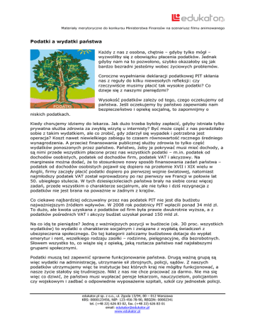 Materiały merytoryczne do konkursu Ministerstwa Finansów na scenariusz filmu animowanego Podatki a wydatki państwa Każdy z nas z osobna, chętnie – gdyby tylko mógł – wyzwoliłby się z obowiązku płacenia podatków. Jednak gdyby nam na to pozwolono, szybko okazałoby się jak bardzo bezradni jesteśmy wobec życiowych problemów. Coroczne wypełnianie deklaracji podatkowej PIT skłania nas z reguły do kilku niewesołych refleksji: czy rzeczywiście musimy płacić tak wysokie podatki? Co dzieje się z naszymi pieniędzmi? Wysokość podatków zależy od tego, czego oczekujemy od państwa. Jeśli oczekujemy by państwo zapewniało nam bezpieczeństwo i opiekę socjalną, to zapomnijmy o niskich podatkach. Kiedy chorujemy idziemy do lekarza. Jak dużo trzeba byłoby zapłacić, gdyby istniała tylko prywatna służba zdrowia za zwykłą wizytę u internisty? Być może część z nas poradziłaby sobie z takim wydatkiem, ale co zrobić, gdy zdarzył się wypadek i potrzebna jest operacja? Koszt nawet niewielkiego zabiegu to czasem równowartość rocznego średniego wynagrodzenia. A przecież finansowanie publicznej służby zdrowia to tylko część wydatków ponoszonych przez państwo. Państwo, żeby je pokrywać musi mieć dochody, a są nimi przede wszystkim płacone przez nas wszystkich podatki – m.in. podatek od dochodów osobistych, podatek od dochodów firm, podatek VAT i akcyzowy. Na marginesie można dodać, że to stosunkowo nowy sposób finansowania zadań państwa – podatek od dochodów osobistych pojawił się dopiero na przełomie XVII i XIX wielu w Anglii, firmy zaczęły płacić podatki dopiero po pierwszej wojnie światowej, natomiast najmłodszy podatek VAT został wprowadzony po raz pierwszy we Francji w połowie lat 50. ubiegłego stulecia. W tych dziesięcioleciach państwa brały na siebie coraz więcej zadań, przede wszystkim o charakterze socjalnym, ale nie tylko i dziś rezygnacja z podatków nie jest brana na poważnie w żadnym z krajów. Co ciekawe najbardziej odczuwalny przez nas podatek PIT nie jest dla budżetu najważniejszym źródłem wpływów. W 2008 rok podatnicy PIT wpłacili ponad 34 mld zł. To dużo, ale kwota uzyskana z podatków od firm była prawie dwukrotnie wyższa, a z podatków pośrednich VAT i akcyzy budżet uzyskał ponad 150 mld zł. Na co idą te pieniądze? Jedną z ważniejszych pozycji w budżecie (ok. 30 proc. wszystkich wydatków) to wydatki o charakterze socjalnym i związane z wypłatą świadczeń z ubezpieczenia społecznego. Do tej kategorii zaliczamy budżetowe dotacje do wypłat emerytur i rent, wszelkiego rodzaju zasiłki – rodzinne, pielęgnacyjne, dla bezrobotnych. Słowem wszystko to, co wiąże się z opieką, jaką roztacza państwo nad najsłabszymi grupami społecznymi. Podatki muszą też zapewnić sprawne funkcjonowanie państwa. Drugą ważną grupą są więc wydatki na administrację, utrzymanie sił zbrojnych, policji, sądów. Z naszych podatków utrzymujemy więc te instytucje bez których kraj nie mógłby funkcjonować, a nasze życie stałoby się trudniejsze. Nikt z nas nie chce pracować za darmo. Nie ma się więc co dziwić, że państwo musi wypłacać pensje lekarzom, nauczycielom, policjantom czy wojskowym i zadbać o odpowiednie wyposażenie szpitali, szkół czy jednostek policji. edukator.pl sp. z o.o., ul. Zgoda 13/94, 00 – 012 Warszawa KRS: 0000123456, NIP: 123-456-78-90, REGON: 00002341 tel. (+48 22) 626 83 02, fax. (+48 22) 626 83 01 email: [email protected] www.edukator.pl Materiały merytoryczne do konkursu Ministerstwa Finansów na scenariusz filmu animowanego Państwo stara się również zapewnić obywatelom warunki do rozwoju – stąd państwo utrzymuje sieć publicznych szkół, służbę zdrowia i instytucje kulturalne, jak większe teatry i muzea. Na te cele przeznacza się około jednej piątej wydatków budżetowych. A przecież to nie jedyna zadania, jakich oczekujemy od państwa. Płacąc podatki utrzymujemy także drogi, którymi przemierzamy każdego dnia kilometry i inwestujemy razem z państwem w budowę nowych czy remonty starych. Skąd państwo miałoby brać na to pieniądze, jeśli nie od podatników? Bez wpływów z podatków państwo byłoby bezradne tak samo jak my, gdybyśmy ich nie płacili. Z drugiej strony im większe środki ma do dyspozycji administracja państwowa, tym lepiej może wywiązywać się ze swoich zadań. I najważniejsza sprawa. Pieniądze publiczne, to w rzeczywistości nasze pieniądze. Dlatego też każdy z nas ma prawo rozliczać państwo z wykorzystania tych potężnych środków. Władzę rozliczamy biorąc udział w wyborach – i tych lokalnych i ogólnokrajowych (wybierając parlament czy prezydenta). Rezygnując z udziału w wyborach de facto rezygnujemy z kontroli nad wydatkami państwa, a więc nad własnymi, ciężko zarobionymi pieniędzmi. edukator.pl sp. z o.o., ul. Zgoda 13/94, 00 – 012 Warszawa KRS: 0000123456, NIP: 123-456-78-90, REGON: 00002341 tel. (+48 22) 626 83 02, fax. (+48 22) 626 83 01 email: [email protected] www.edukator.pl