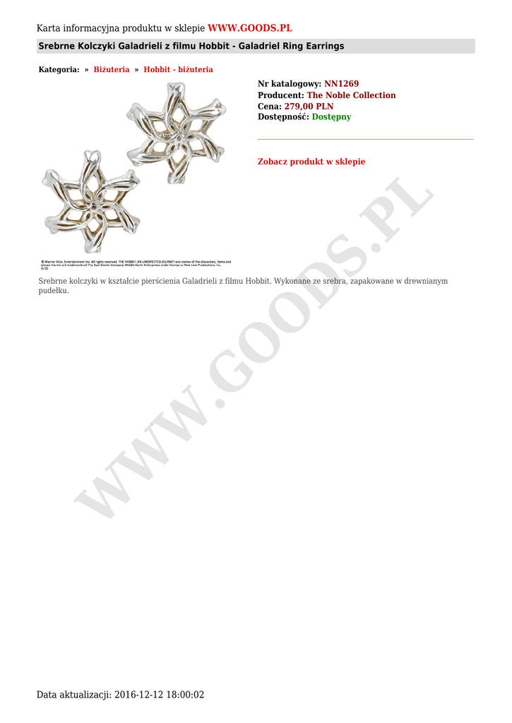 Karta informacyjna produktu w sklepie WWW.GOODS.PL Srebrne Kolczyki Galadrieli z filmu Hobbit - Galadriel Ring Earrings Kategoria: » Biżuteria » Hobbit - biżuteria Nr katalogowy: NN1269 Producent: The Noble Collection Cena: 279,00 PLN Dostępność: Dostępny S. PL Zobacz produkt w sklepie W W W .G O O D Srebrne kolczyki w kształcie pierścienia Galadrieli z filmu Hobbit. Wykonane ze srebra, zapakowane w drewnianym pudełku. Data aktualizacji: 2016-12-12 18:00:02