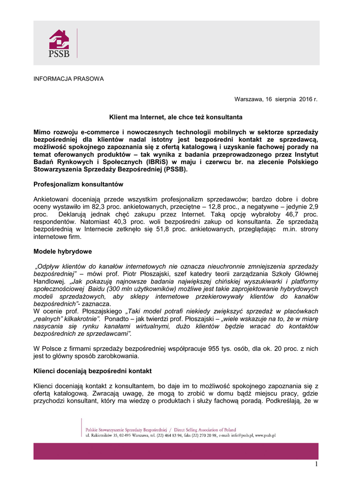 INFORMACJA PRASOWA Warszawa, 16 sierpnia 2016 r. Klient ma Internet, ale chce też konsultanta Mimo rozwoju e-commerce i nowoczesnych technologii mobilnych w sektorze sprzedaży bezpośredniej dla klientów nadal istotny jest bezpośredni kontakt ze sprzedawcą, możliwość spokojnego zapoznania się z ofertą katalogową i uzyskanie fachowej porady na temat oferowanych produktów – tak wynika z badania przeprowadzonego przez Instytut Badań Rynkowych i Społecznych (IBRiS) w maju i czerwcu br. na zlecenie Polskiego Stowarzyszenia Sprzedaży Bezpośredniej (PSSB). Profesjonalizm konsultantów Ankietowani doceniają przede wszystkim profesjonalizm sprzedawców; bardzo dobre i dobre oceny wystawiło im 82,3 proc. ankietowanych, przeciętne – 12,8 proc., a negatywne – jedynie 2,9 proc. Deklarują jednak chęć zakupu przez Internet. Taką opcję wybrałoby 46,7 proc. respondentów. Natomiast 40,3 proc. woli bezpośredni zakup od konsultanta. Ze sprzedażą bezpośrednią w Internecie zetknęło się 51,8 proc. ankietowanych, przeglądając m.in. strony internetowe firm. Modele hybrydowe „Odpływ klientów do kanałów internetowych nie oznacza nieuchronnie zmniejszenia sprzedaży bezpośredniej” – mówi prof. Piotr Płoszajski, szef katedry teorii zarządzania Szkoły Głównej Handlowej. „Jak pokazują najnowsze badania największej chińskiej wyszukiwarki i platformy społecznościowej Baidu (300 mln użytkowników) możliwe jest takie zaprojektowanie hybrydowych modeli sprzedażowych, aby sklepy internetowe przekierowywały klientów do kanałów bezpośrednich”- zaznacza. W ocenie prof. Płoszajskiego „Taki model potrafi niekiedy zwiększyć sprzedaż w placówkach „realnych” kilkakrotnie”. Ponadto – jak twierdzi prof. Płoszajski – „wiele wskazuje na to, że w miarę nasycania się rynku kanałami wirtualnymi, dużo klientów będzie wracać do kontaktów bezpośrednich ze sprzedawcami”. W Polsce z firmami sprzedaży bezpośredniej współpracuje 955 tys. osób, dla ok. 20 proc. z nich jest to główny sposób zarobkowania. Klienci doceniają bezpośredni kontakt Klienci doceniają kontakt z konsultantem, bo daje im to możliwość spokojnego zapoznania się z ofertą katalogową. Zwracają uwagę, że mogą to zrobić w domu bądź miejscu pracy, gdzie przychodzi konsultant, który ma wiedzę o produktach i służy fachową poradą. Podkreślają, że w 1 sprzedaży bezpośredniej zdarzają się zniżki i promocje, ceny produktów bywają niższe niż w sklepach, a produkty są wyższej jakości. Znaczenie ma też możliwość zwrotu produktu bez względu na stopień zużycia oraz dopasowanie oferty do potrzeb i upodobań klienta. Dlaczego klienci cenią sobie kontakt z konsultantem 50% 45% 40% 35% 30% 25% 20% 15% 10% 5% 0% 45,60% 36,70% 26,50% 16,20% 11,80% 11,50% 7,80% Z badania IBRiS wynika, że ze sprzedażą bezpośrednią zetknęło się 65,7 proc. ankietowanych; najczęściej w domu, w miejscu pracy, w centrach handlowych, ale także na ulicy, w szkole bądź na uczelni. Systematycznych lub okazjonalnych zakupów dokonywało 84,2 proc. ankietowanych kobiet i 58,3 proc. mężczyzn. Metryka badań Czas realizacji badania: maj/czerwiec 2016 Miejsce realizacji: badanie ogólnopolskie Metoda: badanie zrealizowane metodą telefonicznych standaryzowanych wywiadów kwestionariuszowych wspomaganych komputerowo (CATI) 2 Próba: losowo – kwotowa, stanowiąca liczebną reprezentację cech demograficznych dla ogółu mieszkańców kraju (dane wg GUS) Wielkość próby: N=1101 3