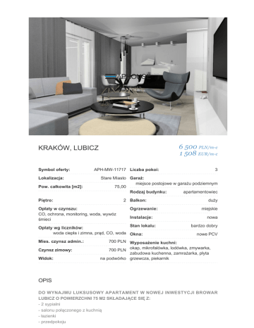 6 500 PLN/m-c 1 508 EUR/m-c KRAKÓW, LUBICZ Symbol oferty: Lokalizacja: Pow. całkowita [m2]: APH-MW-11717 Liczba pokoi: Stare Miasto Garaż: miejsce postojowe w garażu podziemnym 75,00 Rodzaj budynku: apartamentowiec Piętro: 2 Balkon: Opłaty w czynszu: CO, ochrona, monitoring, woda, wywóz śmieci Ogrzewanie: Instalacje: Stan lokalu: Opłaty wg liczników: woda ciepła i zimna, prąd, CO, woda Okna: Mies. czynsz admin.: Czynsz zimowy: Widok: 3 duży miejskie nowa bardzo dobry nowe PCV 700 PLN Wyposażenie kuchni: 700 PLN okap, mikrofalówka, lodówka, zmywarka, zabudowa kuchenna, zamrażarka, płyta na podwórko grzewcza, piekarnik OPIS DO WYNAJMU LUKSUSOWY APARTAMENT W NOWEJ INWESTYCJI BROWAR LUBICZ O POWIERZCHNI 75 M2 SKŁADAJĄCE SIĘ Z: - 2 sypialni - salonu połączonego z kuchnią - łazienki - przedpokoju - balkonu - osobnej toalety Apartament wykończony i wyposażony w wysokim standardzie z dbałością o każdy szczegół. Aranżacja apartamentu wykonana wg. projektu architekta. Salon połączony z otwarta kuchnią. Wyposażenie kuchni w wysokiej klasy sprzęt AGD( lodówka z zamrażalnikiem, płyta grzewcza, piekarnik, zmywarka. Wydzielona barem część jadalniana. Salon z wygodną narożną sofą i stolikiem kawowym. W jednej z sypialni podwójne łóżko oraz pełna zabudowa szaf. Druga sypialnia zaaranżowana pod gabinet.Wyposażenie wysokiej jakości. Nowoczesna łazienka oraz osobna toaleta. W przedpokoju dodatkowa garderoba. Dodatkowym autem jest balkon przynależny do mieszkania. Mieszkanie ciche, jasne, przestronne. Apartament dostępny od października 2016 OPIS INWESTYCJI: Inwestycja Browar Lubicz położona tuż przy Rynku Głównym. Odrestaurowane budynki z XIX wieku w tym Pałac Goetzów. Parking podziemnym oraz punkty handlowo - usługowe na parterze. Nowoczesna restauracja i bar w zabytkowych dawnych wnętrzach browaru gdzie ponad 100 lat temu warzono w Galicji piwo. Niepowtarzalny klimat połączenia tradycji z nowoczesnością. Całość ma otwarty charakter ale inwestycja jest monitorowany z 24h ochroną. W nowych budynkach mieszkańcy mają do dyspozycji ogródki i tarasy. Mieszkania wyposażone w klimatyzacje. Częścią projektu Browar Lubicz będzie również nowoczesny biurowiec. Inwestycja położona parę minut od Starego Miasta gdzie tętni życie Krakowa. Blisko również do Dworca Głównego skąd kolejką można dostać się bezpośrednio na lotnisko. Pełna komunikacja miejska w pobliżu. Inwestycja z dużą ilością zieleni jak i placem zabaw dla dzieci. OPIS LOKALIZACJI: Inwestycja Browar Lubicz położona parę minut od Rynku Głównego gdzie tętni życie Krakowa. Blisko Galeria Krakowska oraz Dworzec Główny. Komunikacja blisko zarówno tramwajowa jak i autobusowa. CENA: 6500 zł+ 700 zł opłaty administracyjne w których są zaliczki za ogrzewanie, ciepłą wodę, ochronę, utrzymanie części wspólnych + prąd oraz internet wg zużycia. KONTAKT Marek Cygal +48 795 184 428 [email protected]
