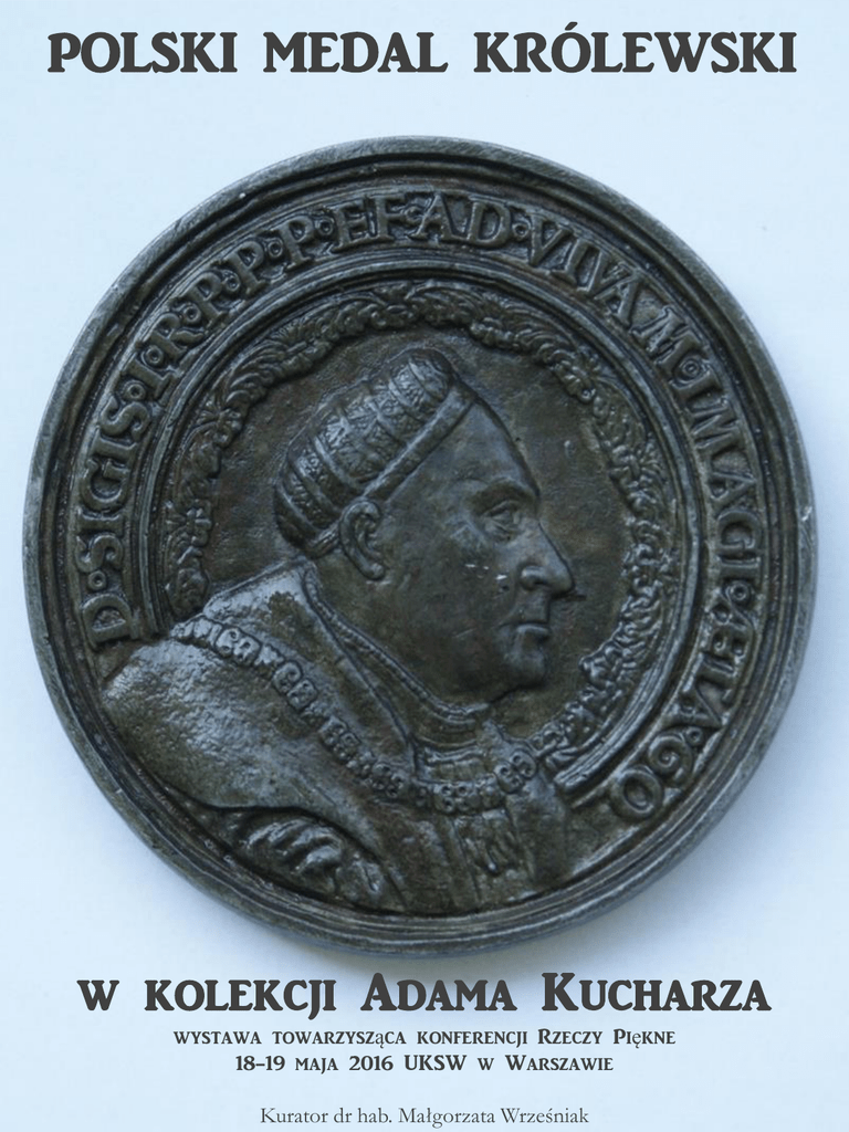 POLSKI MEDAL KRÓLEWSKI w kolekcji Adama Kucharza wystawa towarzysząca konferencji Rzeczy Piękne 18-19 maja 2016 UKSW w Warszawie Kurator dr hab. Małgorzata Wrześniak Dzieje parlamentaryzmu polskiego w medalierstwie kolekcja medali Adama Kucharza Gromadzona od początku lat 90. XX wieku kolekcja pamiątek związanych z dziejami parlamentaryzmu polskiego obejmuje znaczący zbiór medali. Znajdują się w niej medale przedstawiające posłów i senatorów I Rzeczpospolitej, zasiadających w parlamentach państw zaborczych (rosyjska Duma, parlament pruski w Berlinie, parlament wiedeński), zasiadających ciałach o charakterze ustawodawczym pod kuratelą zaborców (sejm Królestwa Polskiego, krajowy sejm galicyjski), członków obu izb w okresie II Rzeczypospolitej (w tym Sejmu Śląskiego), członków ciał o charakterze ustawodawczym w okupowanym kraju i na obczyźnie, Krajowej Rady Narodowej, a później kolejnych kadencji Sejmu PRL, członków obu izb III Rzeczpospolitej. W kolekcji znalazły się też medale prezentujące miejsca obrad Sejmu, Senatu i sejmików generalnych (Zamek królewskie w Warszawie i Piotrkowie, Wawel, zamek w Lublinie, ratusz w Toruniu, kościół św. Mikołaja w Grudziądzu itp.), a także ukazujące prace Sejmu i Senatu, szczególnie wyniki procesu legislacyjnego, gdzie rzecz jasna dominuje temat konstytucji (tak w kraju jak i w środowiskach polonijnych wybito znaczną liczbę medali z okazji setnej rocznicy uchwalenia Konstytucji 3-go Maja). Do zbioru należą też medale okolicznościowe upamiętniające ważne wydarzenia z życia parlamentu (uchwalenie wydania dzieł wszystkich Jana Kochanowskiego, wizyta Jana Pawła II, wyjazdowa sesja Sejmu w Gnieźnie itp.). W kolekcji znalazły się również medale królewskie, zwłaszcza przedstawiające wizerunki władców, od Jana I Olbrachta do Stanisława Augusta Poniatowskiego, dlatego, iż poczynając od 1493 roku Król stanowił trzeci stan sejmujący, na równi z Sejmem i Senatem. Polski medal królewski od XVI wieku do dziś W literaturze przedmiotu medal królewski definiuje się jako medal, którego król był zleceniodawcą, odbiorcą lub też jego osoba stała się tematem dzieła. Polski medal królewski pojawił się w okresie panowania Zygmunta I Starego. Inicjatywa zaproszenia na dwór królewski i przedstawienia Zygmuntowi I znanego już portrecisty Hansa Schwarza wyszła w 1526 roku od ówczesnego Kanclerza Wielkiego Koronnego Krzysztofa Szydłowieckiego. Uważa się, że Schwartz w czasie pobytu na dworze królewskim wykonał szkice twarzy króla, które następnie wykorzystał przy tworzeniu wizerunku władcy na medalach. Warsztat Schwarza reprezentuje medal (w gablocie nr 6) z łacińskim napisem: Władca Zygmunt I, król Polski, ojciec ojczyzny, przedstawiony wiernie w sześćdziesiątym roku życia. Hans Schwartz opuścił Polskę 1527 roku, ale dwór królewski docenił sztukę medalierską, bowiem już w 1532 roku została zamówiona seria medali rodziny królewskiej u działającego w Polsce Giovanniego Padovano. Nieco później przybyli do Polski z Włoch Giovanni Garaglio – autor medalu Zygmunta I w 1538 roku, i Domenico Veneto, który wykonał w 1548 roku medal Zygmunta II Augusta (w gablocie nr 10). Jest to jedyny znany medal tego artysty, wybity prawdopodobnie okazji objęcia tronu przez Zygmunta Augusta. Wśród działających w Polsce w pierwszej połowie XVI wieku medalierów, warto wymienić jedynego dorównującego poziomem prac artystom zagranicznym, medaliera rodem z Krakowa – Macieja Schillinga, kierownika mennicy toruńskiej, który w 1533 roku wykonał niewielkich rozmiarów medal przedstawiający na awersie popiersie Zygmunta I Starego na rewersie zaś popiersie jego syna Zygmunta II Augusta. W drugiej połowie XVI i na początku XVII wieku obserwuje się w polskim medalierstwie wyraźne wpływy niderlandzkie. Wspomnieć należy w tym miejscu Stevena van Herwijcka z Utrechtu, który przybył do Polski w 1561 roku. Podczas pobytu na dworze królewskim w Wilnie otrzymał on zamówienie na wykonanie serii medalionów portretowych rodziny królewskiej, wśród których na uwagę zasługują stosunkowo duży (89 mm) medalowy portret Zygmunta I Starego, jednostronny wykonany w ołowiu oraz znacznie mniejszy (44 mm) portret Zygmunta II Augusta, dwustronny, wykonany w srebrze. Dziesięcioletnie panowanie Stefana Batorego przynosi szereg medali z wizerunkiem króla. Pochodzą one przeważnie z mennicy wileńskiej, a ich autorzy pozostają anonimowi. Jest to również okres powolnej zmiany techniki wykonywania medali, technika bicia zaczyna wypierać technikę lania. Historycy są zgodni co do faktu, że przeznaczenie medalu królewskiego w Polsce ukształtowało się ostatecznie w epoce Wazów. Zygmunt III zapoczątkował, znany już w starożytności, zwyczaj rozrzucania żetonów, czy medali z okazji ważnych wydarzeń: koronacji, uroczystych wjazdów, zaślubin, pobytów pary królewskiej, względnie króla w znaczących ośrodkach miejskich. Nie dziwi zatem, iż wspomniana epoka zaowocowała dużą ilością medali królewskich. W tym czasie na czele ośrodków artystycznych znalazł się Gdańsk, w którym twórczość medalierska skupiona była przy mennicy miejskiej. Nie sposób w krótkim tekście wymienić wszystkich działających wówczas medalierów, ale wspomnieć trzeba o najwybitniejszych: to Johann Hoehn senior, Johann Hoehn junior oraz Sebastian Dadler. Wspólnym dziełem wymienionych mistrzów: Johanna Hoehna seniora Sebastiana Dadlera jest medal ślubny Jana II Kazimierza (w gablocie nr 26). W czasie panowania Michała Korybuta Wiśniowieckiego i Jana III jedynym wysokiej klasy medalierem w Polsce był Johann Hoehn junior i on też jest autorem ich medalierskich wizerunków (w gablocie nr 30 i 31). Panowanie w Polsce Sasów zbiega się z głębokim kryzysem polskiego medalierstwa, umiera Johann Hoehn junior nie pozostawiając godnych następców. Na usługa