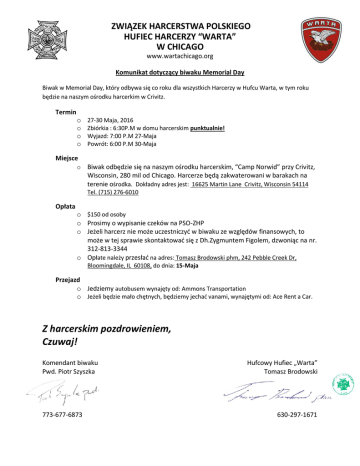 ZWIĄZEK HARCERSTWA POLSKIEGO HUFIEC HARCERZY “WARTA” W CHICAGO www.wartachicago.org Komunikat dotyczący biwaku Memorial Day Biwak w Memorial Day, który odbywa się co roku dla wszystkich Harcerzy w Hufcu Warta, w tym roku będzie na naszym ośrodku harcerkim w Crivitz. Termin o o o o 27-30 Maja, 2016 Zbiórkia : 6:30P.M w domu harcerskim punktualnie! Wyjazd: 7:00 P.M 27-Maja Powrót: 6:00 P.M 30-Maja Miejsce o Biwak odbędzie się na naszym ośrodku harcerskim, “Camp Norwid” przy Crivitz, Wisconsin, 280 mil od Chicago. Harcerze będą zakwaterowani w barakach na terenie ośrodka. Dokładny adres jest: 16625 Martin Lane Crivitz, Wisconsin 54114 Tel. (715) 276-6010 Opłata o $150 od osoby o Prosimy o wypisanie czeków na PSO-ZHP o Jeżeli harcerz nie może uczestniczyć w biwaku ze względów finansowych, to może w tej sprawie skontaktować się z Dh.Zygmuntem Figolem, dzwoniąc na nr. 312-813-3344 o Opłate należy przesłać na adres: Tomasz Brodowski phm, 242 Pebble Creek Dr, Bloomingdale, IL 60108, do dnia: 15-Maja Przejazd o Jedziemy autobusem wynajęty od: Ammons Transportation o Jeżeli będzie mało chętnych, będziemy jechać vanami, wynajętymi od: Ace Rent a Car. Z harcerskim pozdrowieniem, Czuwaj! Komendant biwaku Pwd. Piotr Szyszka 773-677-6873 Hufcowy Hufiec „Warta” Tomasz Brodowski 630-297-1671 ZWIĄZEK HARCERSTWA POLSKIEGO pgK HUFIEC HARCERZY “WARTA”, CHICAGO, IL POLISH SCOUTING ORGANIZATION ZHP, INC. BOYS’ DIVISION INFORMACJE DLA RODZICÓW PARENT INFORMATION NOTICE DRUŻYNOWY: 1. Wypełnia wszystkie informacje i podpisuje. 2. Daje do podpisu i zatwierdzenia hufcowego lub jego zastępca. 3. Robi kopie i rozdaje na zbiórce wraz ze zgłoszeniem. 4. Dodatkowo może być dołączona lista ekwipunku i regulamin wyprawy. (Troop Leader: 1. Fills out all the information and signs the form; 2. Gives the form for approval and signature to Council Director or designee; 3. Makes copies to pass out at meeting together with the parental permission slips; 4. Additional letters listing regulations and needed equipment may be attached.) Wyprawa X Activity Dokąd Where to Biwak Bivouac Wycieczka Nocowanie Field trip Camp Norwid Osrodek Harcerski Podać dokładny adres oraz nr. telefonu Sleepover Data (od/do) Date (from/to) 05/27/16 - 05/30/16 Location, address and tel. no 16625 Martin Lane Crivitz, Wisconsin (715) – 276 - 6010 Komendant wyprawy pwd. Pitor Szyszka nr. tel. 773-677-6873 Inne opiekuni wyprawy phm. Tomasz Brodowski nr. tel. 630-297-1671 Trip Leader Other leaders on trip Tel. Tel. nr. tel. Tel. hm. Zygmunt Figol 312-813-3344 Wyjazd data 05/27/16 godzina 7:00 PM z miejsca Dom Harcerski Przyjazd data 05/30/16 godzina 8:00 PM na miejsce Dom Harcerski Departure Return date date Jedziemy time time from to Autobusem firmy Ammons Transportation Travel by CTA/METRA Bus – name of company X Wypożyczonymi van’ami Dominik Pilch, Zygmunt Figol, (Ace Rent a Car) Rented vans Imię i nazwisko kierowcy (min. 25 lat) Name of driver (must be 25 or over) Inne / Other - LUB - or - Rodzice sami mogą dowieźć i odebrać dziecko na miejsce wyprawy. Przewieźć data godzina Parents can drop off and pick up the child at the activity. Odebrać z miejsca Drop off date time Pick up date time data Koszt wyprawy $ place godzina 150 Cost na miejsce place Proszę wystawić czek na Make checks payable to PSO-ZHP, Inc. Przynieść opłatę i zgłoszenie na zbiórkę dnia Bring permission slip and fee to the meeting on date X Przesłać zgłoszenie i opłatę do dnia Mail permission slip and fee before date listed above 05/15/16 do to phm. Tomasz Brodowski 242 Pebble Creek Dr. Bloomingdale, IL 60108 Podpis Komendanta Signature of Trip Leader 04/01/16 Data Date Podpis Hufcowego lub jego zastępca/namiestnika Signature of Council Director or designee 04/01/16 Data Date Formularz A ZWIĄZEK HARCERSTWA POLSKIEGO pgK HUFIEC HARCERZY “WARTA”, CHICAGO, IL POLISH SCOUTING ORGANIZATION ZHP, INC. BOYS’ DIVISION ZGŁOSZENIE -- PARENTAL PERMISSION Daję pozwolenie memu dziecku I hereby give permission for my child/ward Imię i nazwisko (Uczestnik 21 lat lub wyżej wypełnia sama za siebie. Data urodzenia Date of birth wiek Name Participant 21 years of age or older fills the form out for herself.) miejsce age Tel. domowy place of birth Home tel. Adres Miasto Address Jednostka State Stopień Troop name Rank na wzięcie udziału Memorial Day Biwak dnia 05/27/16 - 05/30/16 to participate in pod opieką Stan City date phm. Tomasz Brodowski, hm. Zygmunt Figol under the supervision of the leader in charge w Crivitz, Wisconsin Imię i nazwisko komendanta, stopień Miejscowość Imię i nazwisko ojca Tel. kontaktowy Imię i nazwisko matki Tel. kontaktowy Father’s name location Contact no. Mother’s name W razie wypadku, jeżeli rodziców nie będzie w domu, proszę powiadomić: Imię i nazwisko Contact no. In case of emergency, if parents are not home, please notify: Tel. Name Pokrewieństwo Tel. Relationship Informacje medyczne / alergie Health information / allergies Zażywa lekarstwa codziennie – nazwa, kiedy, dawka Takes the following medication on regular basis – name of medicine, time, dosage Nazwa firmy ubezpieczeniowej załączyć kopię obydwu stron karty ubezpieczeniowej Family Medical Insurance Carrier – attach a copy of both sides of insurance card. BEZ UBEZPIECZENIA – NO HEALTH INSURANCE Dziecko moje nie posiada ubezpieczenia. Załączam formularz podstęplowany przez notariusza potwierdzający ten fakt. My child does not have health insurance. I am attaching a notarized form atesting to such fact. podpis rodzica signature of parent Waiver of Liability: I give permission to my child named on this form, to take part in the named activity. I waive any claim, demand or cause of action, legal or equitable against its Officers and staff for any injuries to my child that might be sustained by her/him during the period of the program. I also give permission to the physician select