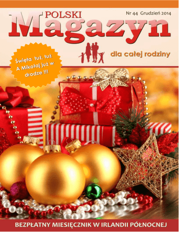 Nr 44 Grudzień 2014 ż, tuż u t a t Świę już w j a ł o k A Mi !!! e z d o r d Zdrowych, pogodnych Świąt Bożego Narodzenia oraz spełnienia marzeń w nadchodzącym Nowym Roku życzą: www.polskieni.com Redakcja i wydawca nie ponoszą żadnej odpowiedzialności prawnej za treść wszystkich opublikowanych artykułów, za treść ogłoszeń, reklam i informacji. Magazyn ma za zadanie jedynie umilić Państwu czas i wiadomości w nim zawarte nie mogą stanowić podstawy do jakichkolwiek roszczeń. Redakcja nie zwraca nadesłanych materiałów i zastrzega sobie prawo do ich skracania bądź redagowania. Nadesłane materiały przechodzą na własność redakcji, co oznacza przeniesienie praw autorskich i praw do publikacji na redakcję. Redakcja Polskiego Magazynu Zarząd Polish NI Community Network Polska Szkoła Sobotnia w Craigavon oraz admistratorzy serwisu wwww.polskieni.com Kilka słów na wstępie: UK news. Moim zdaniem z humorem. Długie czekanie - dobre śniadanie. Zły mężczyzna z niegrzeczną kobietą. Szablon: chatka z piernika. Aktualności wędkarskie. Przepis na sukces. Kącik dla dzieci i młodzieży. Horoskop na grudzień. Angielski na codzień. Reklama. Polski Magazyn wspierany jest przez: Tematy warte uwagi: 6 Wszyscy kochamy święta Bożego Narodzenia. Nie ma chyba osoby, która powiedziałaby, że nie lubi świąt a przynajmniej ja takowej nie znam. Święta kojarzymy nie tylko z prezentami, ale i z rodziną. Często narzekamy, że obecne świętowanie nie ma nic wspólnego z tym sprzed lat. Wielu z nas uważa, iż chociaż kiedyś panował niedostatek a zakup towarów sprawiał wiele trudności, a i Mikołaj przynosił znacznie skromniejsze prezenty, to klimat tamtych świąt był niepowtarzalny. Czy ta nostalgia jest tylko przejawem idealizowania czasów własnego dzieciństwa i młodości, czy też faktycznie zatraciliśmy nieco zdolność budowania takiego nastroju świątecznego, jaki potrafili wytworzyć nasi rodzice czy dziadkowie? Kiedyś to były święta...Wigilia miała zwiastować pomyślność albo jej brak w nadchodzącym roku, toteż przysłowia i porzekadła doradzały a wręcz nakazywały roztropne przeżycie tego dnia. Wszyscy podrywali się już o świcie pamiętając, że: „kto w Wigilię ospały, taki też przez rok cały". Cały dzień, aż do wieczerzy, unikano wszelakich kłótni, zabiegając o pozytywne zwiastuny niedalekiej przyszłości. Nasze mamy i babcie krzątały się od samego rana po kuchni, przygotowując potrawy na wieczerzę. W zależności od zamieszkiwanego regionu serwowano barszcz, zupę grzybową lub zupę rybną. Na żadnym stole z pewnością nie zabrakło ryby, śledź, karp, sandacz albo szczupak to najpopularniejsze z nich. Na wigilijnym stole nie mogło zabraknąć kapusty z grzybami albo grochem no i oczywiście słodkich rarytasów: kluski z makiem, makiełki, kasza jaglana ze śliwkami albo kutia, czyli pszenica lub pęczak z miodem i makiem. Spośród wypieków najważniejsza była strucla, czyli słodka bułka drożdżowa oraz sernik. A jak jest dzisiaj? Wielu z nas stara się dochować tradycji rodzinnego domu choć czasami czasu brak na przygotowanie wszystkiego jak należy. Chcielibyśmy, by czas zatrzymał się choć na moment, niestety to tylko marzenia . Pamiętajcie jednak, iż nie podawane potrawy są tu najważniejsze i że to, jakie będą te święta, zależy tylko od Was. Życzę Wam, żeby były niezapomniane….. Zróbcie fajne, rodzinne zdjęcia i wyślijcie do nas. Te, z których emanować będzie miłość opublikujemy na łamach naszego Magazynu. 5 9 10 Sieć sklepów Poundland zatrudni 6 tys. osób Sieć sklepów Poundland planuje w ciągu najbliższych trzech lat zwiększyć liczbę swoich placówek w Wielkiej Brytanii z 540 do 750 i utworzyć około sześciu tysięcy miejsc pracy. Pierwszym krokiem w tym planie rozwoju firmy w UK jest uruchomienie nowego centrum dystrybucyjnego w Harlow w hrabstwie Essex, które odbyło się 5 listopada 2014 r. Udział w tym wydarzeniu wzięła brytyjska minister ds. zatrudnienia – Esther McVey. Nowe centrum jest największym obiektem Poundlandu, który pomoże w rozwoju firmy nie tylko w Wielkiej Brytanii, ale także w Europie. Długofalowe plany firmy zakładają dalszą ekspansję i otwarcie w samym UK ok. tysiąca sklepów. Przykładowe wakaty i zarobki roczne: analityk informatyczny – 30-35 tysięcy funtów manager sklepu – 20-27 tysięcy funtów manager magazynu – 45-55 tysięcy funtów Źródło: Goniec Polski , Onet.pl Wielka Brytania: Zakaz palenia w samochodach wiozących dzieci. Według doniesień prasy, w Wielkiej Brytanii w przyszłym miesiącu spodziewane jest uchwalenie nowego prawa, zakazującego palenia w samochodzie wiozącym dzieci. Przepis miałby nabrać mocy za niespełna rok, a łamiących zakaz mają czekać horrendalnie wysokie grzywny. Górna granica kary przewidziana w zgłoszonym do konsultacji projekcie wynosi 10 tysięcy funtów. Kierowcy mieliby podlegać karze nie tylko, jeśli sami zapalą papierosa, ale jeśli zrobi to pasażer, któremu grozić ma o wiele niższa, choć też niebagatelna grzywna ośmiuset funtów. W Walii podobne konsultacje przeprowadzono już latem, a zakaz palenia w autach wio- zących dzieci ma zacząć obowiązywać od przyszłego roku. Proponowane grzywny są jednak o wiele niższe 60 funtów. Lobby antynikotynowe w Izbie Gmin przegłosowało już w lutym rezolucję, która wzywa do wprowadzenia całkowitego zakazu palenia w samochodach. Obecne przepisy brytyjskie nie zabraniają tego kierowcom, ale policja ma prawo zakwalifikować palenie jako równoznaczne z niebezpiecznym prowadzeniem pojazdu, podobnie jak zmianę dysku w odtwarzaczu, regulowanie radia, jedzenie lub picie podczas prowadzenia pojazdu. (BS) Onet Lidl uznaje prawo Polaków do mówienia po polsku. W reakcji na list polskiego ambasadora w Londynie, sieć supermarketów Lidl przyznała, że wszyscy jej pracownicy w Wielkiej 