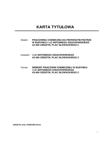 KARTA TYTUŁOWA Obiekt : PRACOWNIA CHEMICZNA NA PIERWSZYM PIĘTRZE W BUDYNKU I LO ANTONIEGO OSUCHOWSKIEGO 43-400 CIESZYN, PLAC SŁOWACKIEGO 2 Inwestor: I LO ANTONIEGO OSUCHOWSKIEGO 43-400 CIESZYN, PLAC SŁOWACKIEGO 2 Temat: REMONT PRACOWNI CHEMICZNEJ W BUDYNKU I LO ANTONIEGO OSUCHOWSKIEGO 43-400 CIESZYN, PLAC SŁOWACKIEGO 2 CIESZYN, dnia: KWIECIEŃ 2012r. 1 SPIS TREŚCI 1. Karta tytułowa 2. Spis treści 3. Opis techniczny 4. Rzut pomieszczenia pracowni – rozmieszczenie mebli 5. Ogólny rzut pomieszczeń 2 OPIS TECHNICZNY OPIS STANU ISTNIEJĄCEGO W budynku I LO Antoniego Osuchowskiego na I piętrze zlokalizowane są pomieszczenia pracowni chemicznej. Istniejące pomieszczenia objęte niniejszym opracowaniem są w średnim stanie technicznym, nie występują widoczne uszkodzenia konstrukcji, pomieszczenia natomiast są wyeksploatowane i zachodzi konieczność wykonania remontu wraz z dostosowaniem do obecnych wymagań i potrzeb jakie musi spełniać pracownia chemiczna. OPIS STANU PROJEKTOWANEGO 1. FORMA ARCHITEKTONICZNA I FUNKCJA Remont pracowni chemicznej projektowano z uwzględnieniem odpowiednich warunków bezpieczeństwa użytkowania, zgodnie z warunkami technicznymi. 2. PROGRAM UŻYTKOWY - powierzchnia użytkowy: 112,40 m2 3. UKŁAD FUNKCJONALNY: Dzięki realizacji zamierzenia remontowego powstanie profesjonalna pracownia do kształcenia młodzieży. 4. ZESTAWIENIE POWIERZCHNI POMIESZCZEŃ: Nr pom. Nazwa pomieszczenia Powierzchnia (m2) Wys. pom. (m) Rodzaj posadzki 1 2 3 4 5 istn. posadzka parkiet gres techniczny gres techniczny wykładzina pcv 01 PRACOWNIA – SALA ZAJĘĆ 61,31 3,94 02 ZAPLECZE PRACOWNI 14,53 3,94 03 SZATNIA 14,78 3,94 04 GABINET NAUCZYCIELA 21,78 3,94 RAZEM 112,40 5. ZAKRES ROBÓT REMONTOWYCH OBEJMUJE: - remont pracowni chemicznej, - remont zaplecza pracowni chemicznej, 3 - remont szatni pracowni chemicznej, - remont gabinetu nauczyciela pracowni chemicznej. 5.1. Zakres robót remontowych w pomieszczeniu pracowni chemicznej – sala zajęć: - demontaż i rozbiórka istniejącego wyposażenia pomieszczenia wraz z wyniesieniem i wywozem z budynku, - naprawa uszkodzonych ścian, - naprawa i uzupełnienie tynków wewnętrznych, - malowanie sufitów i ścian farba emulsyjną akrylową z przygotowaniem podłoża pod malowanie w kolorze uzgodnionym z użytkownikiem obiektu, - przygotowanie pod malowanie i malowanie stolarki drzwiowej wraz z dopasowaniem i wykonaniem drobnych napraw, - czyszczenie i malowanie grzejników i rur centralnego ogrzewania, - uzupełnienie i miejscowa przekładka posadzki z deszczułek parkietowych, - cyklinowanie, szpachlowanie, gruntowanie i dwukrotne lakierowanie posadzek z parkietu (lakier o dużej wytrzymałości), - wymiana listew przyściennych, - sprawdzenie, udrożnienie przewodów wentylacyjnych wraz z wymianą kratek wentylacyjnych, - wymiana wewnętrznej instalacji elektrycznej – gniazda wt. 1-faz, wyłączniki pt., dostosowanie i montaż dodatkowego wyposażenia w istniejącej rozdzielnicy dla zasilania nowej tablicy bezpiecznikowej zamontowanej w biurku nauczyciela, wykonanie pomiarów i sprawdzeń instalacji, - wykonanie zasilania tablicy bezpiecznikowej TB, - wykonanie tablicy bezpiecznikowej TB w biurku nauczyciela, demontaż gniazd i instalacji w istniejących stolikach uczniowskich i biurku nauczyciela, - wykonanie instalacji gniazd 1-fazowych, przewody prowadzić w rurach ochronnych, montaż i podłączenie gniazd wt. 1-faz, wykonanie pomiarów i sprawdzeń instalacji – instalacja dla stanowisk pracy uczniowskich i nauczyciela, - instalację elektryczną należy wykonać zgodnie z obowiązującymi przepisami i normami, - wymiana wewnętrznej instalacji gazowej z dostosowaniem do nowych stanowisk pracy, instalację wykonać w stanie odtworzeniowym, wykonać sprawdzenia i próby szczelności instalacji, - wymiana instalacji wodno-kanalizacyjnej wraz z podłączeniem nowej armatury i nowych urządzeń sanitarnych, instalacja zostanie wymieniona aż do podejścia w stropie pomieszczenia, - dostawa i montaż wyposażenia pracowni zgodnie z zestawieniem określonym w przedmiarze robót i wg układu określonym na dołączonym rzucie pomieszczenia, - wykonanie z dygestorium wentylacji wyciągowej przez wykonanie otworu w ścianie zewnętrznej budynku z obsadzeniem kratki wentylacyjnej i ułożenie rury wyciągowej, - zabezpieczenie posadzek i stolarki na czas wykonania remontu. 5.2. Zakres robót w pomieszczeniu zaplecza pracowni chemicznej: - demontaż i rozbiórka istniejącego wyposażenia pomieszczenia wraz z wyniesieniem i wywozem z budynku, - naprawa uszkodzonych ścian, - naprawa i uzupełnienie tynków wewnętrznych, - malowanie sufitów i ścian farba emulsyjną akrylową z wykonaniem gładzi gipsowych w kolorze uzgodnionym z użytkownikiem obiektu, - malowanie lamperii farbami olejnymi – wys. 1,60 m, 4 - przygotowanie pod malowanie i malowanie stolarki okiennej wraz z dopasowaniem i wykonaniem drobnych napraw, - przygotowanie pod malowanie i malowanie parapetów okiennych wewnętrznych - przygotowanie pod malowanie i malowanie stolarki drzwiowej wraz z dopasowaniem i wykonaniem drobnych napraw, - czyszczenie i malowanie grzejników i rur centralnego ogrzewania, - rozbiórka istniejących posadzek wraz z usunięciem gruzu z budynku i wywiezieniem, - przygotowanie istniejącego podkładu betonowego pod ułożenie nowej, - wykonanie posadzki z płytek gresowych (gres techniczny), posadzka ułożona na zaprawie klejowej wraz z ułożeniem cokolików, - sprawdzenie, udrożnienie przewodów wentylacyjnych wraz z wymianą kratek wentylacyjnych, - wymiana wewnętrznej instalacji elektrycznej – oprawy oświetleniowe (nowe oprawy dostarczy Inwestor), gniazda wt. 1-faz, wyłączniki pt., wykonanie potrzebnej przeróbki instalacji elektrycznej, wykonanie pomiarów i sprawdzeń instalacji, - dostawa i montaż wyposażenia zaplecza pracowni, - wykonanie z szafy odczynników chemicznych wentylacji wyciągowej przez wykonanie 