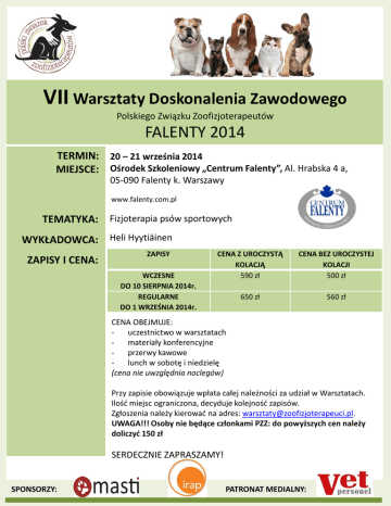 VII Warsztaty Doskonalenia Zawodowego Polskiego Związku Zoofizjoterapeutów FALENTY 2014 TERMIN: 20 – 21 września 2014 MIEJSCE: Ośrodek Szkoleniowy „Centrum Falenty”, Al. Hrabska 4 a, 05-090 Falenty k. Warszawy www.falenty.com.pl TEMATYKA: Fizjoterapia psów sportowych WYKŁADOWCA: Heli Hyytiäinen ZAPISY I CENA: ZAPISY WCZESNE DO 10 SIERPNIA 2014r. REGULARNE DO 1 WRZEŚNIA 2014r. CENA Z UROCZYSTĄ KOLACJĄ 590 zł CENA BEZ UROCZYSTEJ KOLACJI 500 zł 650 zł 560 zł CENA OBEJMUJE: uczestnictwo w warsztatach materiały konferencyjne przerwy kawowe lunch w sobotę i niedzielę (cena nie uwzględnia noclegów) Przy zapisie obowiązuje wpłata całej należności za udział w Warsztatach. Ilość miejsc ograniczona, decyduje kolejność zapisów. Zgłoszenia należy kierować na adres: [email protected]. UWAGA!!! Osoby nie będące członkami PZZ: do powyższych cen należy doliczyć 150 zł SERDECZNIE ZAPRASZAMY! SPONSORZY: PATRONAT MEDIALNY: VII Warsztaty Doskonalenia Zawodowego Polskiego Związku Zoofizjoterapeutów FALENTY 2014 PROGRAM SPONSORZY: 20 września (sobota): 10.00 – 11.15 Biomechanika różnych sportów kynologicznych (Heli Hyytiäinen) – wykład 11.15 – 11.30 przerwa kawowa 11.30 – 12.45 Biomechanika różnych dyscyplin sportów kynologicznych (Heli Hyytiäinen) cd. 12.45 – 13.45 przerwa na lunch 13.45 – 14.45 Zastosowanie metody Irap (ACS) w leczeniu kontuzji i chorób psów sportowych (lek. wet. Aneta Bocheńska) – wykład 14.45 – 15.00 przerwa kawowa 15.00 – 16.15 Badania i pomiary wykorzystywane w zoofizjoterapii – metody oraz ich zastosowanie w rehabilitacji psów sportowych (Heli Hyytiäinen) – wykład 16.15 – 16.30 przerwa kawowa 16.30 – 17.45 Badania i pomiary wykorzystywane w zoofizjoterapii – metody oraz ich zastosowanie w rehabilitacji psów sportowych (Heli Hyytiäinen) – ćwiczenia praktyczne PATRONAT MEDIALNY: VII Warsztaty Doskonalenia Zawodowego Polskiego Związku Zoofizjoterapeutów FALENTY 2014 PROGRAM SPONSORZY: 21 września (niedziela): 9.00 – 10.30 Najczęstsze urazy występujące u psów sportowych oraz ich fizjoterapia (Heli Hyytiäinen) – wykład 10.30 – 10.45 przerwa kawowa 10.45 – 11.45 Najczęstsze urazy występujące u psów sportowych oraz ich fizjoterapia (Heli Hyytiäinen) cd. 11.45 – 12.30 Wykorzystanie leczniczych posłań z naturalną łuską gryczaną u pacjentów poddawanych rehabilitacji (Firma Masti) 12.30 – 13.30 przerwa na lunch 13.30 – 14.45 Ćwiczenia terapeutyczne psów sportowych (Heli Hyytiäinen) – ćwiczenia praktyczne 14.45 – 15.00 przerwa kawowa 15.00 – 16.15 Ćwiczenia terapeutyczne psów sportowych (Heli Hyytiäinen) cd. 16.15 Zakończenie Warsztatów PATRONAT MEDIALNY: