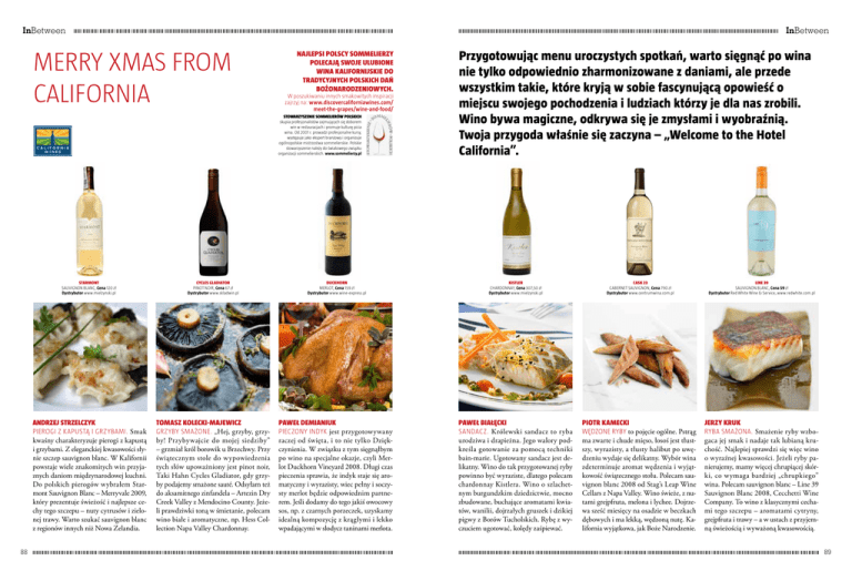 InBetween InBetween merry xmas from california Najlepsi polscy sommelierzy polecają swoje ulubione wina kalifornijskie do tradycyjnych polskich dań bożonarodzeniowych. W poszukiwaniu innych smakowitych inspiracji zajrzyj na: www.discovercaliforniawines.com/ meet-the-grapes/wine-and-food/ Stowarzyszenie sommelierów polskich skupia profesjonalistów zajmujących się doborem win w restauracjach i promuje kulturę picia wina. Od 2001 r. prowadzi profesjonalne kursy, występuje jako ekspert branżowy i organizuje ogólnopolskie mistrzostwa sommelierskie. Polskie stowarzyszenie należy do światowego związku organizacji sommelierskich. www.sommelierzy.pl 88 Przygotowując menu uroczystych spotkań, warto sięgnąć po wina nie tylko odpowiednio zharmonizowane z daniami, ale przede wszystkim takie, które kryją w sobie fascynującą opowieść o miejscu swojego pochodzenia i ludziach którzy je dla nas zrobili. Wino bywa magiczne, odkrywa się je zmysłami i wyobraźnią. Twoja przygoda właśnie się zaczyna – „Welcome to the Hotel California”. starmont sauvignon blanc, Cena 120 zł Dystrybutor www.mielzynski.pl cycles gladiator pinot noir, Cena 67 zł Dystrybutor www.skladwin.pl duckhorn merlot, Cena 159 zł Dystrybutor www.wine-express.pl kistler Chardonnay, Cena 307,50 zł Dystrybutor www.mielzynski.pl cask 23 cabernet sauvignon, Cena 790 zł Dystrybutor www.centrumwina.com.pl Line 39 Sauvignon Blanc, Cena 59 zł Dystrybutor Red White Wine & Service, www.redwhite.com.pl ANDRZEJ STRZELCZYK Pierogi z kapustą i grzybami. Smak kwaśny charakteryzuje pierogi z kapustą i grzybami. Z eleganckiej kwasowości słynie szczep sauvignon blanc. W Kalifornii powstaje wiele znakomitych win przyjaznych daniom międzynarodowej kuchni. Do polskich pierogów wybrałem Starmont Sauvignon Blanc – Merryvale 2009, który prezentuje świeżość i najlepsze cechy tego szczepu – nuty cytrusów i zielonej trawy. Warto szukać sauvignon blanc z regionów innych niż Nowa Zelandia. Tomasz Kolecki-Majewicz Grzyby smażone. „Hej, grzyby, grzyby! Przybywajcie do mojej siedziby” – grzmiał król borowik u Brzechwy. Przy świątecznym stole do wypowiedzenia tych słów upoważniony jest pinot noir, Taki Hahn Cycles Gladiator, gdy grzyby podajemy smażone sauté. Odsyłam też do aksamitnego zinfandela – Artezin Dry Creek Valley z Mendocino County. Jeżeli prawdziwki toną w śmietanie, polecam wino białe i aromatyczne, np. Hess Collection Napa Valley Chardonnay. paweł Demianiuk Pieczony indyk jest przygotowywany raczej od święta, i to nie tylko Dziękczynienia. W związku z tym sięgnąłbym po wino na specjalne okazje, czyli Merlot Duckhorn Vineyard 2008. Długi czas pieczenia sprawia, że indyk staje się aromatyczny i wyrazisty, wiec pełny i soczysty merlot będzie odpowiednim partnerem. Jeśli dodamy do tego jakiś owocowy sos, np. z czarnych porzeczek, uzyskamy idealną kompozycję z krągłymi i lekko wpadającymi w słodycz taninami merlota. paweł Białęcki Sandacz. Królewski sandacz to ryba urodziwa i drapieżna. Jego walory podkreśla gotowanie za pomocą techniki bain-marie. Ugotowany sandacz jest delikatny. Wino do tak przygotowanej ryby powinno być wyraziste, dlatego polecam chardonnay Kistlera. Wino o szlachetnym burgundzkim dziedzictwie, mocno zbudowane, buchające aromatami kwiatów, wanilii, dojrzałych gruszek i dzikiej pigwy z Borów Tucholskich. Rybę z wyczuciem ugotować, kolędy zaśpiewać. piotr kamecki Wędzone ryby to pojęcie ogólne. Pstrąg ma zwarte i chude mięso, łosoś jest tłustszy, wyrazisty, a tłusty halibut po uwędzeniu wydaje się delikatny. Wybór wina zdeterminuje aromat wędzenia i wyjątkowość świątecznego stołu. Polecam sauvignon blanc 2008 od Stag’s Leap Wine Cellars z Napa Valley. Wino świeże, z nutami grejpfruta, melona i lychee. Dojrzewa sześć miesięcy na osadzie w beczkach dębowych i ma lekką, wędzoną nutę. Kalifornia wyjątkowa, jak Boże Narodzenie. jerzy kruk ryba smażona. Smażenie ryby wzbogaca jej smak i nadaje tak lubianą kruchość. Najlepiej sprawdzi się więc wino o wyraźnej kwasowości. Jeżeli ryby panierujemy, mamy więcej chrupiącej skórki, co wymaga bardziej „chrupkiego” wina. Polecam sauvignon blanc – Line 39 Sauvignon Blanc 2008, Cecchetti Wine Company. To wino z klasycznymi cechami tego szczepu – aromatami cytryny, grejpfruta i trawy – a w ustach z przyjemną świeżością i wyważoną kwasowością. 89