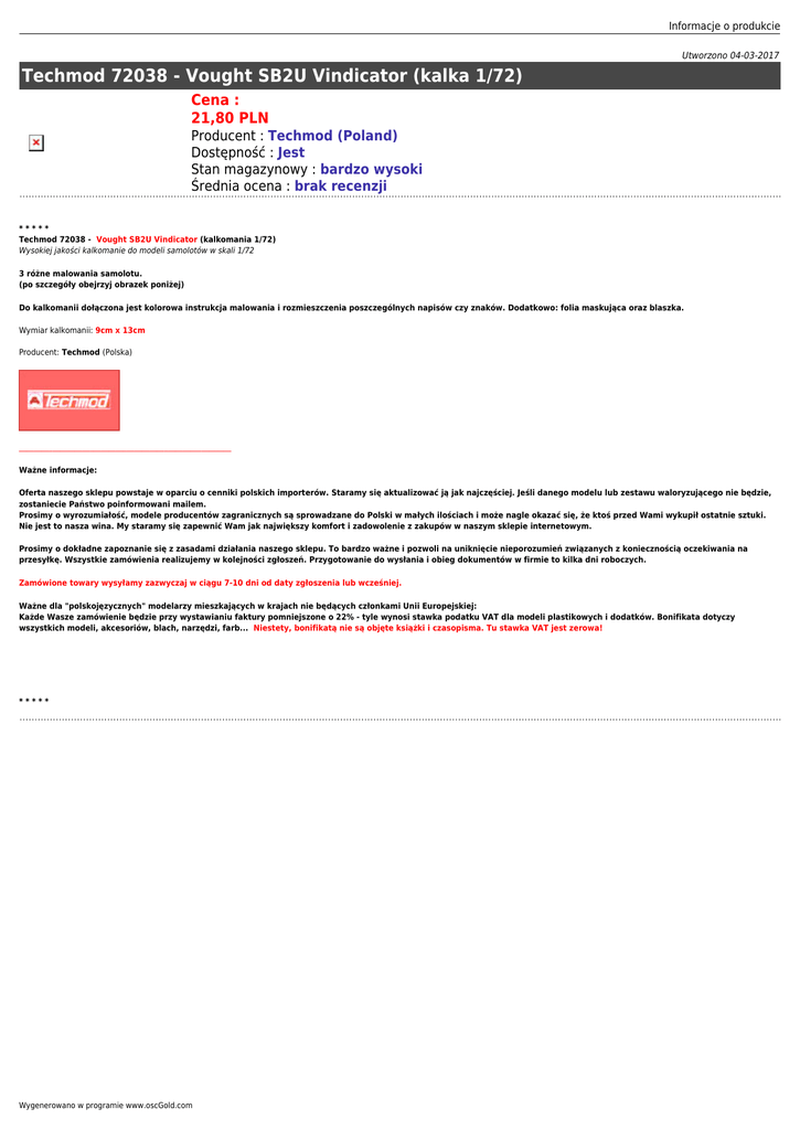 Informacje o produkcie Utworzono 04-03-2017 Techmod 72038 - Vought SB2U Vindicator (kalka 1/72) Cena : 21,80 PLN Producent : Techmod (Poland) Dostępność : Jest Stan magazynowy : bardzo wysoki Średnia ocena : brak recenzji ***** Techmod 72038 - Vought SB2U Vindicator (kalkomania 1/72) Wysokiej jakości kalkomanie do modeli samolotów w skali 1/72 3 różne malowania samolotu. (po szczegóły obejrzyj obrazek poniżej) Do kalkomanii dołączona jest kolorowa instrukcja malowania i rozmieszczenia poszczególnych napisów czy znaków. Dodatkowo: folia maskująca oraz blaszka. Wymiar kalkomanii: 9cm x 13cm Producent: Techmod (Polska) _________________________________________________________ Ważne informacje: Oferta naszego sklepu powstaje w oparciu o cenniki polskich importerów. Staramy się aktualizować ją jak najczęściej. Jeśli danego modelu lub zestawu waloryzującego nie będzie, zostaniecie Państwo poinformowani mailem. Prosimy o wyrozumiałość, modele producentów zagranicznych są sprowadzane do Polski w małych ilościach i może nagle okazać się, że ktoś przed Wami wykupił ostatnie sztuki. Nie jest to nasza wina. My staramy się zapewnić Wam jak największy komfort i zadowolenie z zakupów w naszym sklepie internetowym. Prosimy o dokładne zapoznanie się z zasadami działania naszego sklepu. To bardzo ważne i pozwoli na uniknięcie nieporozumień związanych z koniecznością oczekiwania na przesyłkę. Wszystkie zamówienia realizujemy w kolejności zgłoszeń. Przygotowanie do wysłania i obieg dokumentów w firmie to kilka dni roboczych. Zamówione towary wysyłamy zazwyczaj w ciągu 7-10 dni od daty zgłoszenia lub wcześniej. Ważne dla "polskojęzycznych" modelarzy mieszkających w krajach nie będących członkami Unii Europejskiej: Każde Wasze zamówienie będzie przy wystawianiu faktury pomniejszone o 22% - tyle wynosi stawka podatku VAT dla modeli plastikowych i dodatków. Bonifikata dotyczy wszystkich modeli, akcesoriów, blach, narzędzi, farb... Niestety, bonifikatą nie są objęte książki i czasopisma. Tu stawka VAT jest zerowa! ***** Wygenerowano w programie www.oscGold.com