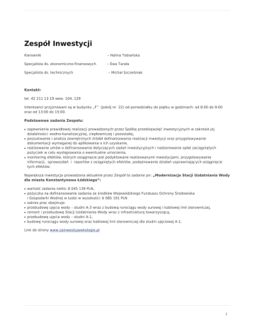 Zespół Inwestycji Kierownik – Halina Tobiańska Specjalista ds. ekonomiczno-finansowych – Ewa Tarała Specjalista ds. technicznych – Michał Szcześniak Kontakt: tel. 42 211 13 19 wew. 104, 129 Interesanci przyjmowani są w budynku „F” (pokój nr 22) od poniedziałku do piątku w godzinach: od 8:00 do 9:00 oraz od 13:00 do 15:00. Podstawowe zadania Zespołu: ● ● ● ● zapewnienie prawidłowej realizacji prowadzonych przez Spółkę przedsięwzięć inwestycyjnych w zakresie jej działalności: wodno-kanalizacyjnej, ciepłowniczej i pozostałej, poszukiwanie i analiza zewnętrznych źródeł dofinansowania realizacji inwestycji oraz przygotowywanie dokumentacji wymaganej do aplikowania o ich uzyskanie, realizowanie umów o dofinansowanie dotyczących zadań inwestycyjnych i nadzorowanie spłat zaciągniętych pożyczek w celu występowania o ewentualne umorzenia, monitoring efektów, których osiągnięcie jest podyktowane realizowanymi inwestycjami, przygotowywanie informacji, sprawozdań i raportów z osiągniętych efektów, podejmowanie działań usprawniających osiągnięcie tych efektów. Największa inwestycja prowadzona aktualnie przez Zespół to zadanie pn: „Modernizacja Stacji Uzdatniania Wody dla miasta Konstantynowa Łódzkiego”: ● ● ● ● ● ● ● wartość zadania netto: 8 045 139 PLN, pożyczka na dofinansowanie zadania ze środków Wojewódzkiego Funduszu Ochrony Środowiska i Gospodarki Wodnej w Łodzi w wysokości: 6 085 191 PLN zakres prac obejmuje: przebudowę ujęcia wody – studni A-3 wraz z budową rurociągu wody surowej i kablowej linii sterowniczej, remont i przebudowę Stacji Uzdatniania Wody wraz z infrastrukturą towarzyszącą, przebudowę ujęcia wody – studni A-1, budowę rurociągu wody surowej oraz kablowej linii sterowniczej dla studni ujęciowej A-1. Link do strony www.zainwestujwekologie.pl 1