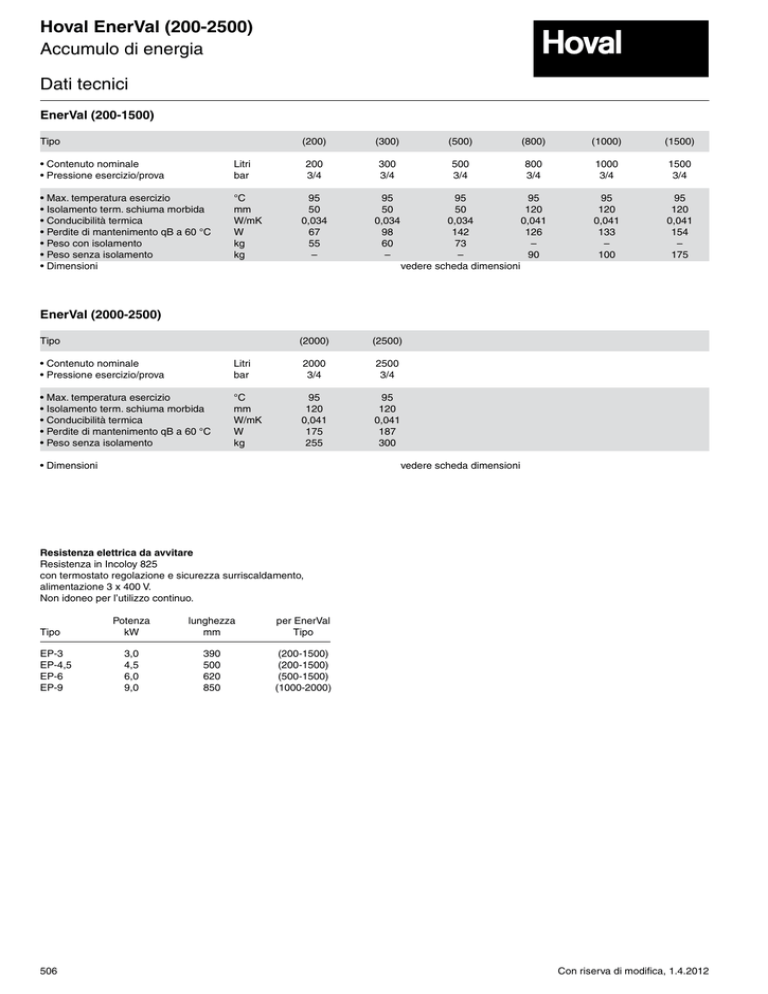Hoval EnerVal (200-2500) Accumulo di energia Dati tecnici EnerVal (200-1500) Tipo (200) (300) (500) (800) • Contenuto nominale Litri 200 300 500 800 • Pressione esercizio/prova bar 3/4 3/4 3/4 3/4 • Max. temperatura esercizio °C 95 95 95 95 • Isolamento term. schiuma morbida mm 50 50 50 120 • Conducibilità termica W/mK 0,034 0,034 0,034 0,041 • Perdite di mantenimento qB a 60 °C W 67 98 142 126 • Peso con isolamento kg 55 60 73 – • Peso senza isolamento kg – – – 90 • Dimensioni vedere scheda dimensioni (1000) (1500) 1000 3/4 1500 3/4 95 120 0,041 133 – 100 95 120 0,041 154 – 175 EnerVal (2000-2500) Tipo (2000) (2500) • Contenuto nominale Litri 2000 2500 • Pressione esercizio/prova bar 3/4 3/4 • Max. temperatura esercizio °C 95 95 • Isolamento term. schiuma morbida mm 120 120 • Conducibilità termica W/mK 0,041 0,041 • Perdite di mantenimento qB a 60 °C W 175 187 • Peso senza isolamento kg 255 300 • Dimensioni vedere scheda dimensioni Resistenza elettrica da avvitare Resistenza in Incoloy 825 con termostato regolazione e sicurezza surriscaldamento, alimentazione 3 x 400 V. Non idoneo per l’utilizzo continuo. Tipo EP-3 EP-4,5 EP-6 EP-9 506 Potenza kW lunghezza mm per EnerVal Tipo 3,0 4,5 6,0 9,0 390 500 620 850 (200-1500) (200-1500) (500-1500) (1000-2000) Con riserva di modifica, 1.4.2012 Hoval EnerVal (200-2500) Accumulo di energia Dimensioni EnerVal (200,300) EnerVal (500) (Tutte le misure sono in mm) (Tutte le misure sono in mm) L1 K M N O H P F J L2 D I E 1 2 3 4 5 Attacchi riscaldamento Rp 1½" Raccordo resistenza elettrica filettata Rp 1½" (il posizionamento dipende dal sistema, vedere schemi idraulici) Manicotto per pozzetto, termostato o termometro Rp ½" Canale ad immersione per sonda bollitore. Solo EnerVal (300) ' G 5 Per tolleranze di produzione ci possono essere delle variazione di dimensioni pari a +/- 10mm Lunghezza di tutti i manicotti: 50 mm EnerVal Tipo L1 L2 a b c d D e f g h j k l m altezza di ribaltamento (200) (300) (500) 350 550 - 450 600 - 152 152 127 300 300 220 720 890 945 480 480 597 600 600 700 1140 1479 1670 250 971 1440 1780 1900 1400 1571 1671 1771 1460 1795 1925 Con riserva di modifica, 1.4.2012 507 Hoval EnerVal (200-2500) Accumulo di energia Dimensioni EnerVal (800-2000) (Tutte le misure sono in mm) P Q K N O H F F E G ' D I J M 1 2 3 Attacchi riscaldamento Tipo (800,1000) Rp 1½" Tipo (1500,2000) Rp 2" Raccordo per resistenza elettrica filettata Rp 1½" Manicotto per pozzetto, termostato o termometro Rp ½" Per tolleranze di produzione ci possono essere delle variazione di dimensioni pari a +/- 10mm Lunghezza di tutti i manicotti: 120 mm EnerVal Tipo (800) (1000) (1500) (2000) 508 a b c c1 d D e f g h j k l m n altezza di ribaltamento 108 108 220 220 235 309 358 382 932 1006 1006 1030 1135 1209 1209 1230 790 790 985 1200 1030 1030 1225 1440 1497 1699 1699 1692 410 500 500 500 657 710 800 800 1845 2132 2142 2142 932 1006 1006 1030 1230 1300 1337 1230 1377 1454 1487 1478 1497 1699 1699 1692 1612 1882 1839 1839 1888 2171 2200 2200 Con riserva di modifica, 1.4.2012 Hoval EnerVal (200-2500) Accumulo di energia Dimensioni EnerVal (2500) D E F H K (Tutte le misure sono in mm) G ' 1 Attacchi riscaldamento Rp 3" 2 Manicotto per svuotamento Rp 1" 3 Manicotto per pozzetto, termostato o termometro Rp ½" Per tolleranze di produzione ci possono essere delle variazione di dimensioni pari a +/- 10mm Lunghezza di tutti i manicotti: 120 mm EnerVal Tipo a b c c1 d D e f g h j k l m n altezza di ribaltamento (2500) 435 900 1538 - 1200 1440 2003 - - 2465 - - - - - 2502 Con riserva di modifica, 1.4.2012 509 Hoval EnerVal (200-2500) Accumulo di energia Dimensioni Set collegamenti idraulici per accumulo di energia EnerVal (Tutte le misure sono in mm) Collegamento parallelo di due EnerVal (500-1000) EnerVal Tipo A (500) (800) 70 60 B D D1 R 270 260 597 750 797 950 180 216 Collegamento parallelo di due EnerVal (1500-2000) EnerVal Typ A B D D1 R Q (1500) (2000) 60 30 300 230 1000 1200 1240 1400 266 250 5° 8° Q Q Rappresentazione schematica del collegamento di due accumuli di energia EnerVal tramite il kit collegamenti idraulici Mandata Vorlauf al zur Heizung riscaldamento Mandata Vorlauf vomcaldaia Kessel dalla Dies ist ein unerlaubter Weg! Gehen Sie einen Schritt zurück oder löschen Sie dieses Shape! Sie haben die Möglichkeit ein neues Shape zu nehmen!!! hovhovalhovalhov a alhovalhovalhoval hovalhovalhovalh ovalhovalhovalho Accumulo Puffervalhovalhovalhov speicher b alhovalhovalhoval hovalhovalhovalh ovalhovalhovalho valhovalhovalhov alhovalhovalhoval hovalhovalhovalh ovalhovalhovalho valhovalhovalhov alhovalho VT157 510 Dies ist ein unerlaubter Weg! Gehen Sie einen Schritt zurück oder löschen Sie dieses Shape! Sie haben die Möglichkeit ein neues Shape zu nehmen!!! hovhovalhovalhov a alhovalhovalhoval hovalhovalhovalh ovalhovalhovalho Accumulo Puffervalhovalhovalhov speicher alhovalhovalhoval c b hovalhovalhovalh ovalhovalhovalho d valhovalhovalhov alhovalhovalhoval hovalhovalhovalh ovalhovalhovalho valhovalhovalhov alhovalho Mandata dalla caldaia Mandata al riscaldamento c d VT157 Con riserva di modifica, 1.4.2012