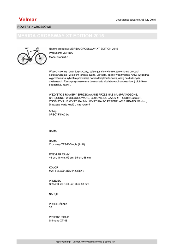 Velmar Utworzono: czwartek, 05 luty 2015 ROWERY > CROSSOWE MERIDA CROSSWAY XT EDITION 2015 Nazwa produktu: MERIDA CROSSWAY XT EDITION 2015 Producent: MERIDA Model produktu: - Wszechstronny rower turystyczny, spisujący się świetnie zarowno na drogach asfaltowych jak i w lekkim terenie. Duże, 28" koła, opony w rozmiarze 700C, wygodna, wyprostowana sylwetka pozwalają na bardziej komfortową jazdę na dłuższych dystansach. Ramy przystosowane do montażu dodatkowych akcesoriow ( błotnikow, bagażnika, nożki ). WSZYSTKIE ROWERY SPRZEDAWANE PRZEZ NAS SĄ SPRAWDZONE, SKRĘCONE I WYREGULOWANE, GOTOWE DO JAZDY !!! ODBIÓR OSOBISTY LUB WYSYŁKA 24h. WYSYŁKA PO PRZEDPŁACIE GRATIS !!! Dlaczego warto kupić u nas rower? SPECYFIKACJA RAMA RAMA Crossway TFS-D-Single (ALU) ROZMIAR RAMY 46 cm, 48 cm, 52 cm, 55 cm, 58 cm KOLOR MATT BLACK (DARK GREY) WIDELEC SR NCX lite E-RL air, skok 63 mm NAPĘD PRZEŁOŻENIA 30 PRZERZUTKA P Shimano XT-48 http://velmar.pl | [email protected] | | Strona 1/4 Velmar Utworzono: czwartek, 05 luty 2015 ROWERY > CROSSOWE MERIDA CROSSWAY XT EDITION 2015 PRZERZUTKA T Shimano XT-T MANETKA P/T Shimano XT KORBA Shimano XT 48-36-26 CG KASETA Shimano CS-HG62-10S 11-34 ŁAŃCUCH KMC Z10-10s KOŁA ROZMIAR KÓŁ 700C PIASTA P/T Shimano M435 cen/435 cen OBRĘCZE Merida comp Pro D SZPRYCHY Black stainless DĘTKI Ultralite OPONA P/T Merida Speed Lite 700x40 KV KOMPONENTY HAMULEC P/T Shimano T445 160 cen KIEROWNICA http://velmar.pl | [email protected] | | Strona 2/4 Velmar Utworzono: czwartek, 05 luty 2015 ROWERY > CROSSOWE MERIDA CROSSWAY XT EDITION 2015 MERIDA pro OS 620 R12 MOSTEK MERIDA pro OS 5 SIODŁO Cross Sport SZTYCA MERIDA pro H SB15 27.2 PEDAŁY Comfort Alloy triple Producent zastrzega możliwość zmiany specyfikacji bez uprzedzenia Paragon lub faktura VAT. TFS – TECHNO FORMING SYSTEM Produkcja giętych rur ze stopu RaceLite 6061 metodą mechanicznego tłoczenia rur na gorąco. RACELITE 6061 ALUMINIUM Niezwykle lekki i mocny stop używany w przemyśle lotniczym. MERIDA poddaje go dodatkowemu hartowaniu, tworząc podwojnie cieniowane lekkie i sztywne rury. SMOOTH WELDING Wygładzanie niektorych spawow za pomocą odpowiednich technik spawania – ulepszony wygląd bez pogorszenia struktury spawu. http://velmar.pl | [email protected] | | Strona 3/4 Velmar Utworzono: czwartek, 05 luty 2015 ROWERY > CROSSOWE MERIDA CROSSWAY XT EDITION 2015 K-MOUNT DROP-OUT Haki koł pozwalające zamocować hamulec tarczowy oraz podporkę przykręcaną na dwie śruby. Zintegrowana konstrukcja zapewnia optymalną sztywność podczas hamowania. REMOTE LOCKOUT Blokada amortyzatora przedniego lub tylnego za pomocą dźwigni na kierownicy. Pozwala na optymalny transfer energii w zależności od rodzaju nawierzchni i ukształtowania terenu. Cena: 4999.00zł Opcje dostępne dla MERIDA CROSSWAY XT EDITION 2015 : rozmiar ramy 48, 52, 55. Dostępność: Ten produkt został dodany do sklepu w dniu sobota, 31 styczeń 2015 http://velmar.pl | [email protected] | | Strona 4/4